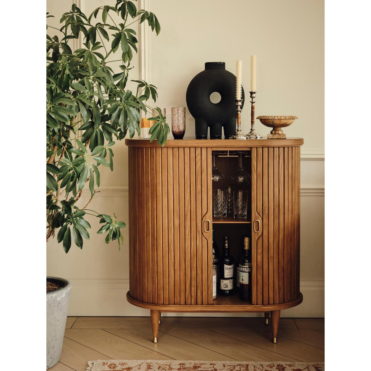 I’m a fan of this tambour bar for its compact footprint and warm oak fluting, which brings subtle texture without overwhelming a space. The dark marble top adds a touch of luxe and is tough enough for glassware or a statement lamp. It sits equally well in a mid-century modern living room, a pared-back Scandi scheme or even a more traditional dining area. To style it, keep the surface balanced - a sculptural vase or bowl either side of a low plant works nicely - and tuck your favourite spirits and glassware inside for neat, on-trend organisation.