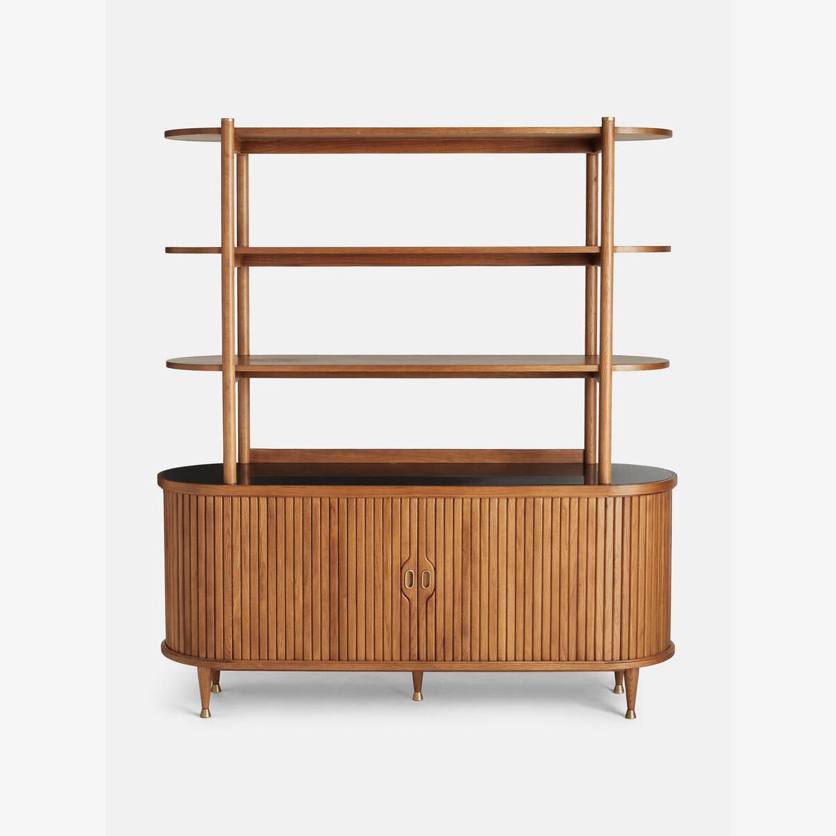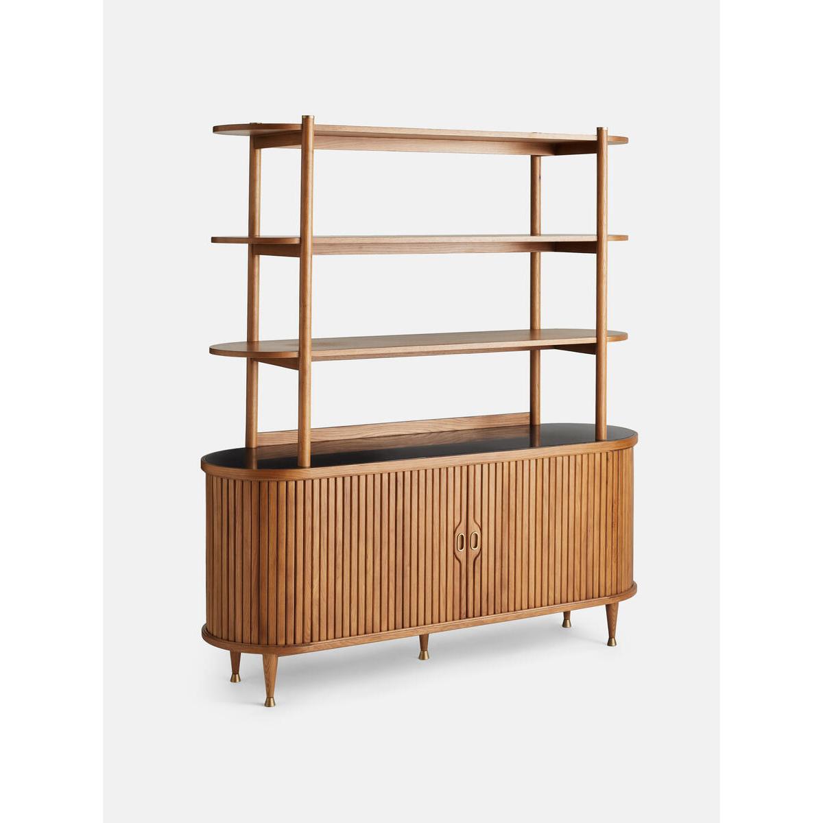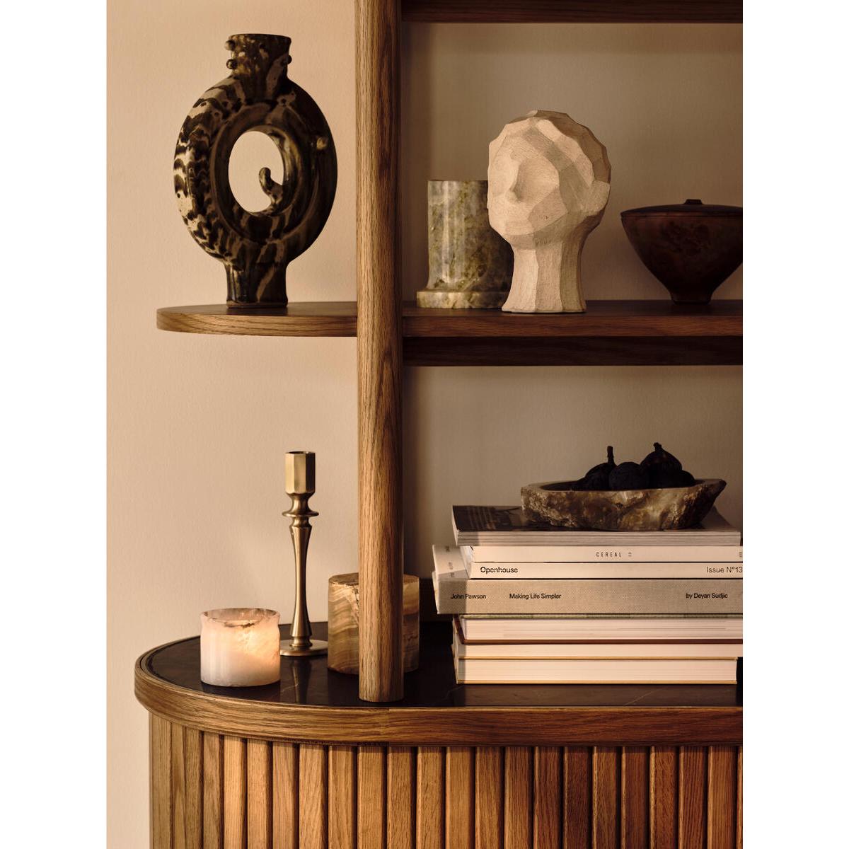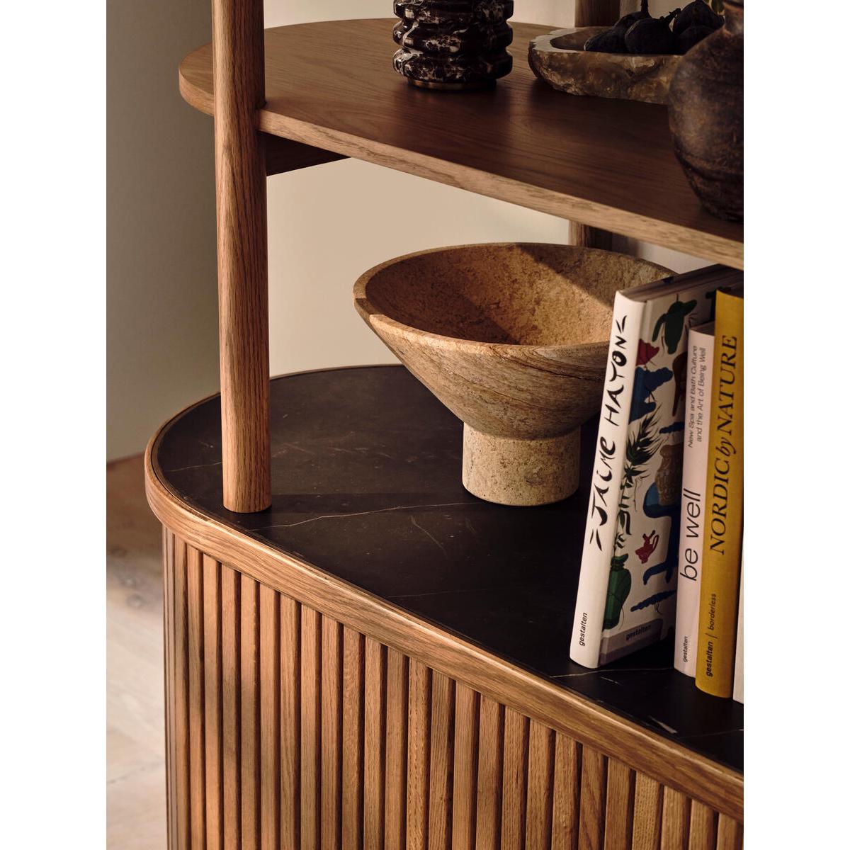 An extension of the Nora range, the Nora shelving unit offers a functional two-in-one design with display shelving for an artful curation of objects and books, plus a tambour door cabinet beneath. Taking its cues from the 1960s-inspired interiors of White City House, it's crafted from solid oak and features a Spanish black Marquina top and brass inlay. Real brass caps and feet complete this design with an all-round vintage feel. Solid oak shelving unit Tambour door cabinet Honed black Marquina and brass inlay top Marble sourced from Spain Real brass caps at top of shelving Real brass feet Inspired by White City House