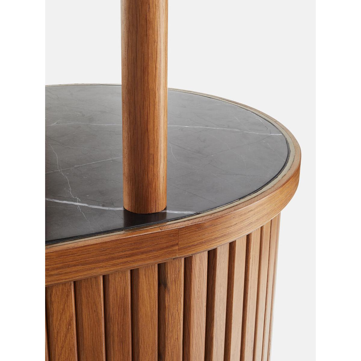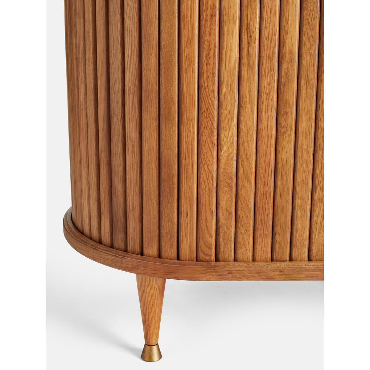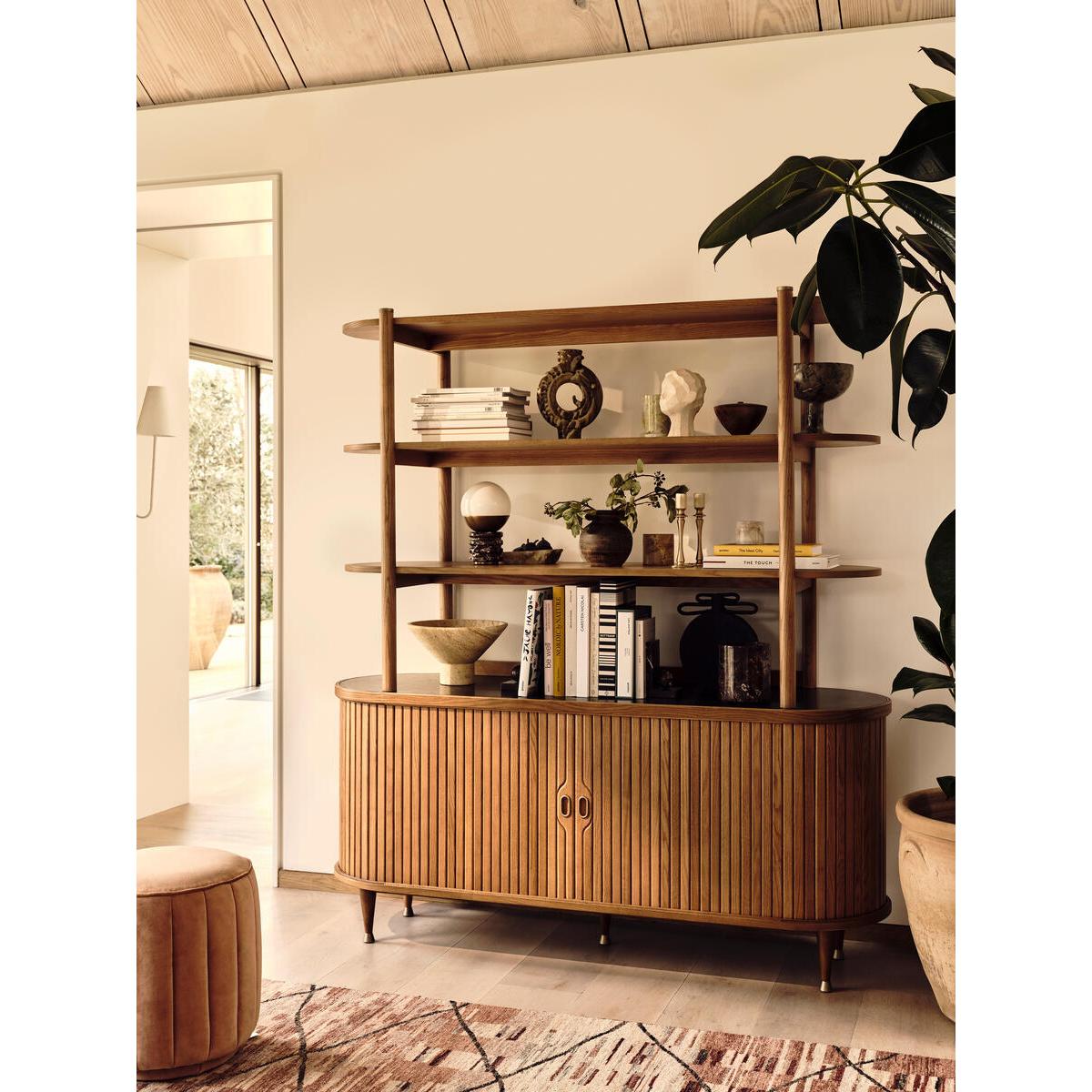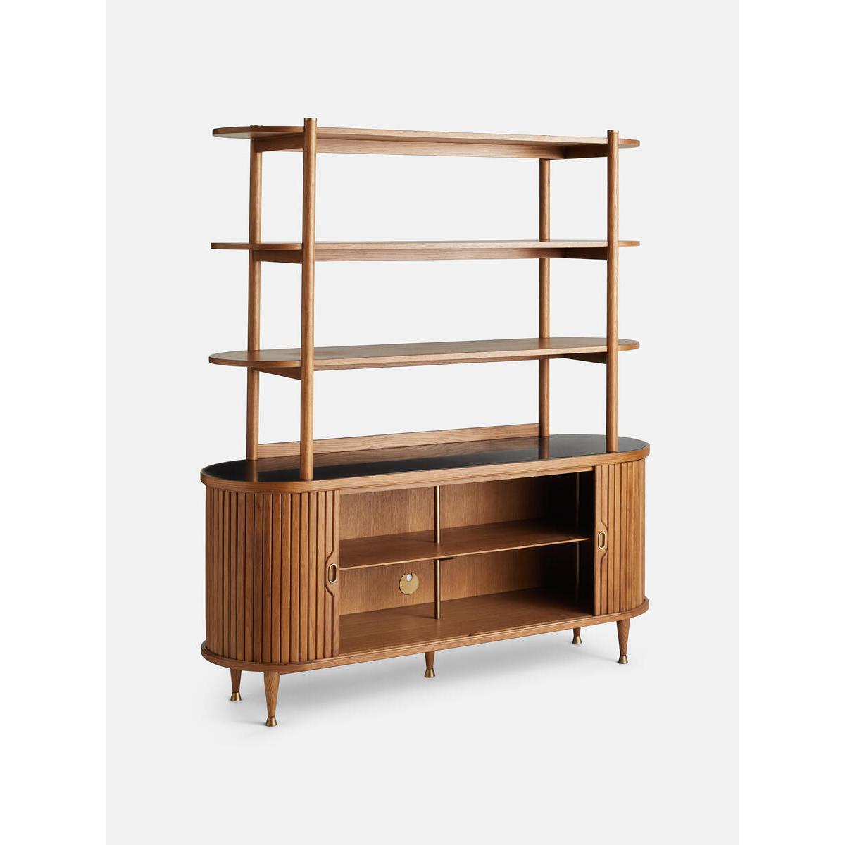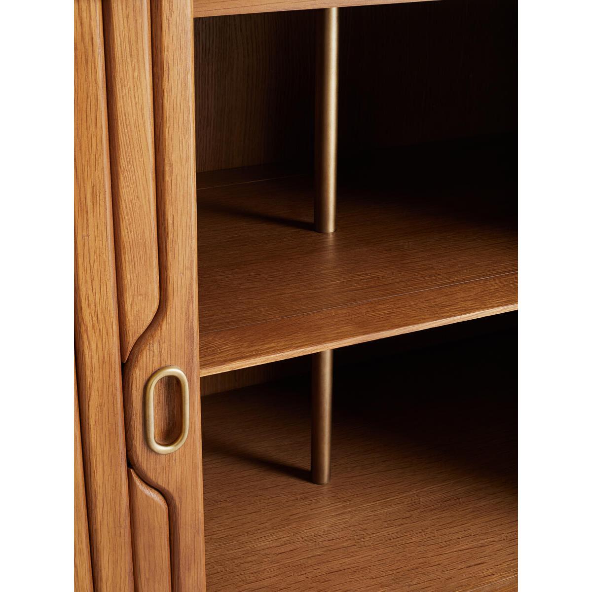 An extension of the Nora range, the Nora shelving unit offers a functional two-in-one design with display shelving for an artful curation of objects and books, plus a tambour door cabinet beneath. Taking its cues from the 1960s-inspired interiors of White City House, it's crafted from solid oak and features a Spanish black Marquina top and brass inlay. Real brass caps and feet complete this design with an all-round vintage feel. Solid oak shelving unit Tambour door cabinet Honed black Marquina and brass inlay top Marble sourced from Spain Real brass caps at top of shelving Real brass feet Inspired by White City House
