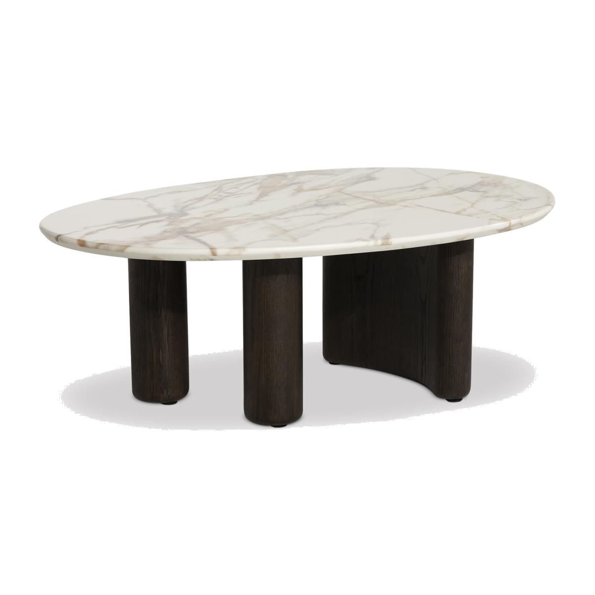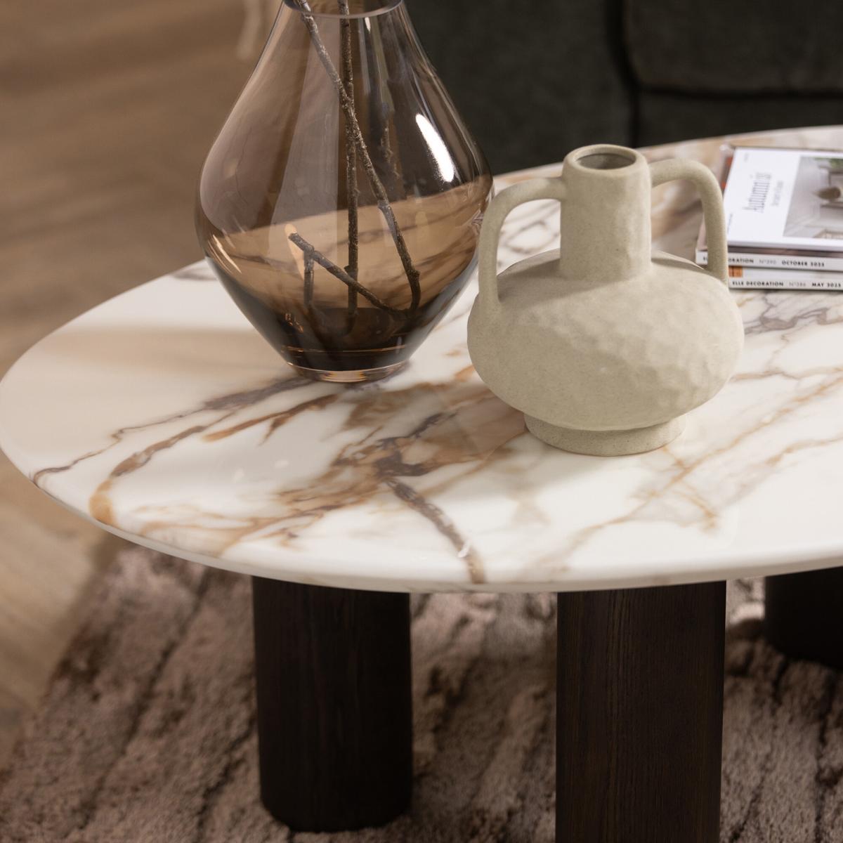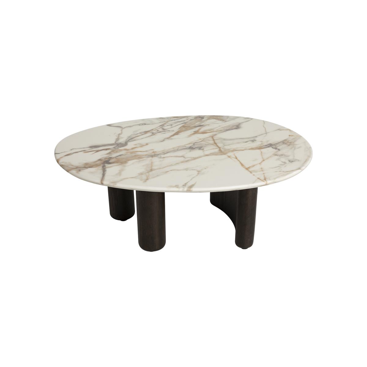 Bring elegance and modern charm to your space with this unique coffee table. Featuring a ceramic marble-effect top that’s both stylish and durable, it rests on three distinct brown MDF legs — one beautifully curved and two sleek cylindrical. The creative design adds an artistic touch while maintaining stability and function. Perfect for contemporary living rooms, this table effortlessly blends sophistication with everyday practicality, making it a standout centerpiece for your home.
