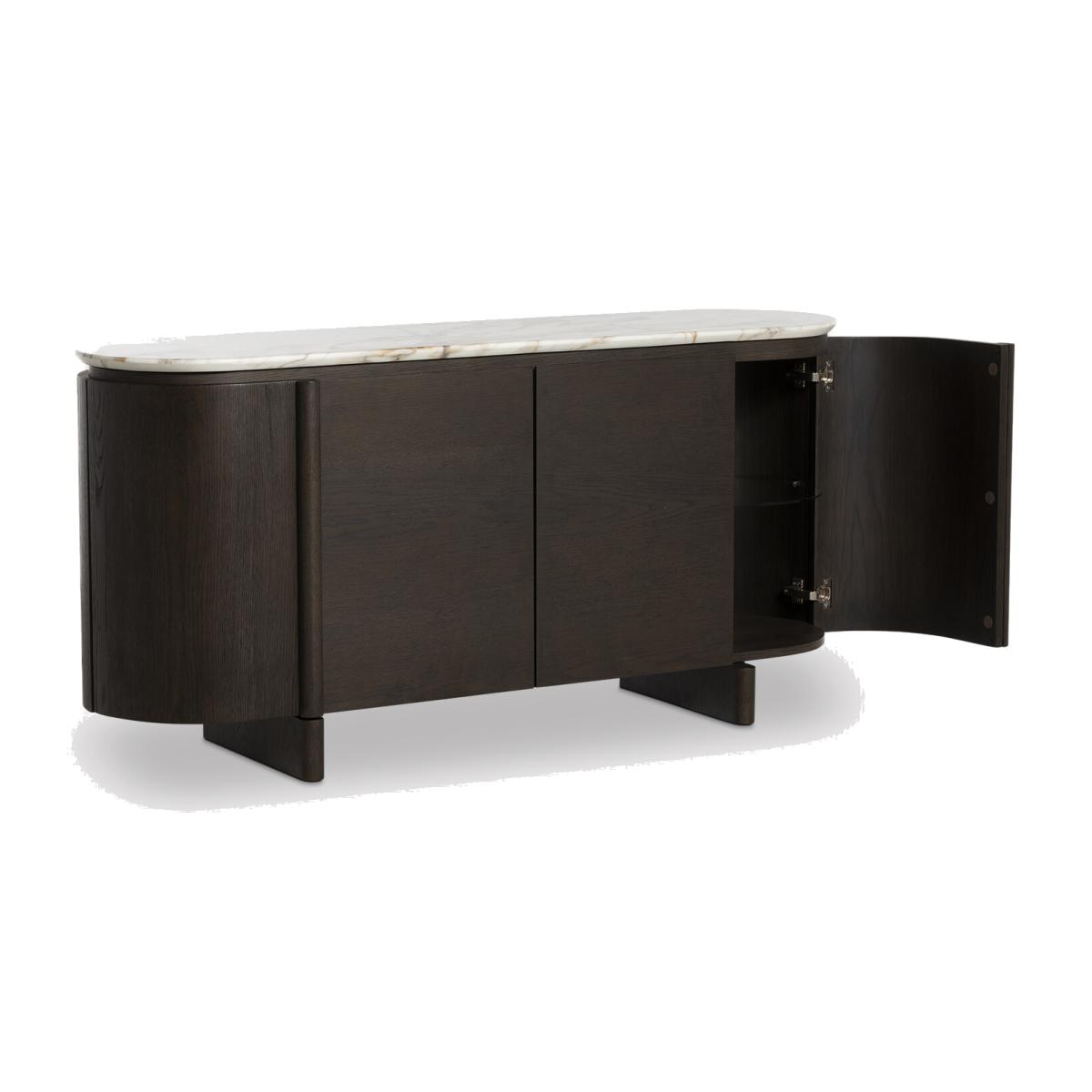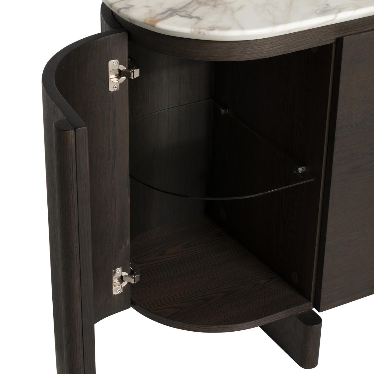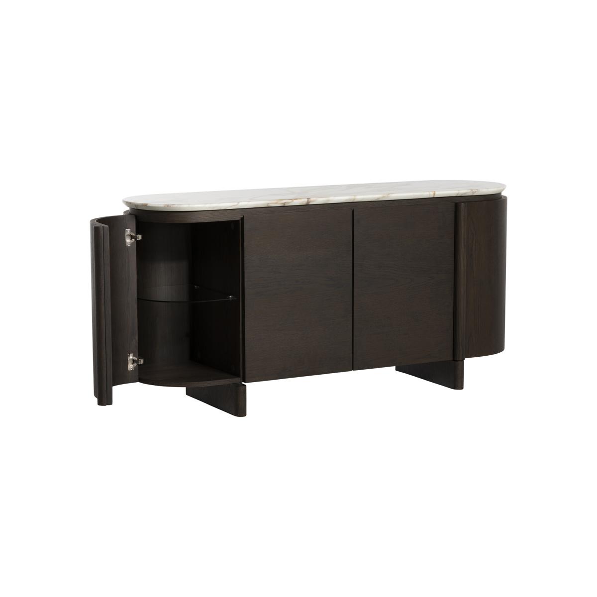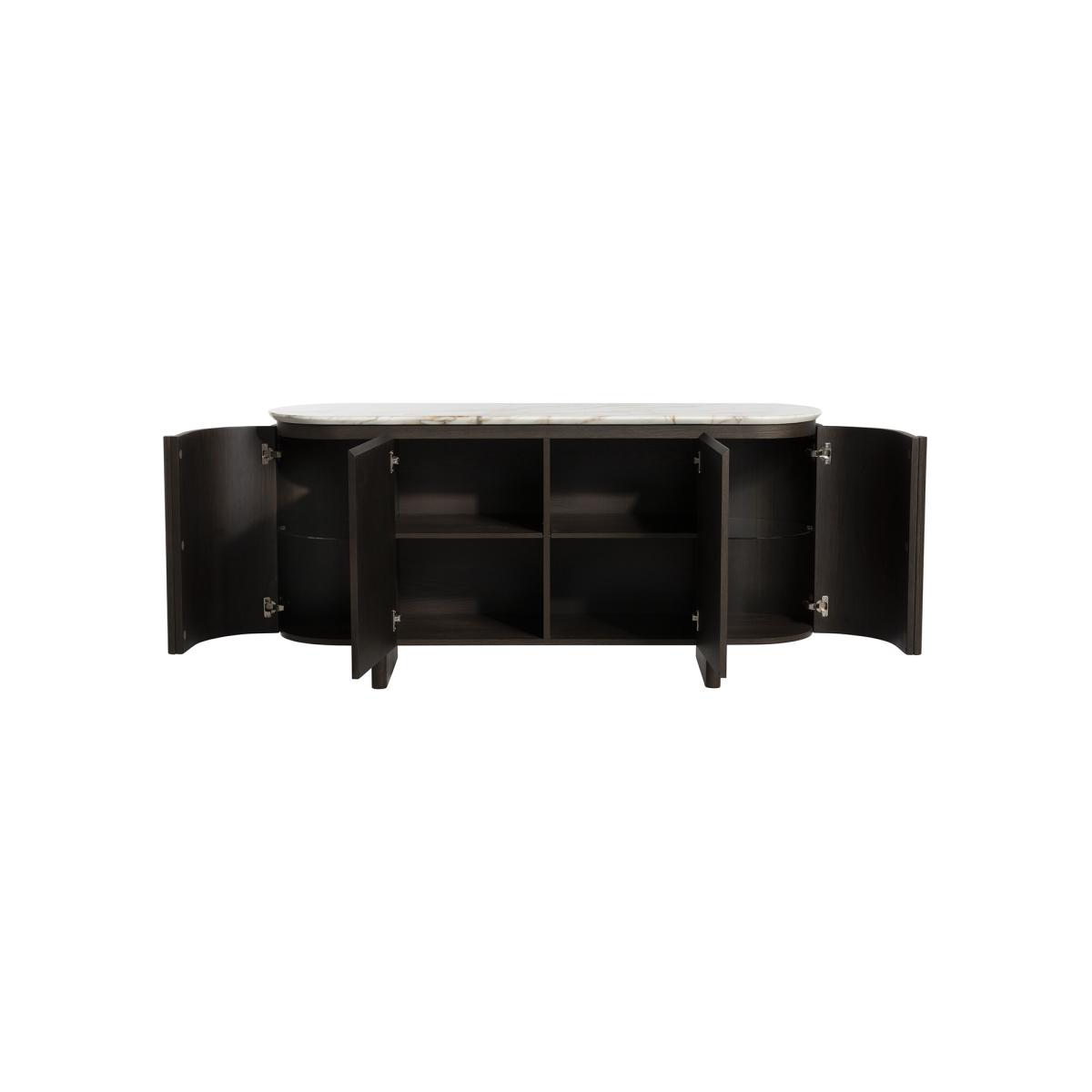 Add a touch of modern elegance to your home with this stunning 4-door sideboard. Featuring a sleek marble-effect ceramic top, dark engineered wooden body, and curved sides, it's both stylish and functional. Inside, six spacious compartments and glass side shelves offer ample storage and display space for tableware or decor. Perfect for dining or living areas, this sideboard blends contemporary design with everyday practicality; an eye-catching statement piece for any modern home