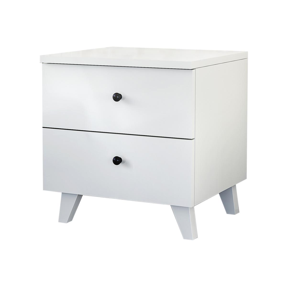 Two-drawer modern bedside table featuring two wide drawers for your folded clothes. Can be used in many rooms as a lamp table or a side unit. Delivered flat packed, assembly required.