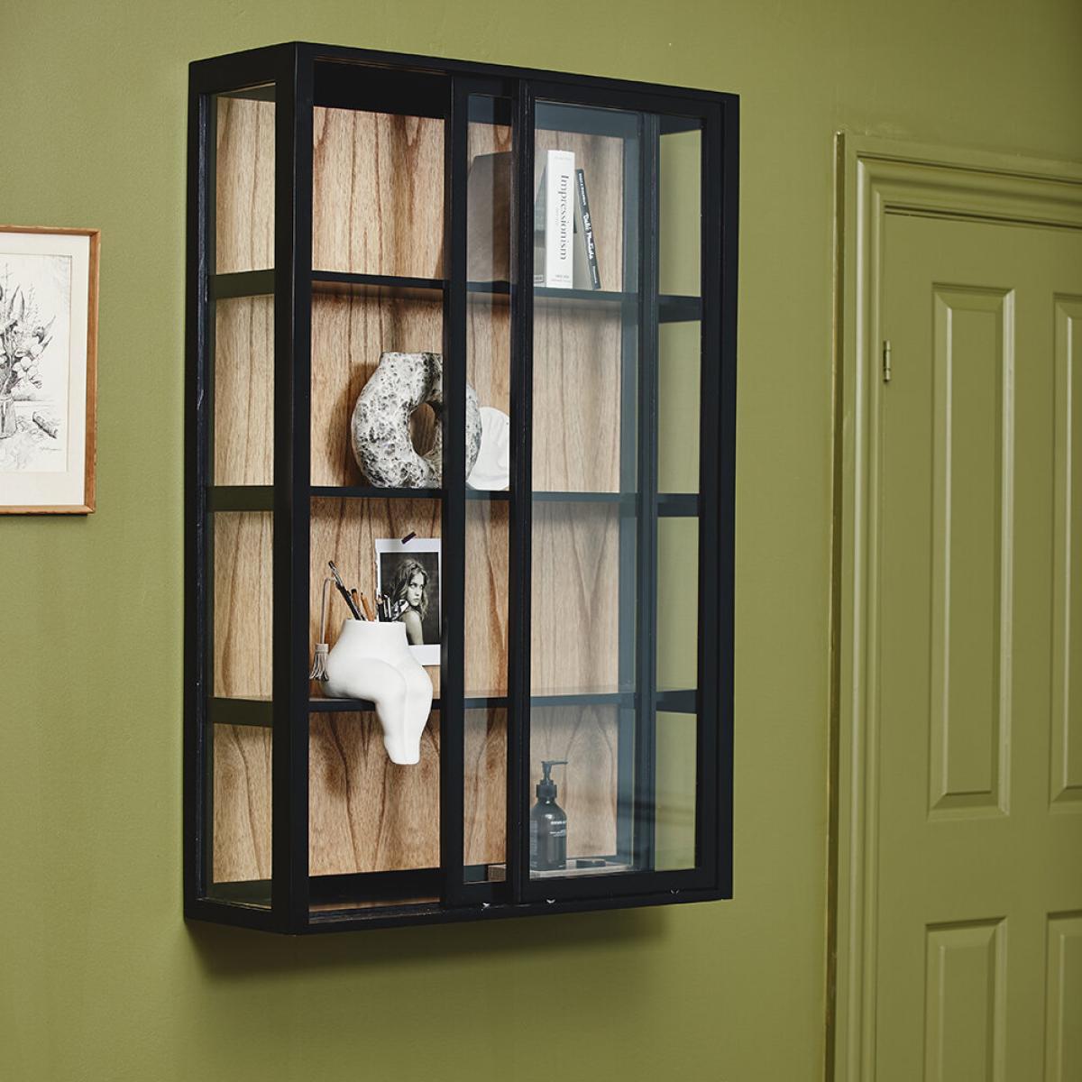 I love the Nordal Bel Wall Cabinet because of its sleek, modern design with a touch of warmth from the natural wood interior, which creates a lovely contrast with the black frame. It's versatile enough to work well in both contemporary and minimalist interiors, as well as more eclectic spaces where it can add a clean, structured element. When styling, consider using the sliding doors to keep clutter out of sight, while stacking decorative objects or books on the visible shelves for added interest. To keep the look balanced, pair it with other black or wood-toned pieces, and use lighting to highlight its clean lines and thoughtful design. This cabinet is perfect for displaying collectibles or essential items without sacrificing style or functionality.