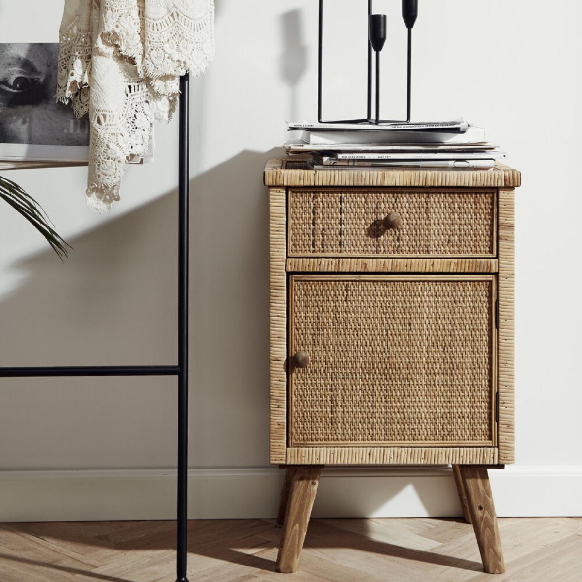 I love this little bedside table for its versatile and natural aesthetic. Its rattan finish gives it a relaxed, coastal, or boho vibe, making it a great addition to interiors that embrace natural materials and organic textures. It works well in cosy bedrooms, Scandinavian-inspired spaces, or even in a hallway as a multifunctional catch-all. Practical styling tips include adding a small lamp, a some favourite books, or a decorative tray on top to create a layered look. Its compact size makes it ideal for smaller spaces, while the neutral tone allows it to blend seamlessly with both light and darker colour schemes, making it a flexible piece for various interior styles.