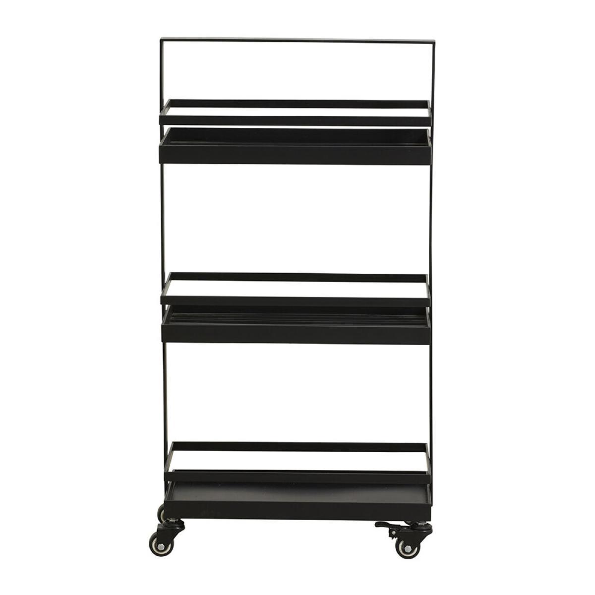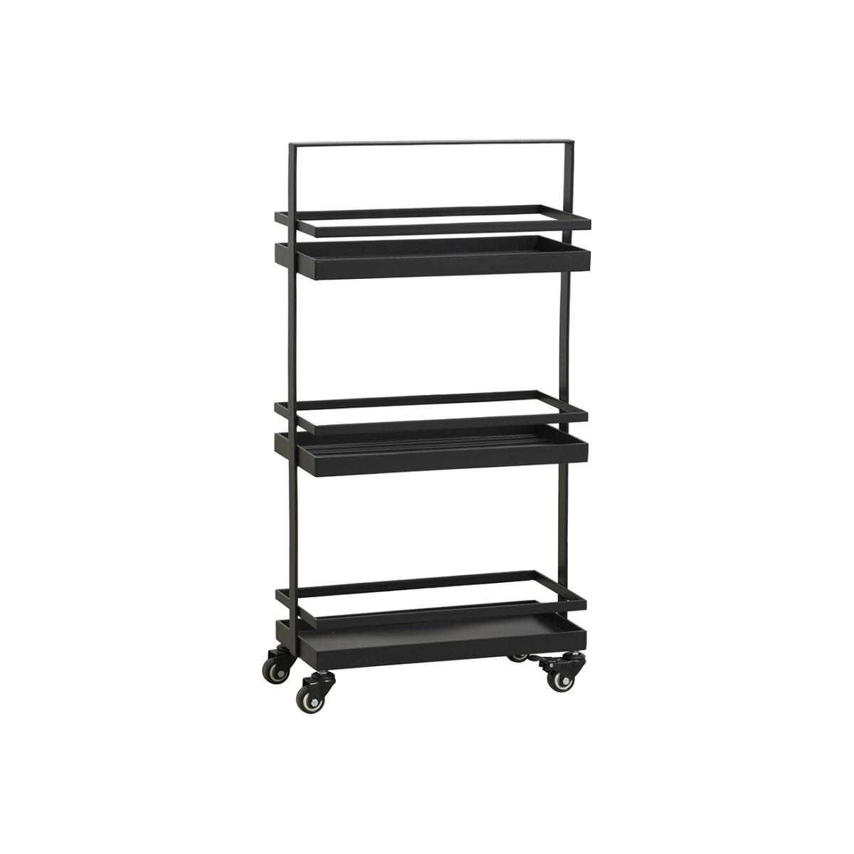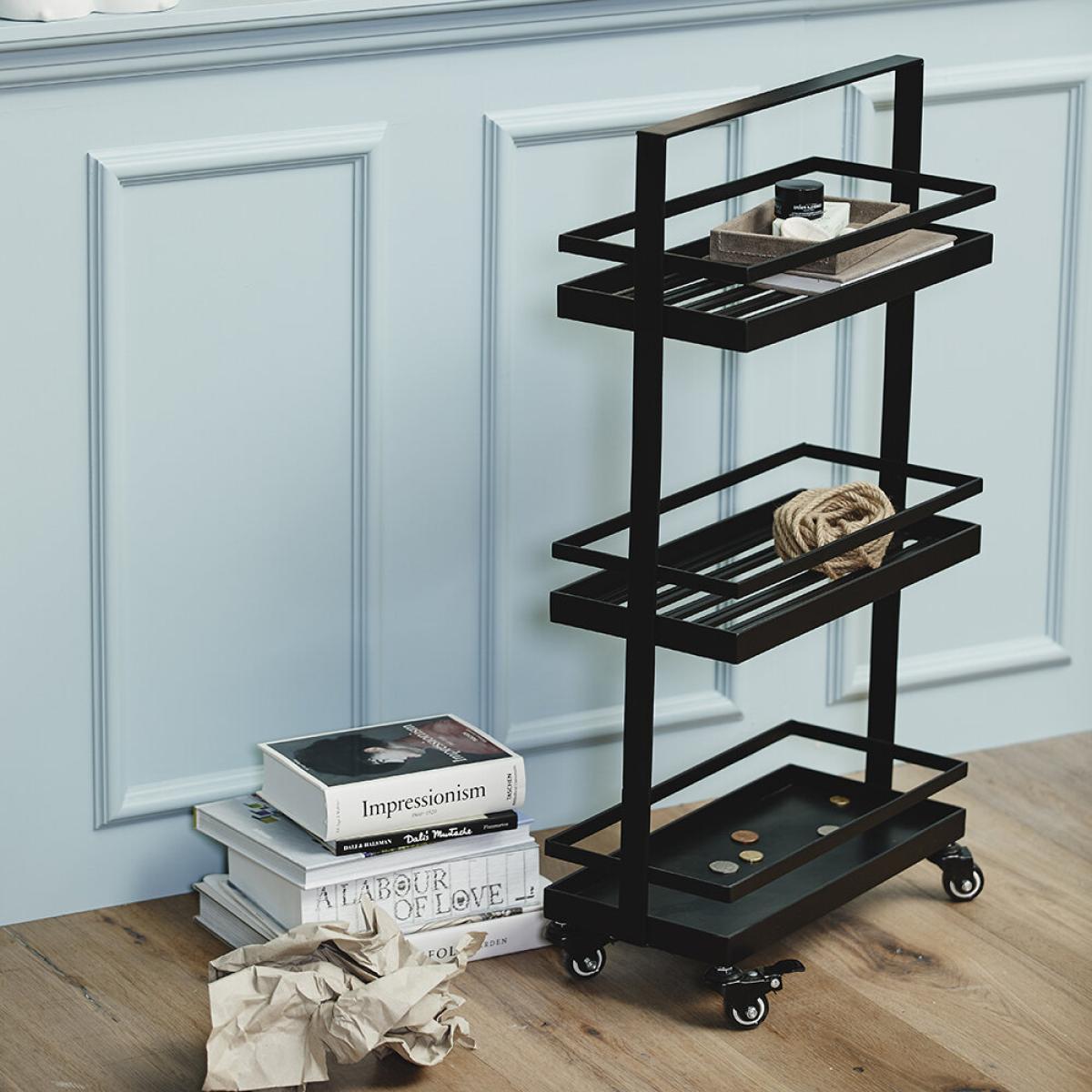 Keep your home organised with this Vollos Trolley from Nordal. A great storage solution for a contemporary kitchen, living room or bathroom. This modern design has wheels and a handle, so you move it around with ease. Key features: * Material: iron * Dimensions: H80.5xW20xL42cm * Max weight per shelf: 15kgs * Matt black colour * With wheels