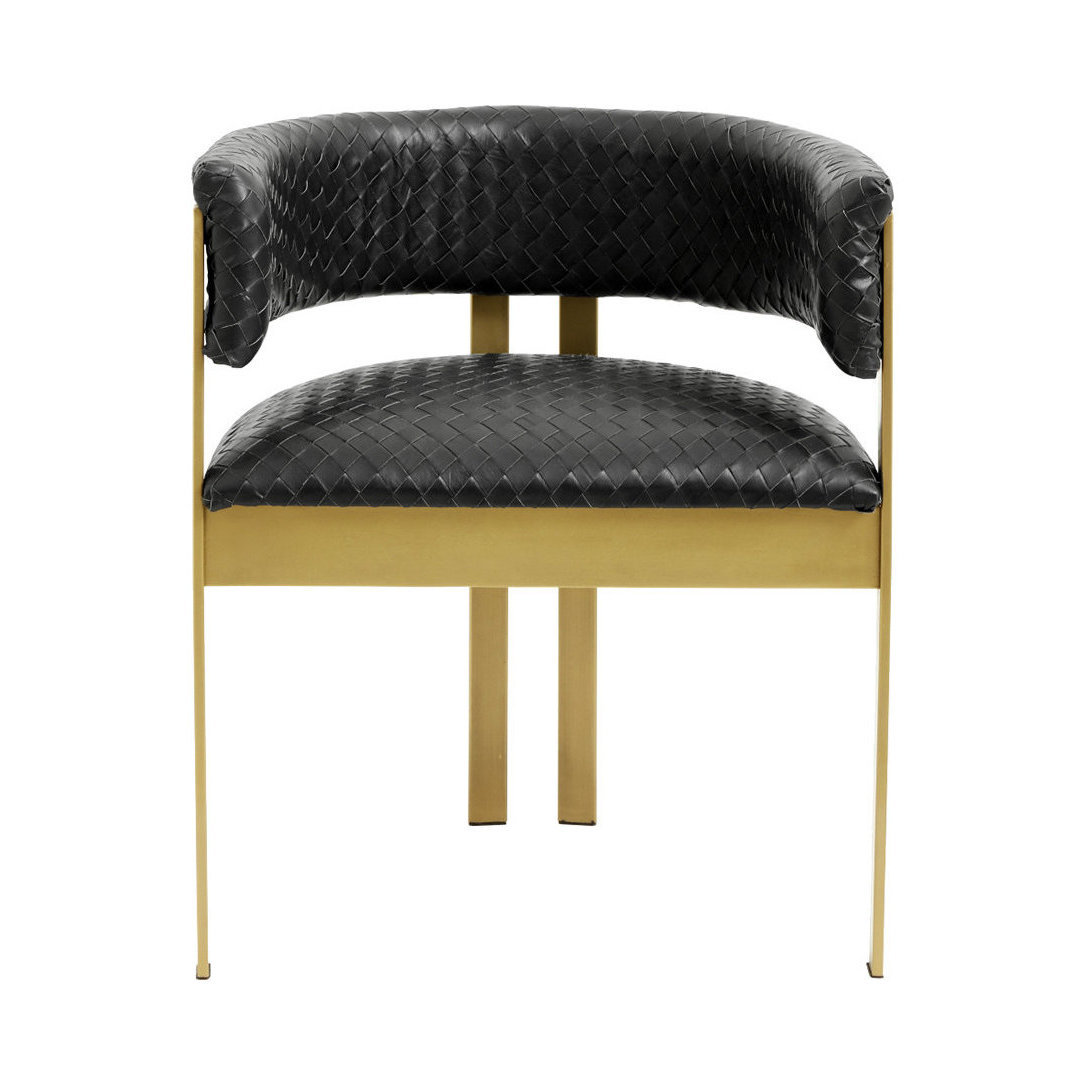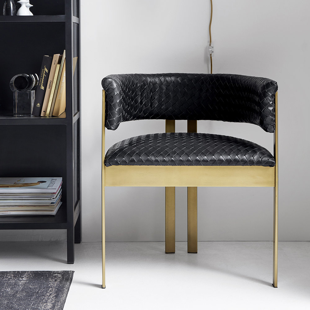 Make an occasion of any meal with this dining chair from Nordal. Featuring a strong gold coloured iron frame, the braided leather seat has been expertly made by hand and it features a comfortable cushioned backrest. Pair with more furniture from Nordal to complete the look. Key features: * Dining chair * Material: iron, buffalo leather * Dimensions: H72xW61xD52cm * Handmade leather seat * Braided finish * Gold coloured iron frame * More furniture available from Nordal