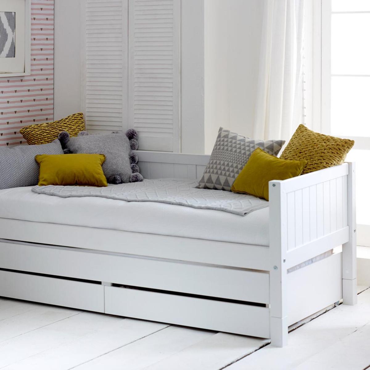 Thuka single bed with trundle bed and storage drawers all in one, ideal for a small room with drawers for bedding, ideal for sleep overs with the pull out bed, sleek design, modern looking finished in white on Scandinavian pine.