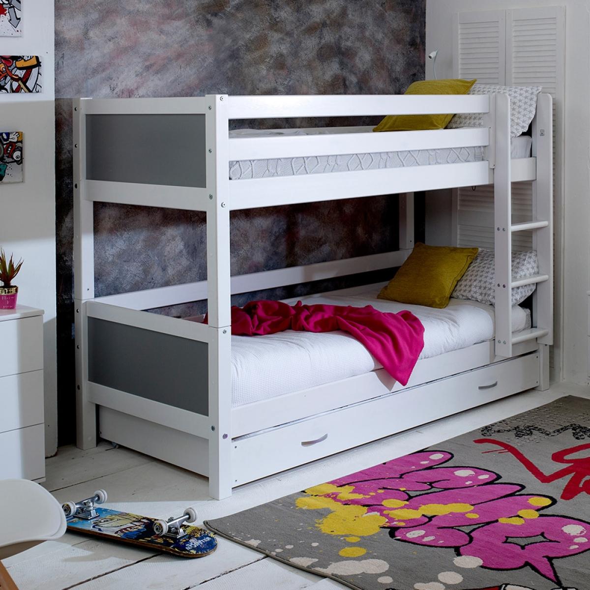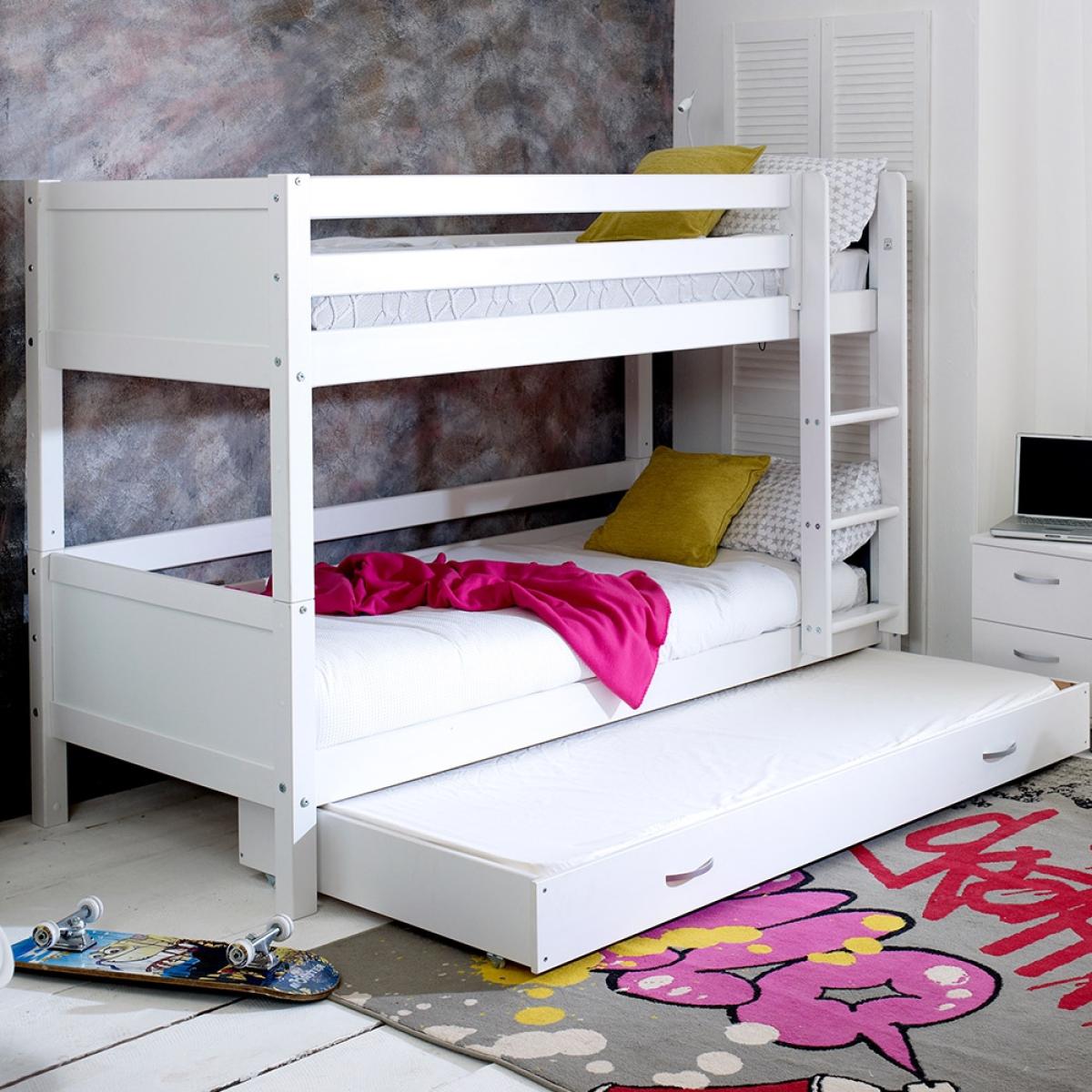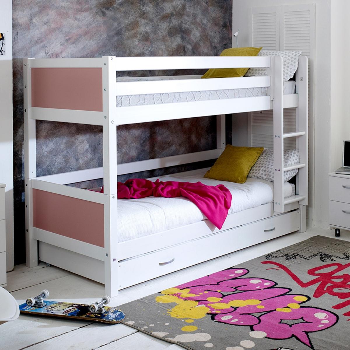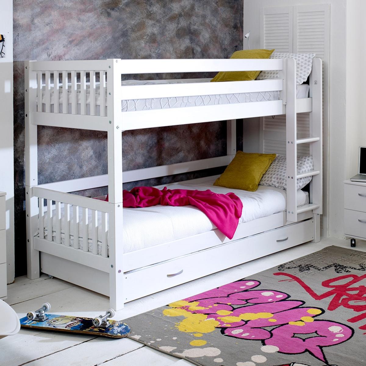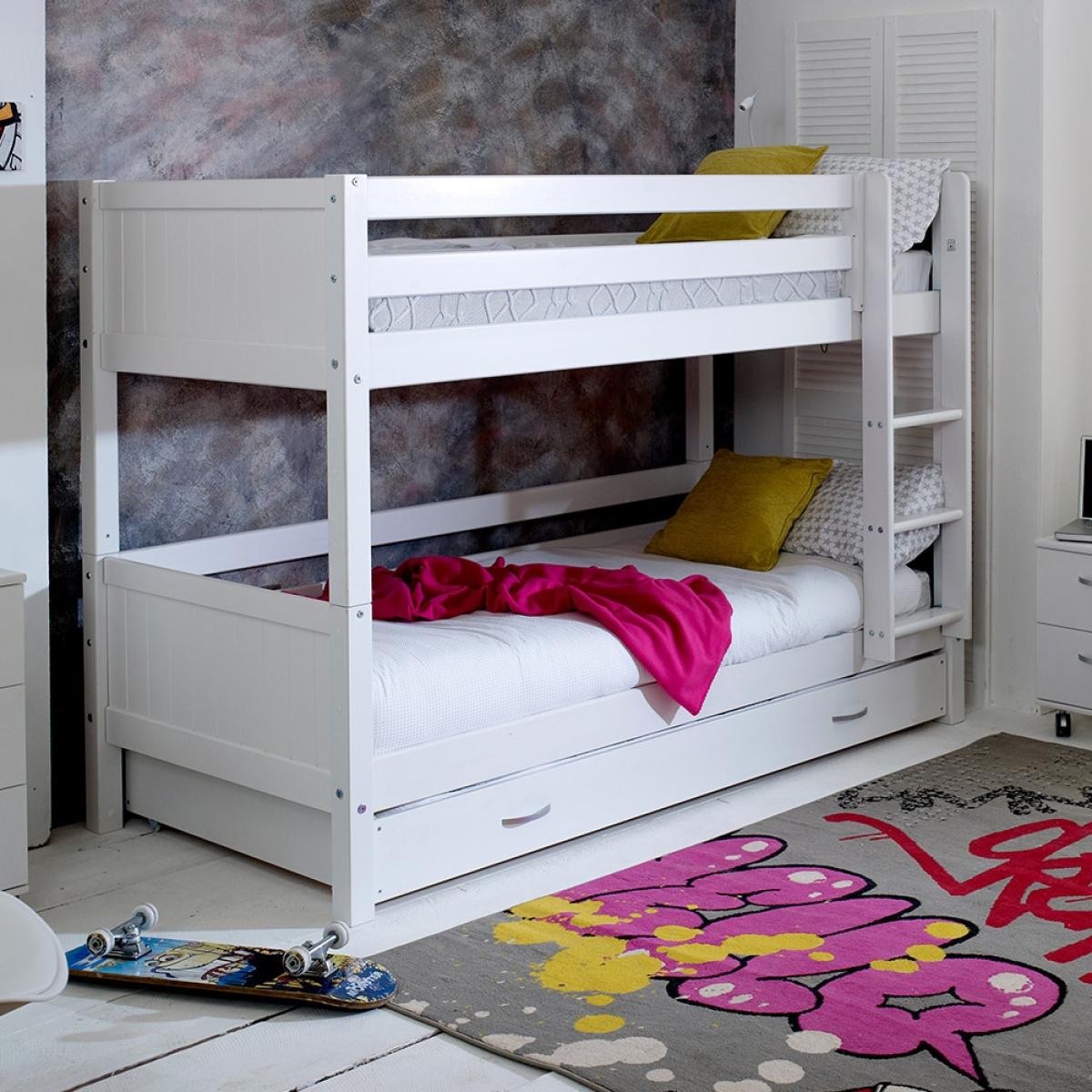 Give your kiddies more room to play with the Nordic Kids Bunk Bed 3, a wonderful option for cramped bedrooms. Manufactured from solid pine and MDF the fresh white colour will easily coordinate with any interior style and the great thing about this bed is that it can be converted into two single beds. Ideal for when your youngsters get a bit older! The trundle drawer beneath will be perfect when those sleepovers roll around! Now there's just the decision about who will be the lucky one to get the top bunk?!There is even the option to change the colour or design of the head and footboard so you can make your kiddies bed individual to them!.