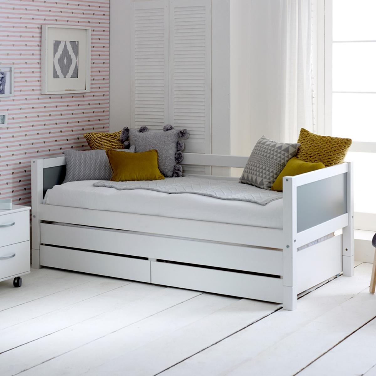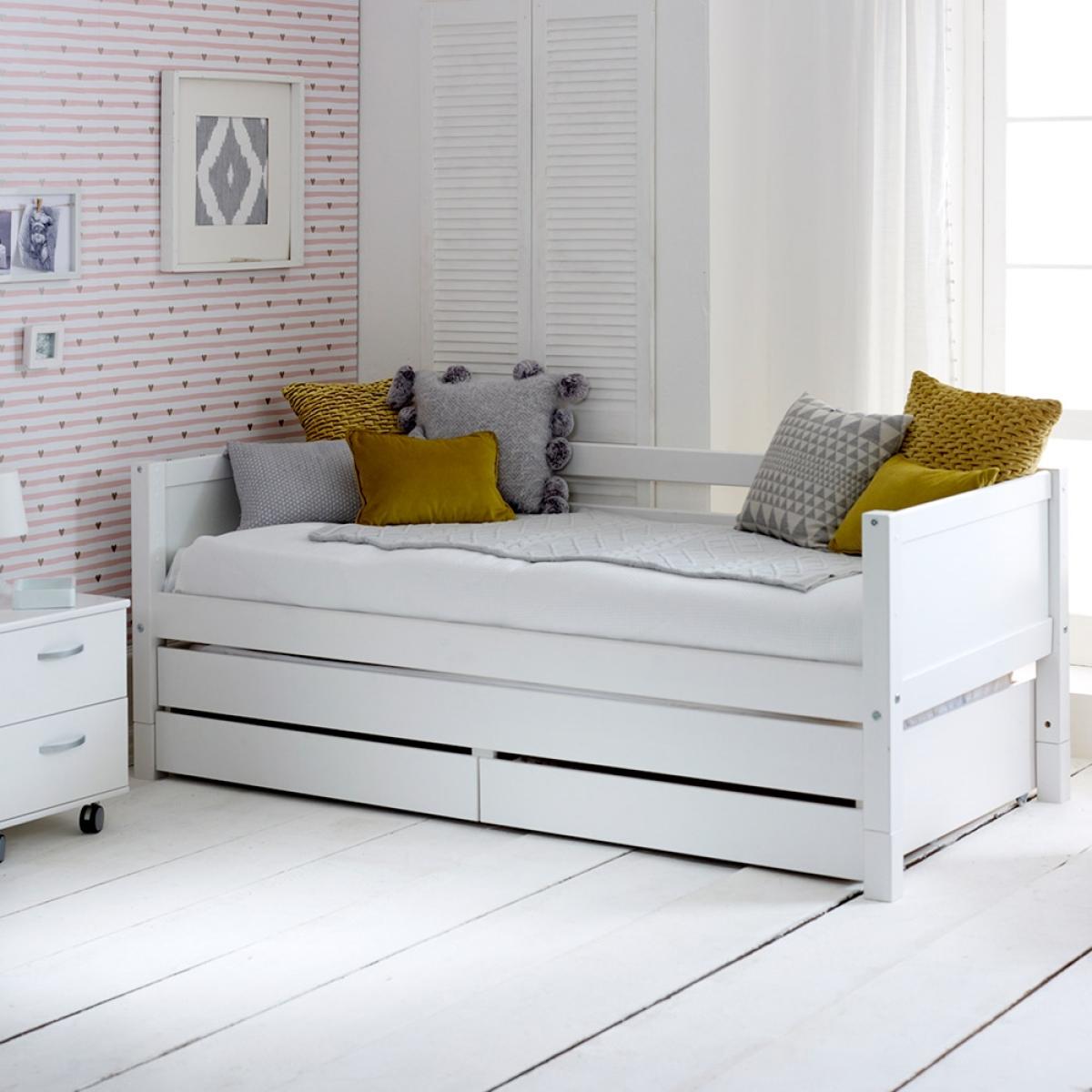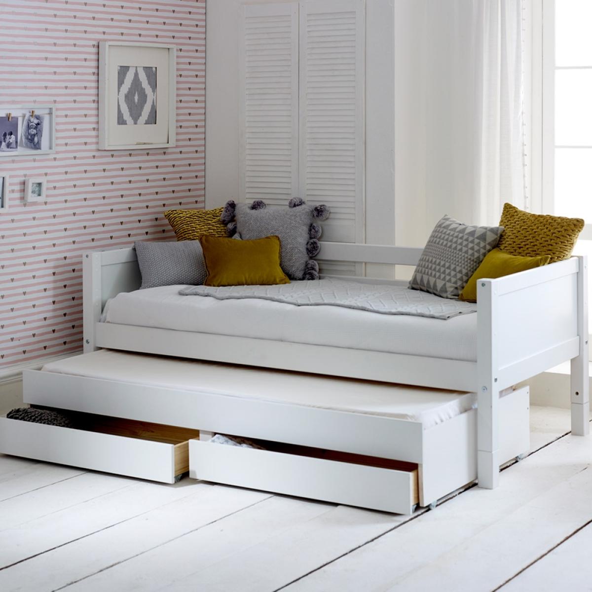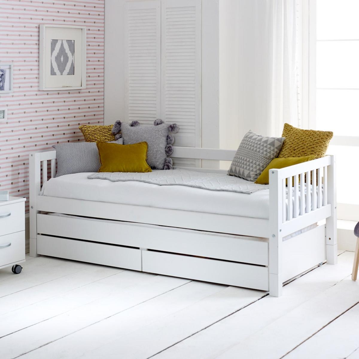 Pop a few cushions down and the Nordic Kids Trundle Bed with Drawers is a wonderful place to chill out and relax during the day, then at night a cosy place to sleep! Manufactured from solid pine and MDF the fresh white colour will easily coordinate with any interior style. The Flexa Nordic Trundle Bed with Storage is perfect for those sleepovers or just those unexpected guests and what's more there is also two drawers, ideal for extra storage space or to keep that spare bedding! This Trundle Bed with Drawers is a simple and practical addition to any bedroom!There is even the option to change the colour or design of the head and footboard so you can make your kiddies bed individual to them!.