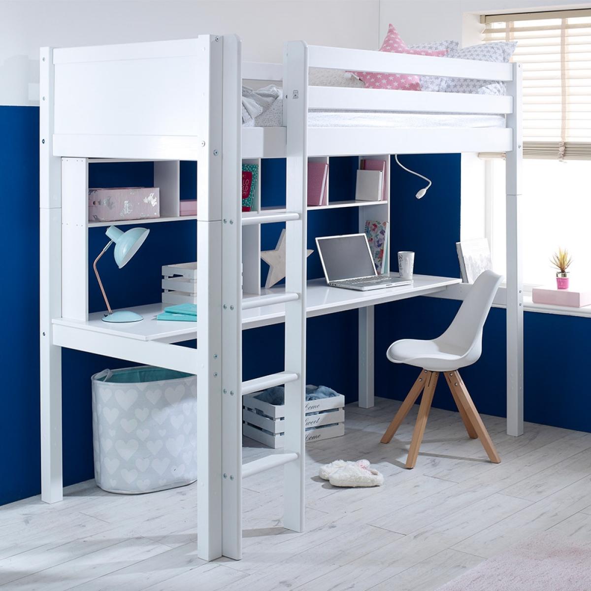 The perfect bed for any teenagers bedroom, the Nordic Kids High Sleeper 2 would be a welcome addition! Manufactured from solid pine and MDF the fresh white colour will easily coordinate with any interior style and will make the move from kiddies room to teen room that much easier! With a large desk beneath there will be plenty of space for your youngster to spread out when the time comes for that dreaded homework and the inclusion of shelves means they can keep all their bits and bobs tidy!There is even the option to change the colour or design of the head and footboard so you can make your kiddies bed individual to them!.