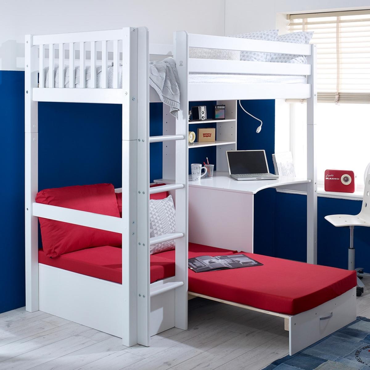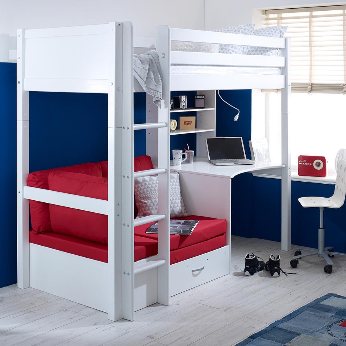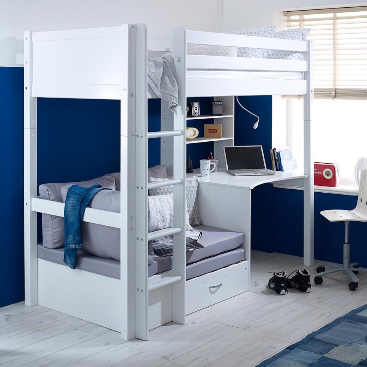 A great option for cramped bedrooms, the Nordic Kids High Sleeper 3 would be ideal for your teenager's bedroom. This bed not only offers up a place to sleep but also a place to work and a spot to max and relax, what more could you want? Manufactured from solid pine and MDF the fresh white colour will easily coordinate with any interior style and will make the move from kiddies room to teen room will be one easy task! With a desk beneath, it is the ideal homework set up and with the inclusion of a sofa bed, sleepovers just got that much easier!There is even the option to change the colour or design of the head and footboard so you can make your kiddies bed individual to them!.
