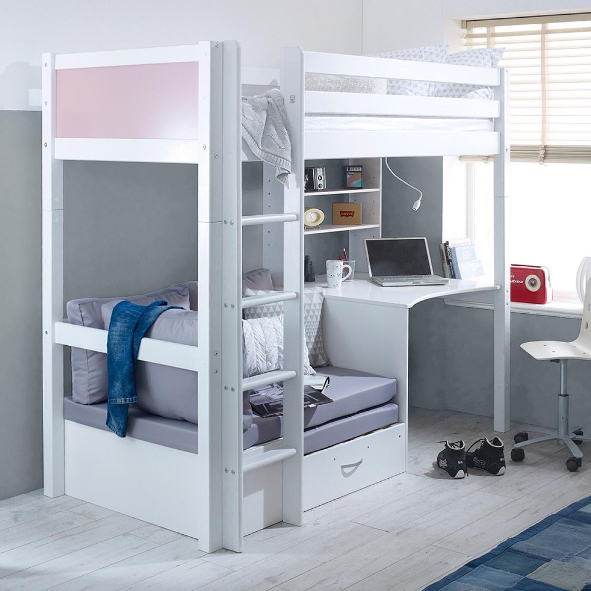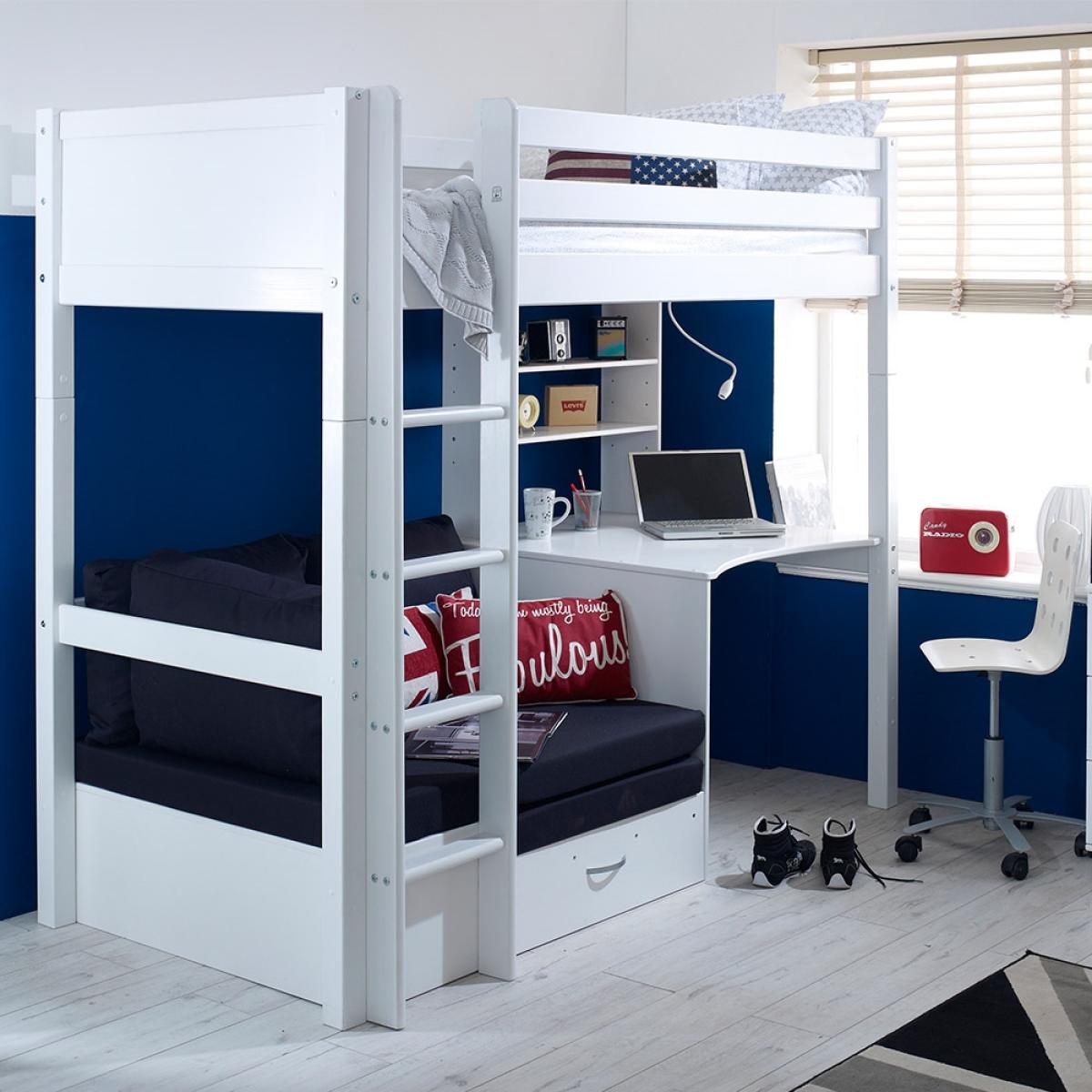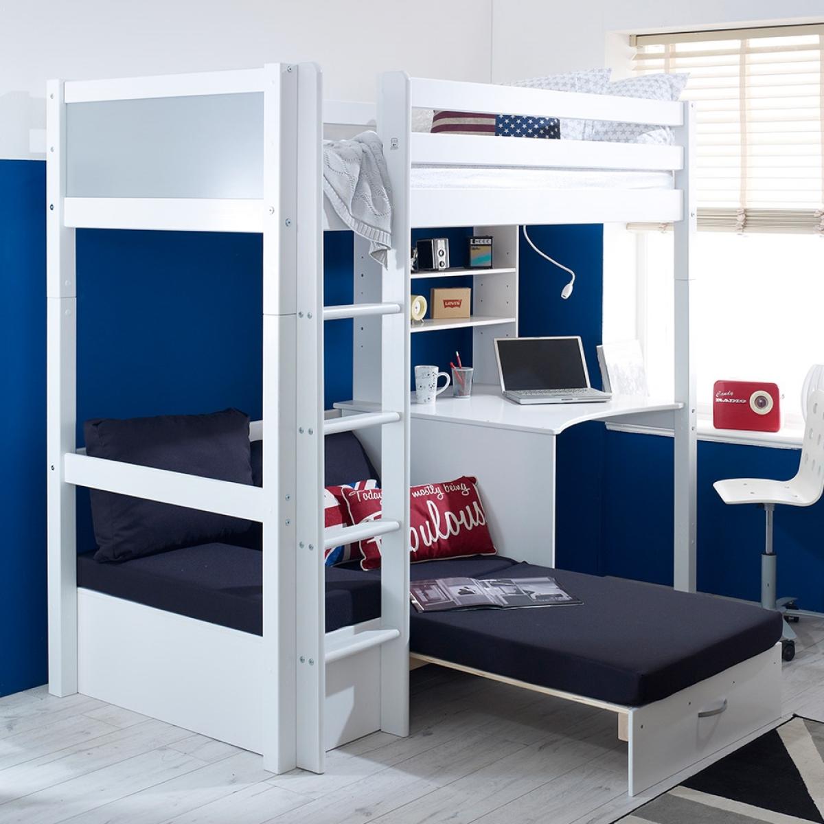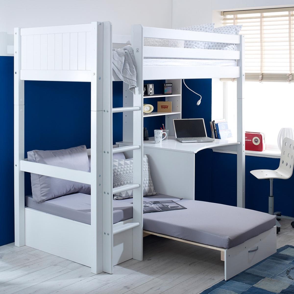 A great option for cramped bedrooms, the Nordic Kids High Sleeper 3 would be ideal for your teenager's bedroom. This bed not only offers up a place to sleep but also a place to work and a spot to max and relax, what more could you want? Manufactured from solid pine and MDF the fresh white colour will easily coordinate with any interior style and will make the move from kiddies room to teen room will be one easy task! With a desk beneath, it is the ideal homework set up and with the inclusion of a sofa bed, sleepovers just got that much easier!There is even the option to change the colour or design of the head and footboard so you can make your kiddies bed individual to them!.