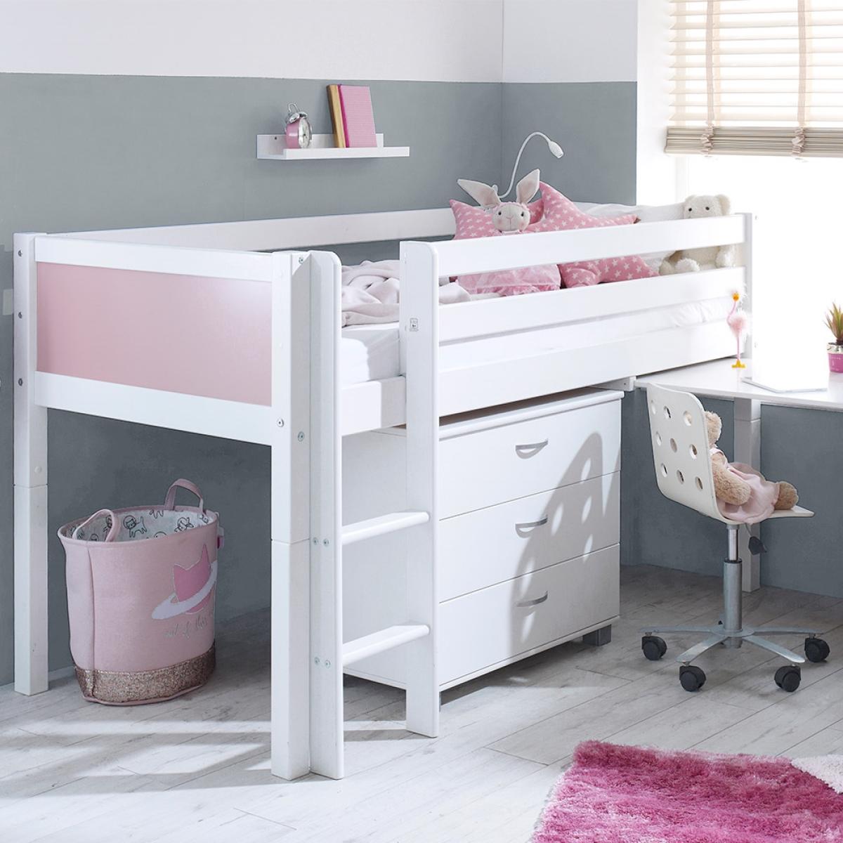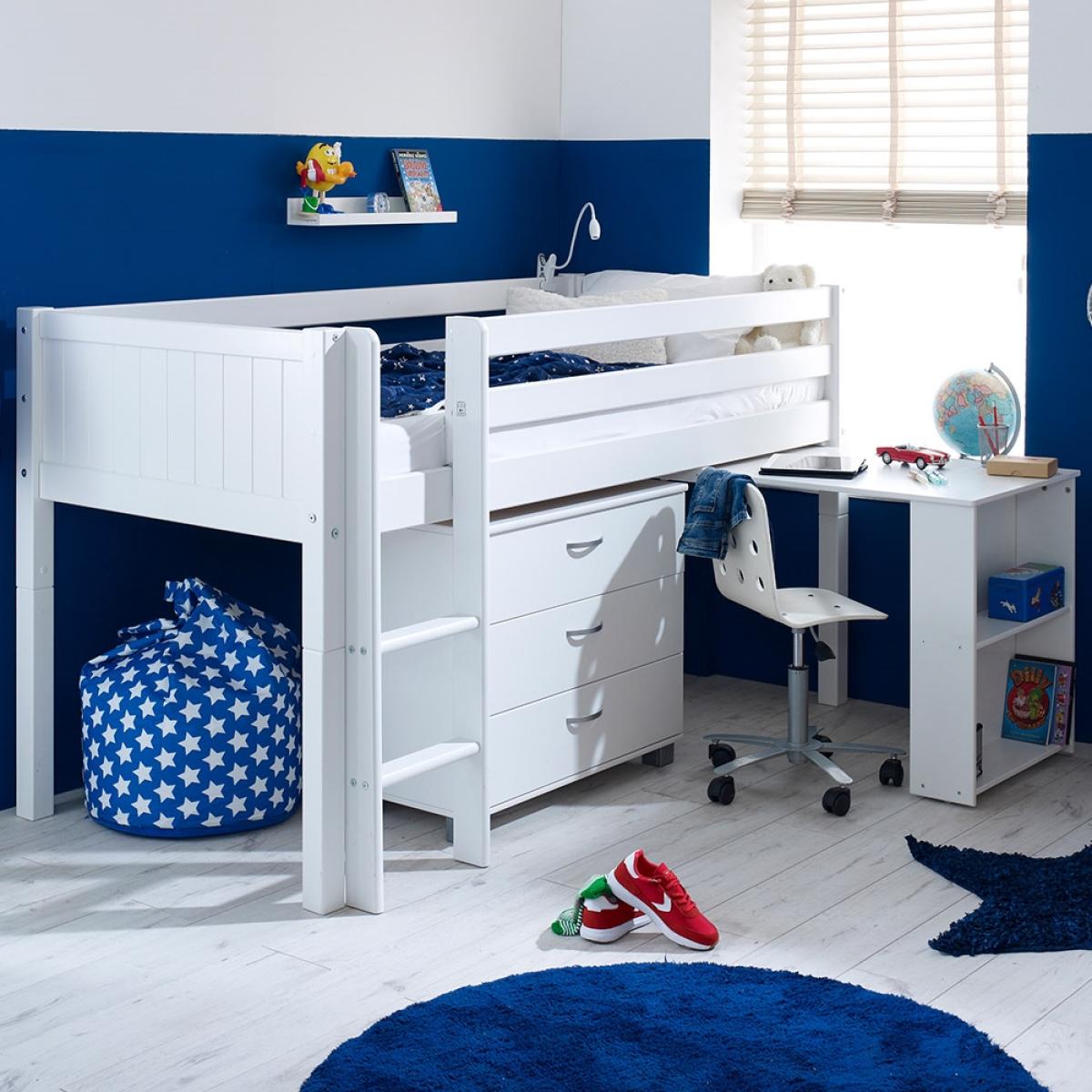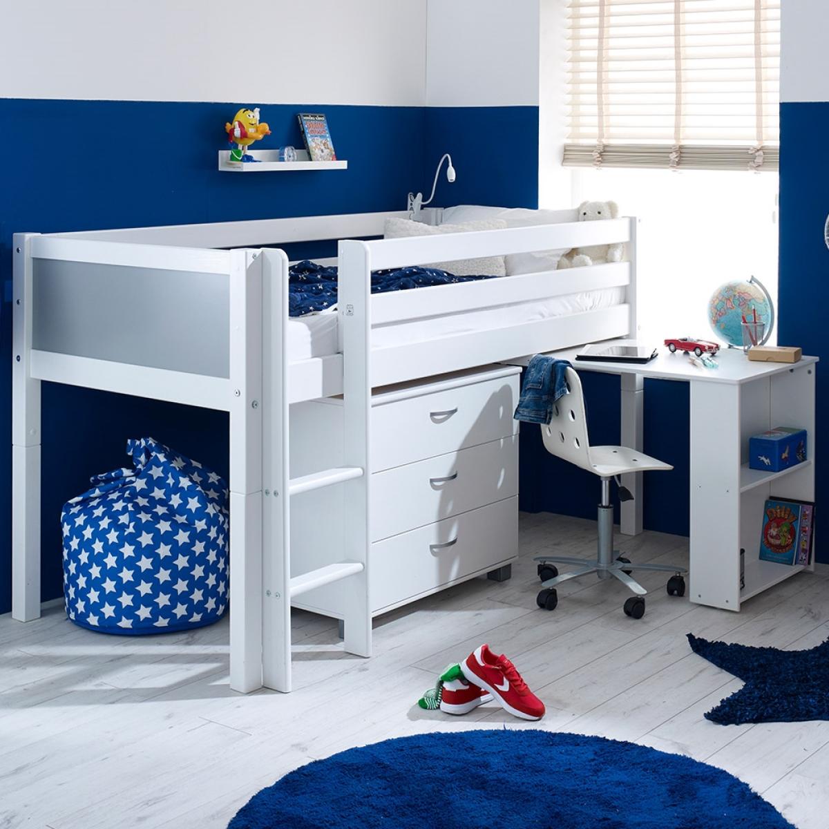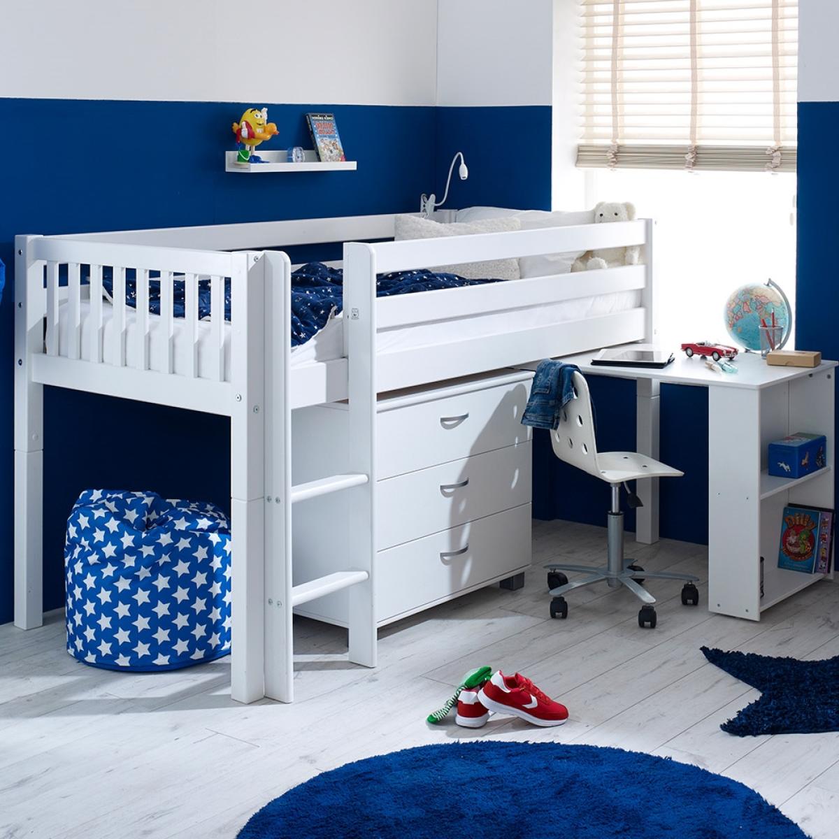 Ideal in cramped bedrooms or if you're just trying to save on space, the Nordic Kids Mid Sleeper 2 is a great space-saving solution. Manufactured from solid pine and MDF the fresh white colour will easily coordinate with any interior style. The inclusion of the chest with three drawers is perfect for keeping your kiddies clothes neat and tidy whilst the desk is great for when homework time rolls around. What's more when the homework is all done just push it back under the bed to create more space to play! What could be better?There is even the option to change the colour or design of the head and footboard so you can make your kiddies bed individual to them!.