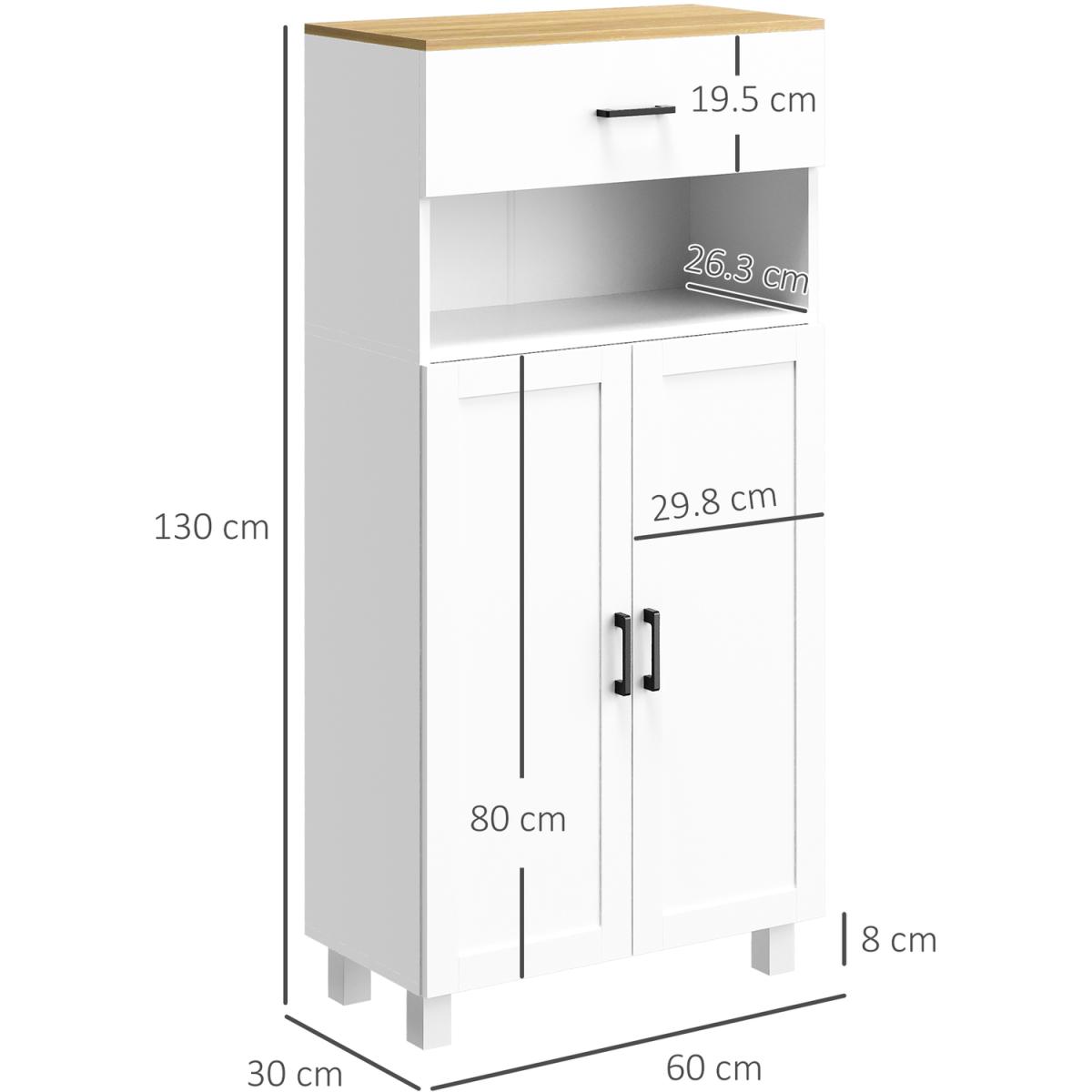 Kitchen running out of space Then this HOMCOM free standing kitchen unit will get clutter organised in no time. Say hello to its multi-storage design features a top drawer for utensils and napkins, an open countertop for plates, and a bottom cupboard for pots, dry goods, or plastic containers. Made from particle board frame, this kitchen pantry is sturdy, complete with anti-tipping straps for safety.