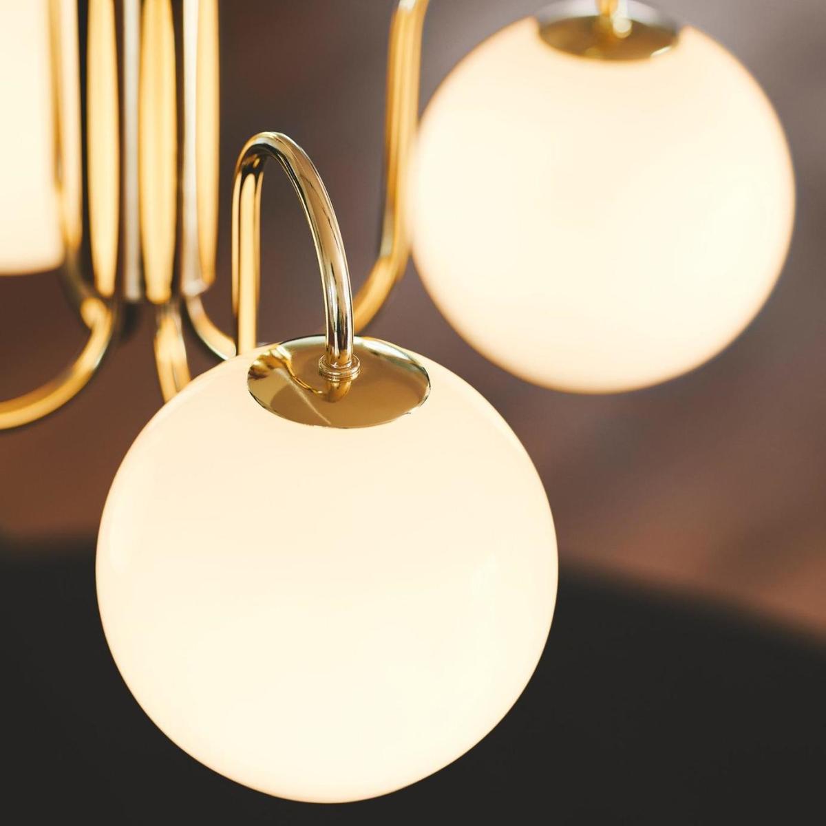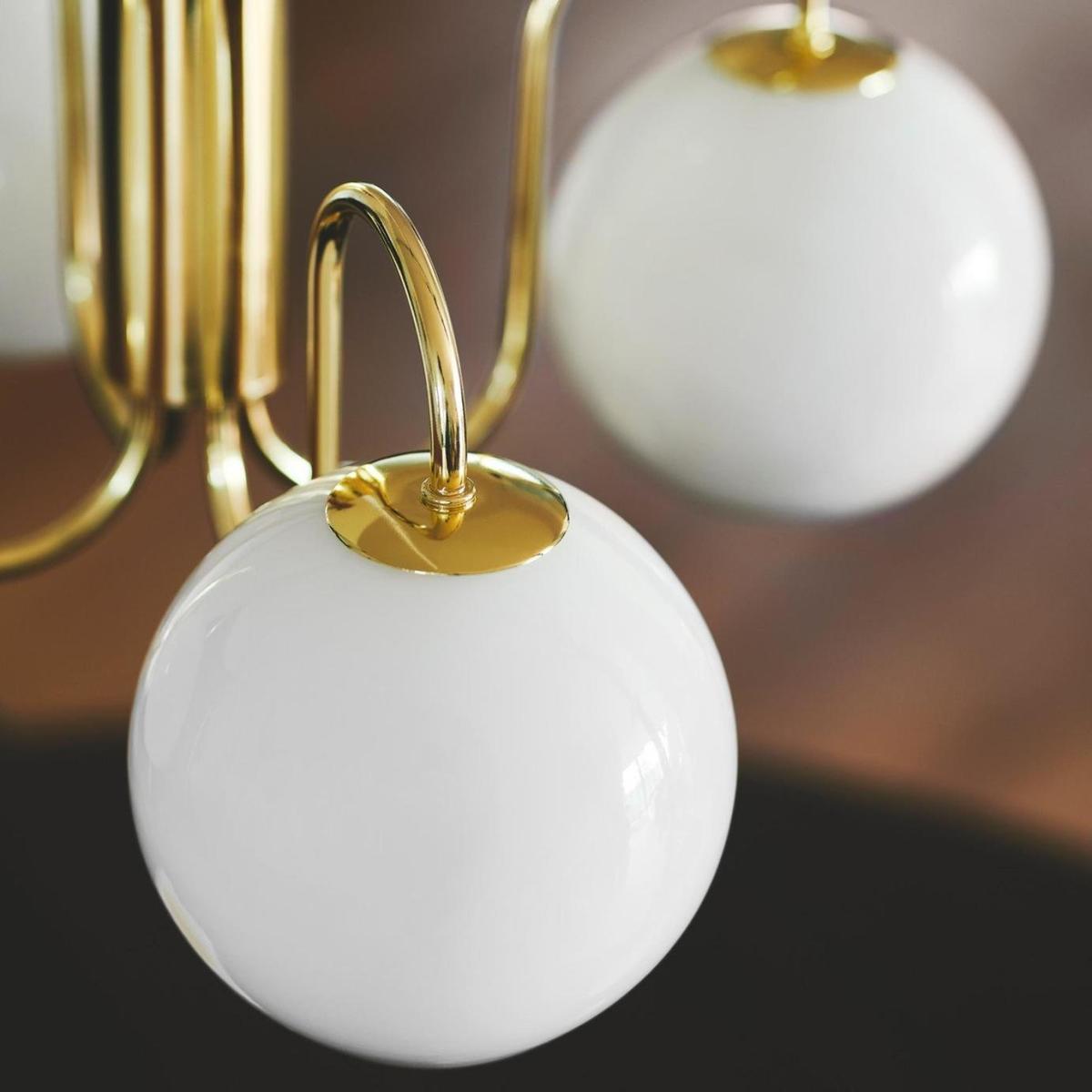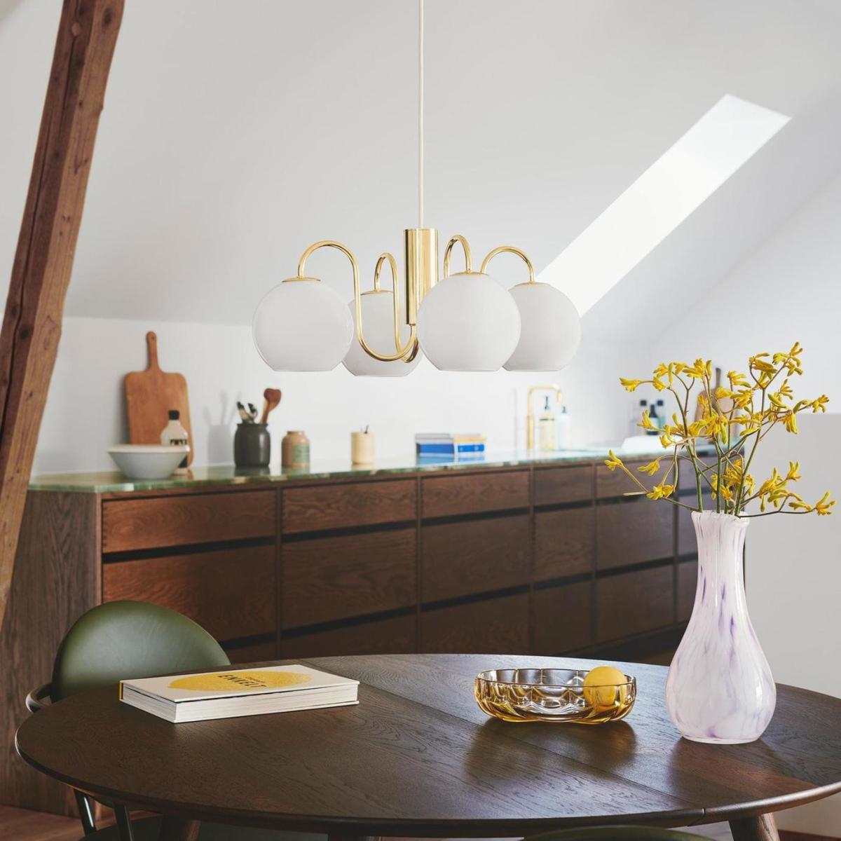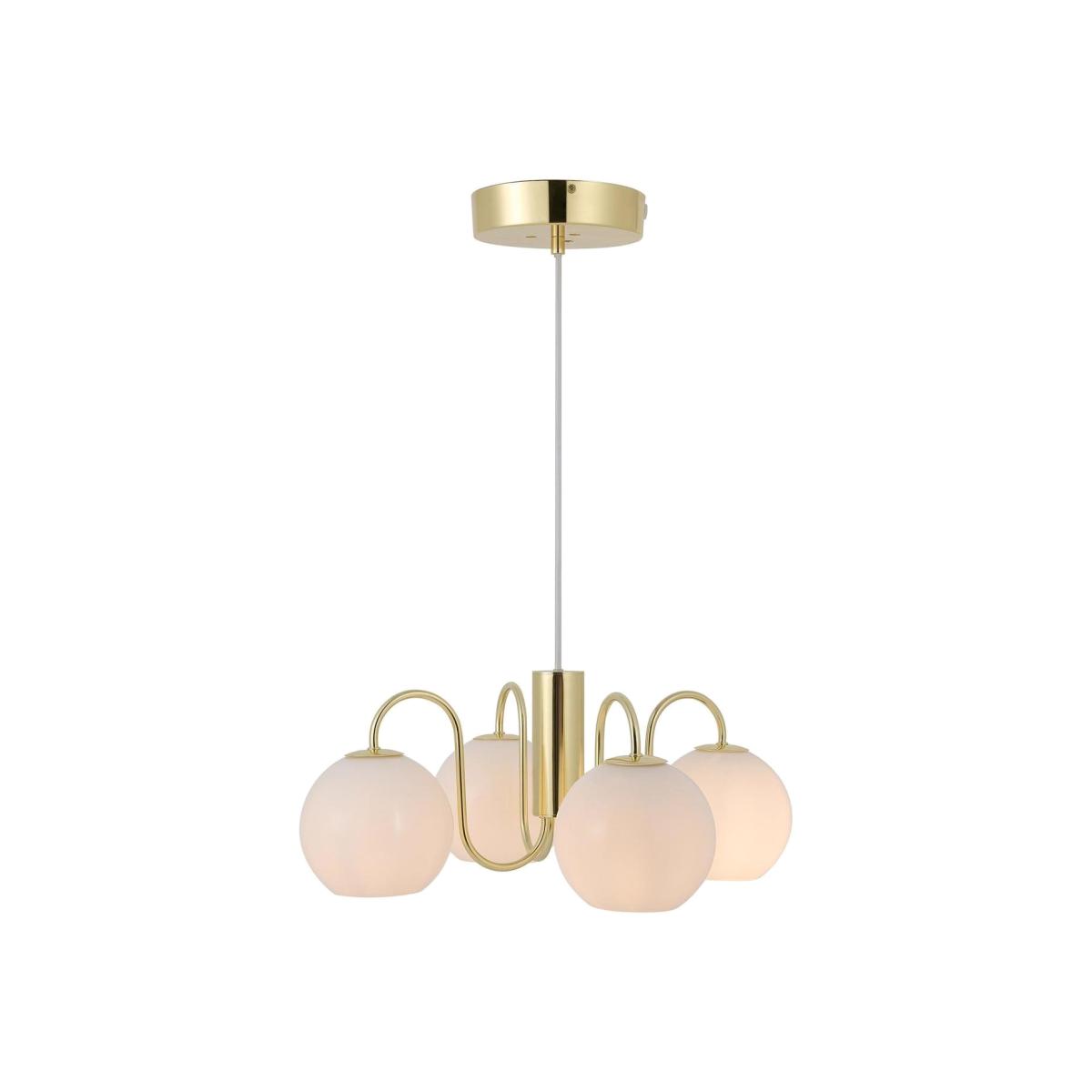 The Franca series has an exclusive and elegant design with beautiful glossy glass and shiny brass. The pendant draws inspiration from the classic chandelier and incorporates vintage details with a modern twist. The white glass domes create a soft and diffused light. The glass in this lamp is mouth-blown and has been individually handcrafted. Due to this unique process, air bubbles may appear in the glass, and the thickness of the glass can also vary. This gives the glass its character and vivid appearance. The Franca pendant's elegant brass finish and modern design make it a striking centerpiece in dining areas, kitchens, or living rooms. Its four glass shades evenly distribute light, creating a balanced and inviting environment that elevates the overall aesthetic. Enhance your interior design by combining the Franca pendant with other fixtures from the Franca series. Matching wall lights or table lamps in the same brass finish brings a sense of cohesion and style, creating a polished and harmonious lighting scheme throughout your home. Dimensions: Size H19.5, W46, Diameter 46cm. Adjustable drop. 19.5 - 200cm drop. Bulb Information: Bulbs required 4 x E14 small edison screw LED (not included). Recommended maximum wattage: 40 watts. Can not be used with a dimmer switch. LED bulb only. General Information: Material: metal. IP rating 20. Not suitable for bathroom use. Weight: 1.8kg.