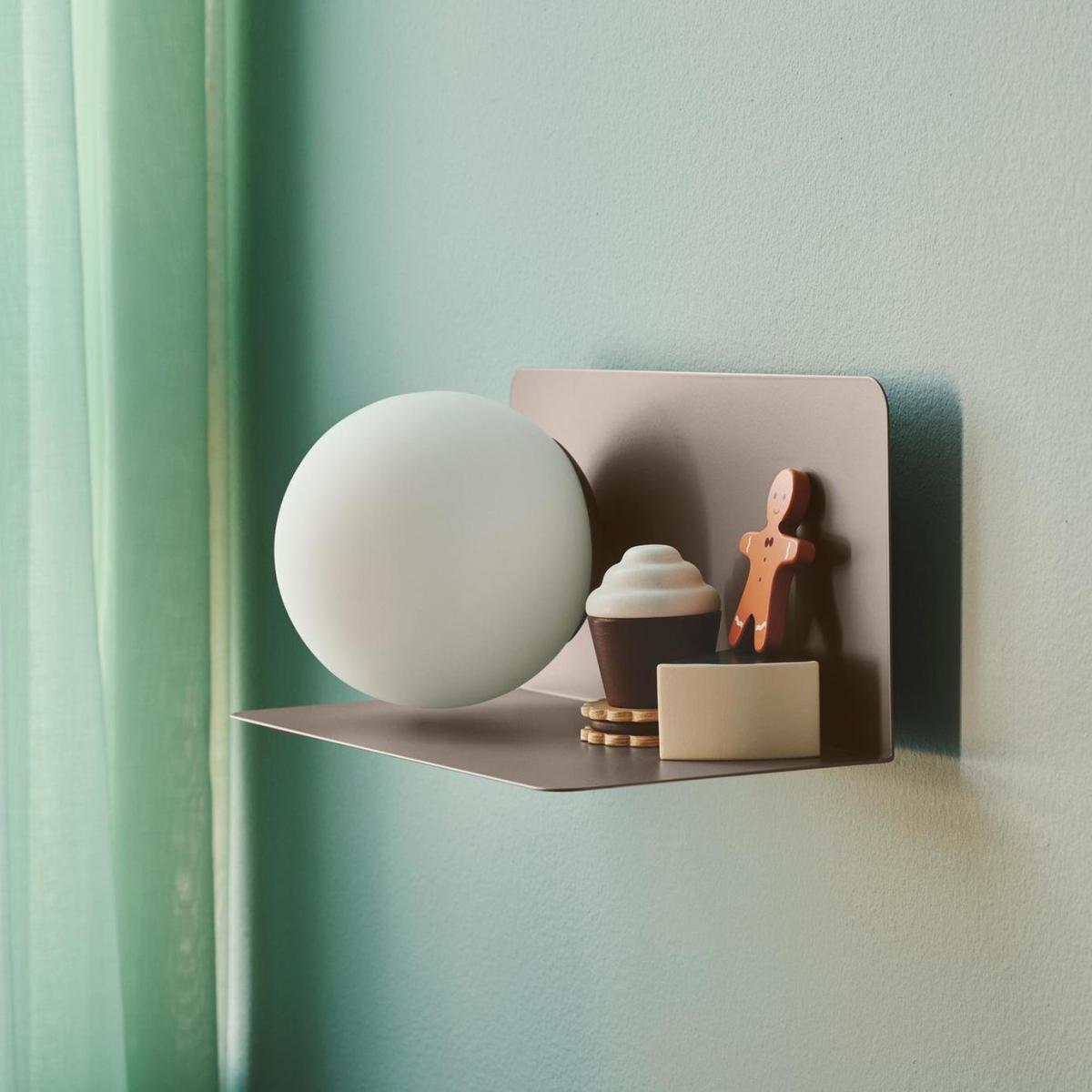Lilibeth is a lamp and shelf in one elegant design. Place it next to your bed or in the hallway to hold important necessities such as your phone, book, or keys. The opal white glass dome ensures a pleasant, diffused light. Also perfect as a bedside light for the children's room to make your little ones feel safe during the night. The glass in this lamp is mouth-blown and has been individually handcrafted. Due to this unique process, air bubbles may appear in the glass, and the thickness of the glass can also vary. The Lilibeth wall light combines illumination with practicality, featuring an integrated shelf that provides convenient storage space. This design is perfect for placing small essentials such as a phone, book, or keys, making it an ideal addition beside your bed or in the hallway. Its compact size and dual functionality help save space while keeping your necessities within reach. Each Lilibeth wall light is equipped with a mouth-blown opal glass shade, individually handcrafted to ensure unique character. The natural variations in the glass, such as air bubbles and thickness, add to its charm and distinctive appearance. Dimensions: Size H16, W35, Diameter 15cm. Non-adjustable drop. 16 -. Bulb Information: Bulbs required 1 x E14 small edison screw LED (not included). Recommended maximum wattage: 25 watts. Can not be used with a dimmer switch. LED bulb only. General Information: Material: metal. IP rating 20. Not suitable for bathroom use. Weight: 1.55kg.