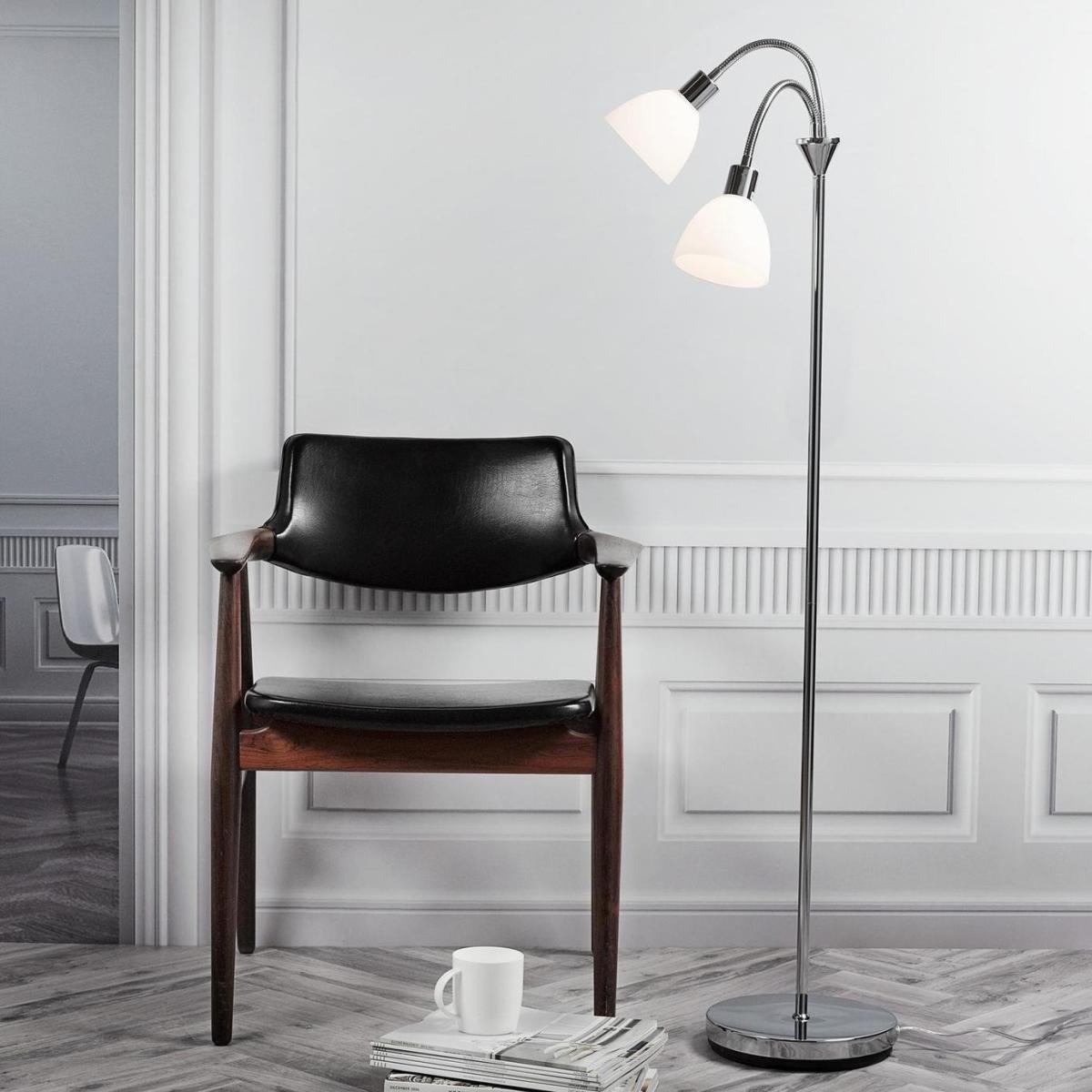 The Ray double floor light from Nordlux features a very classic and stylish design. The light is made of chrome with glass shades. The white glass shades give a soft and pleasant light that suits many areas in the home. Use it as a decorative light in a corner that requires a little extra light, or use it as a reading light behind the good armchair. The lamp heads can be turned in all directions, providing for many uses. The Ray Double Floor Lamp features dual light sources, providing more even illumination compared to a standard single-head floor lamp. This makes it perfect for larger living spaces where balanced lighting is needed, all while maintaining a slim and space-saving profile. By combining two lamps in one, it delivers both practicality and enhanced ambience, elevating the overall lighting experience in the room. Crafted from black lacquered metal, the Ray's design reflects timeless Scandinavian minimalism. Its clean silhouette and durable finish ensure it not only complements both modern and classic interiors but also remains stylish for years to come. More than just a functional lamp, it serves as an elegant design statement that enhances the character of any living space. Dimensions: Size H158, W25, Diameter 25cm. Diameter of base 25cm. Shade size H9, D 12cm. Cord length 1.8m. Bulb Information: LED bulb only. General Information: Shade material: metal. Base material: metal. In-line switch. Minimal assembly. Product is mains powered plug in. This lighting product is a class 2 fitting. Weight 4.08kg. Manufacturer's 2 year guarantee.