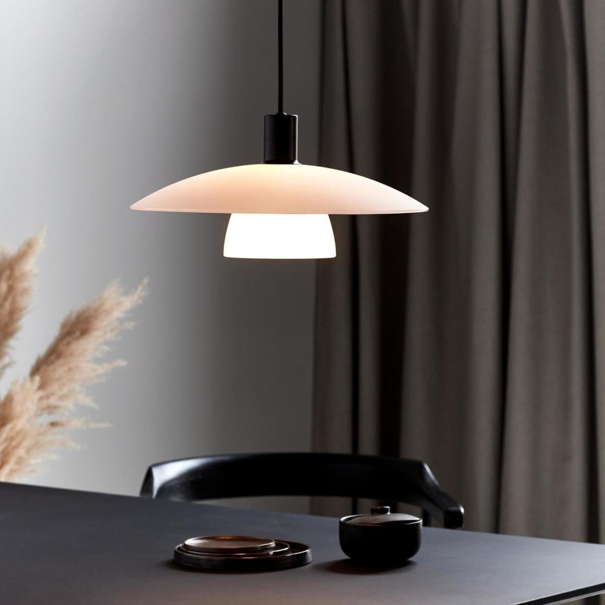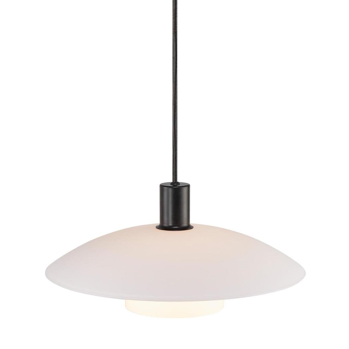 Verona is a traditional series in a classic Scandinavian design. Verona is constructed of two beautiful, opal white glass shades that ensure a nice, even distribution of light into the room. Simultaneously, the contrast between the white opal glass and the matte black metal contributes to a modern look. The glass in this lamp is mouth-blown and has been individually handcrafted. Due to this unique process, air bubbles may appear in the glass, and the thickness of the glass can also vary. This gives the glass its character and vivid appearance. The Verona pendant creates a warm and inviting atmosphere, making it ideal for dining areas, living rooms, or hallways. Its sleek black finish and opal white glass shade add a sophisticated touch, transforming any space into a stylish and welcoming environment. Pair the Verona pendant with other fixtures from the Verona series to achieve a cohesive interior look. Coordinating table lamps and wall lights in the same matte black finish creates a unified aesthetic, enhancing the overall style and harmony of your space. Dimensions: Size H18.8, W40, Diameter 40cm. Adjustable drop. 18.8 - 200cm drop. Bulb Information: Bulbs required 1 x E27 edison screw LED (not included). Recommended maximum wattage: 40 watts. Can not be used with a dimmer switch. LED bulb only. General Information: Material: glass. IP rating 20. Not suitable for bathroom use. Weight: 2.12kg.