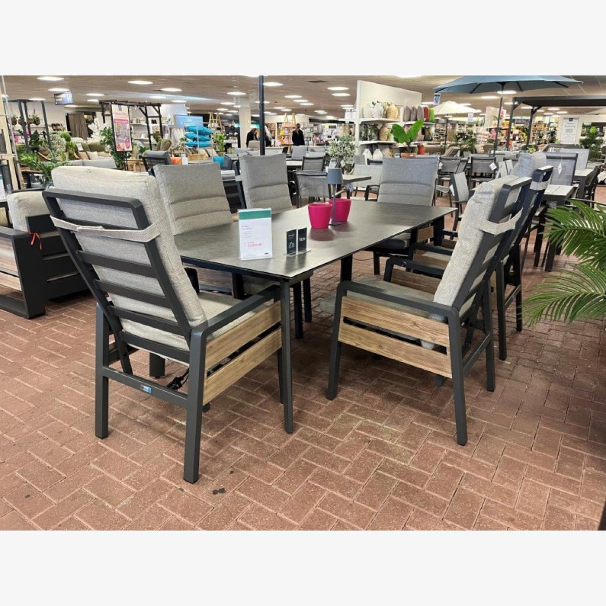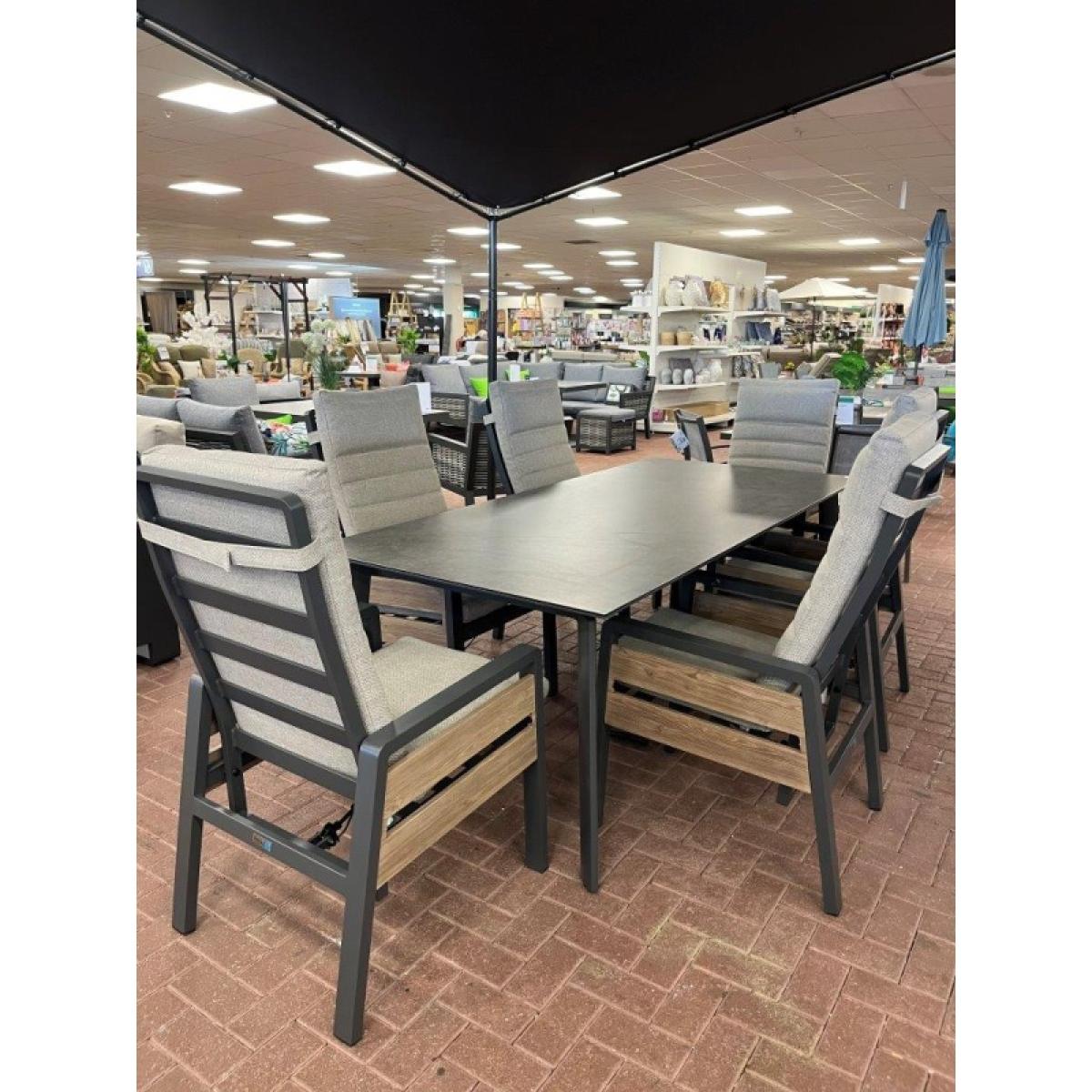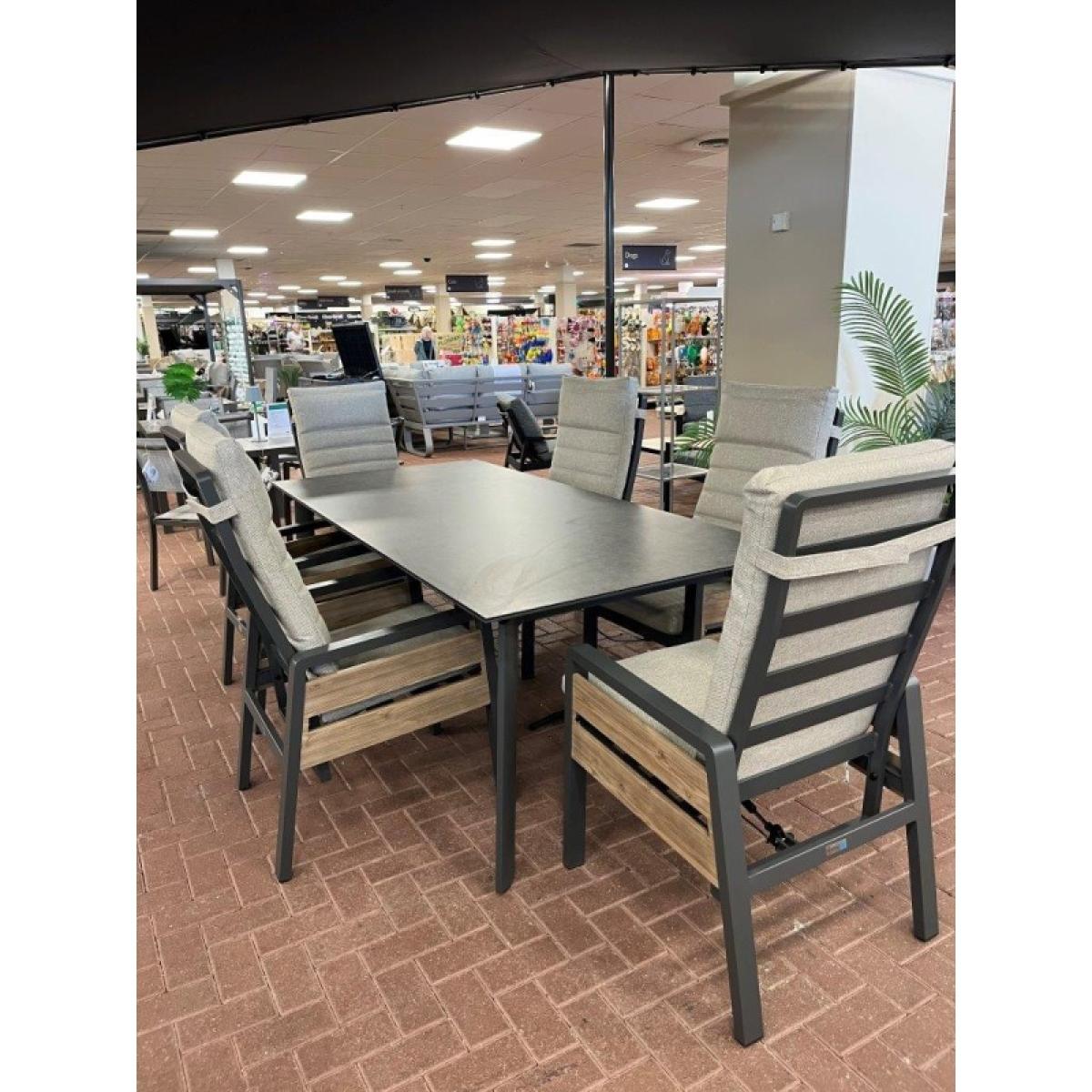 Bring a touch of luxury to your outdoor living with the Norfolk Leisure Antigua 6 Seat Reclining Dining Set. Designed for both comfort and style, this elegant set is perfect for al fresco dining, garden parties, or simply relaxing under the sun. Crafted with premium weather-resistant materials, the Antigua set features six generously padded reclining chairs and a spacious dining table with a sleek, contemporary finish. Each chair reclines effortlessly, allowing you to switch from dining to lounging in seconds—ideal for those long, lazy afternoons. Set Includes: 1 x Dining Table 6 x Reclining Dining Chairs 1 x Cover Key Features: 6 Reclining Chairs: Ergonomically designed with adjustable positions for ultimate comfort. Spacious Dining Table: Perfectly sized for entertaining, with a durable, easy-to-clean surface. All-Weather Durability: Made with high-quality rust-free aluminum frames for year-round use. Low Maintenance: Easy to wipe clean and built to withstand the elements. 2 Year Guarantee. Set includes FREE cover. Dimensions: Table: Height: 75cm Width: 80cm Length: 140cm Chairs: Height: 71cm Width: 102cm Depth 84cm Please note, all screens vary in colour reproduction and whilst every effort has been made to display the colour as accurately as possible it is for guidance only. Scatter cushions and accessories pictured are for demonstration purposes only and are not included.