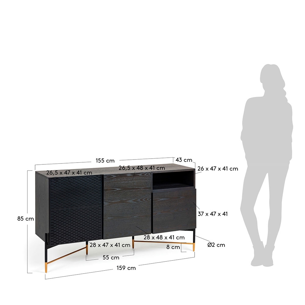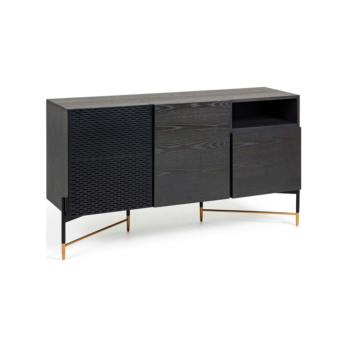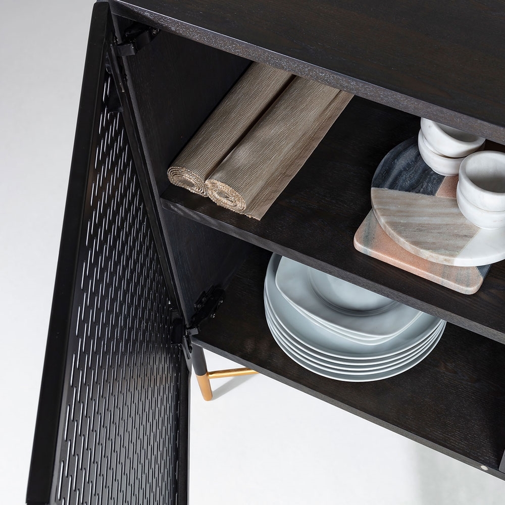 Give your interiors an upgrade with the Norfort Sideboard from La Forma. Finished in black, the gorgeous Ash wood unit has been suspended on metal legs with contrasting gold details to create an eye-catching design. Complete with a mesh metal door, the mix of materials and textures will inject a touch of industrial styling to your space. Designed to be displayed in the dining room; the 3 cupboards are perfect for storing away dinnerware, glassware, tablecloths and placemats and with shelving inside, your chosen contents are sure to be neat and tidy! Or why not pop this striking cabinet in the hallway or living room? Part of the Norfort collection, completely revamp your home with the La Forma furniture.