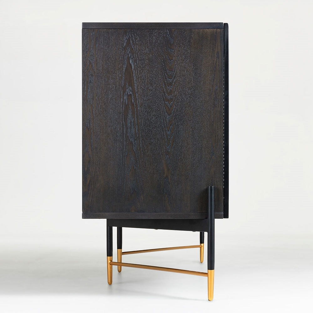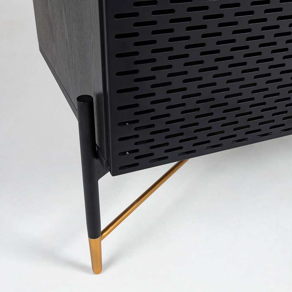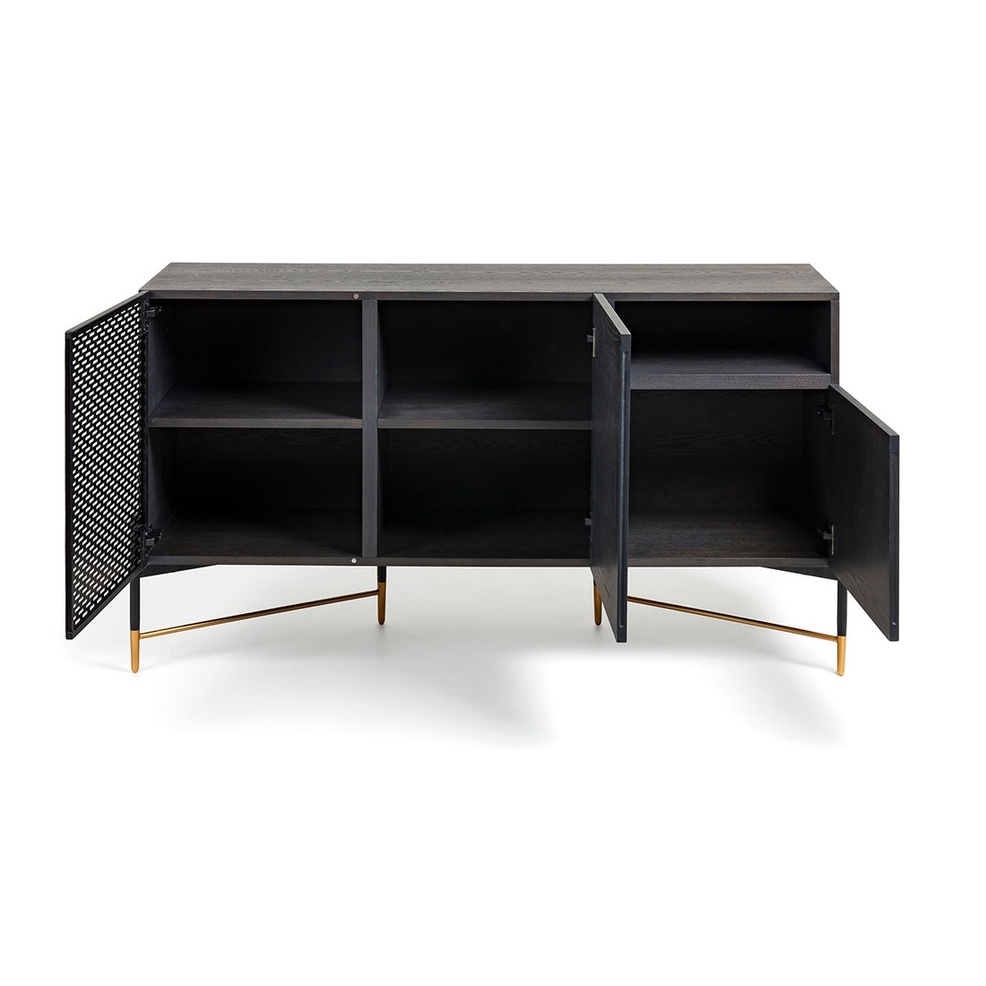 Give your interiors an upgrade with the Norfort Sideboard from La Forma. Finished in black, the gorgeous Ash wood unit has been suspended on metal legs with contrasting gold details to create an eye-catching design. Complete with a mesh metal door, the mix of materials and textures will inject a touch of industrial styling to your space. Designed to be displayed in the dining room; the 3 cupboards are perfect for storing away dinnerware, glassware, tablecloths and placemats and with shelving inside, your chosen contents are sure to be neat and tidy! Or why not pop this striking cabinet in the hallway or living room? Part of the Norfort collection, completely revamp your home with the La Forma furniture.