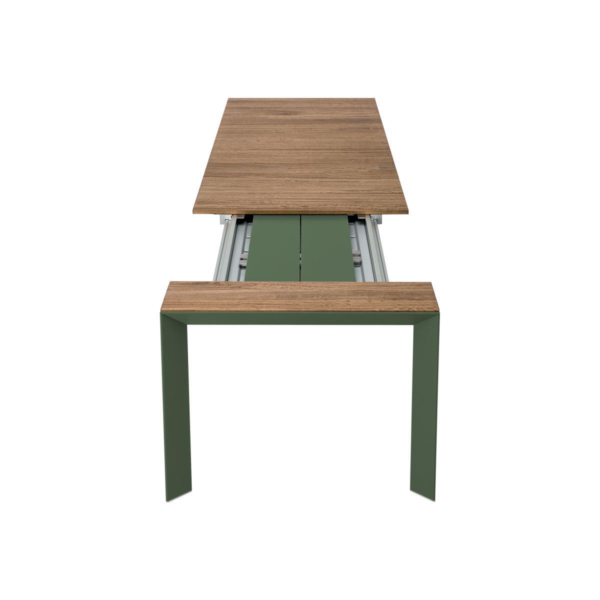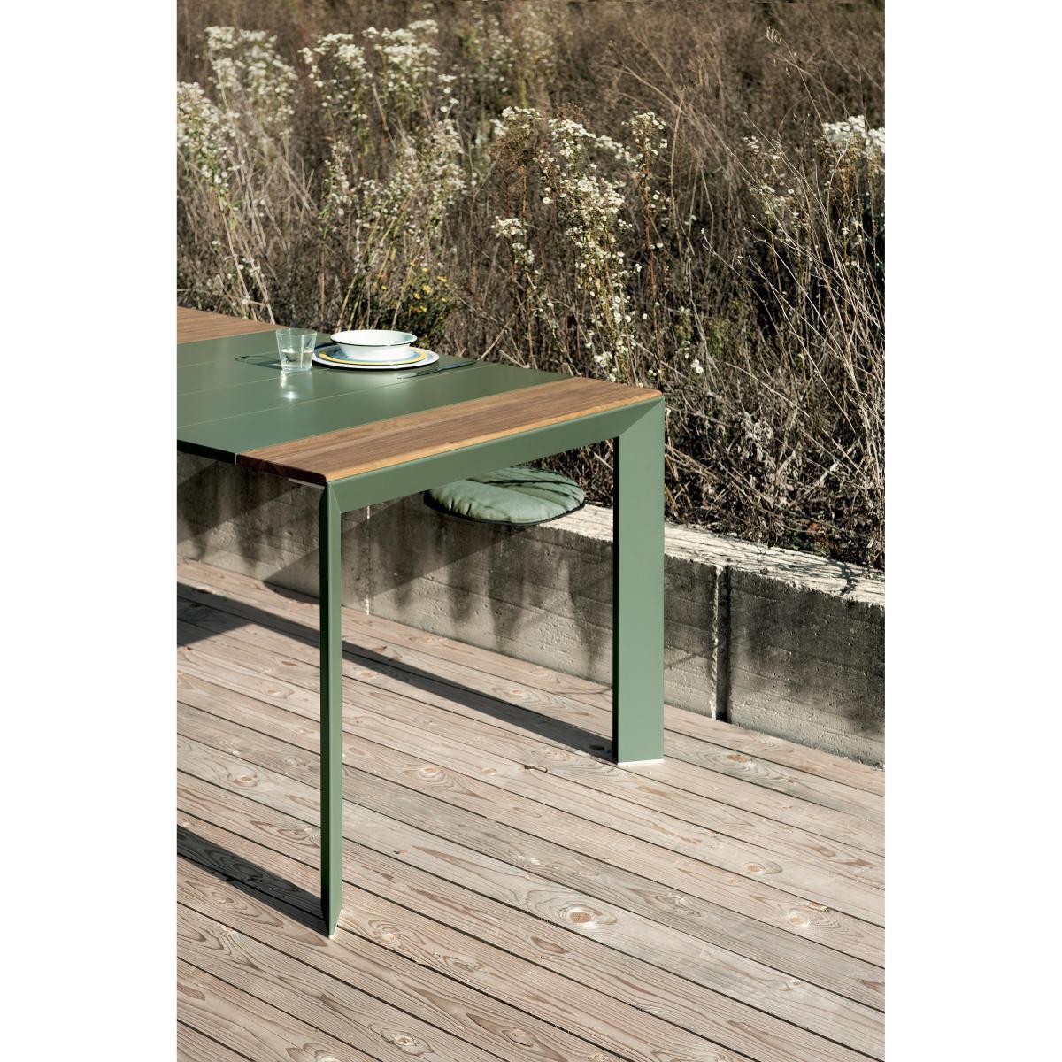 Nori, maximum technology in minimalist form. This table with its clean lines comes with two independent extensions. So you can choose between three different table-top lengths: L 199, L 239 and L 279 cm. The two aluminium extensions are fully independent: depending on your requirements, you can use just one of them. A true technical challenge, the extension system hidden in the structure is totally invisible and locks/unlocks with a handle to prevent accidental opening. The structure and feet are also made of anodised aluminium. The feet trace tapered, aggressive geometric lines, leaving their profound mark on the surrounding space and all who see them. They are fixed to the structure by a perfect junction, with no visible screws: a technical jewel, the fruit of some extremely neat craft work. The Nori table top is made of teak, a naturally resistant material that’s FSC-certified. Teak can take on a natural patina over time to display a silver colour. If you want to keep its natural shade, we recommend you treat it with oil. This Nori table offers an ultra-chic combination of metal and wood. Its coloured feet and extensions blend perfectly with the natural teak and provide an original, contemporary touch. Ideal for entertaining guests in a kitchen or living room, the Nori table is also an elegant solution for an office or meeting room. This table also comes in other colours, dimensions and depths. Please contact our personal shopper for more information.