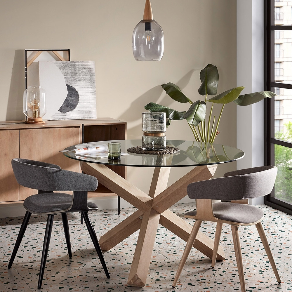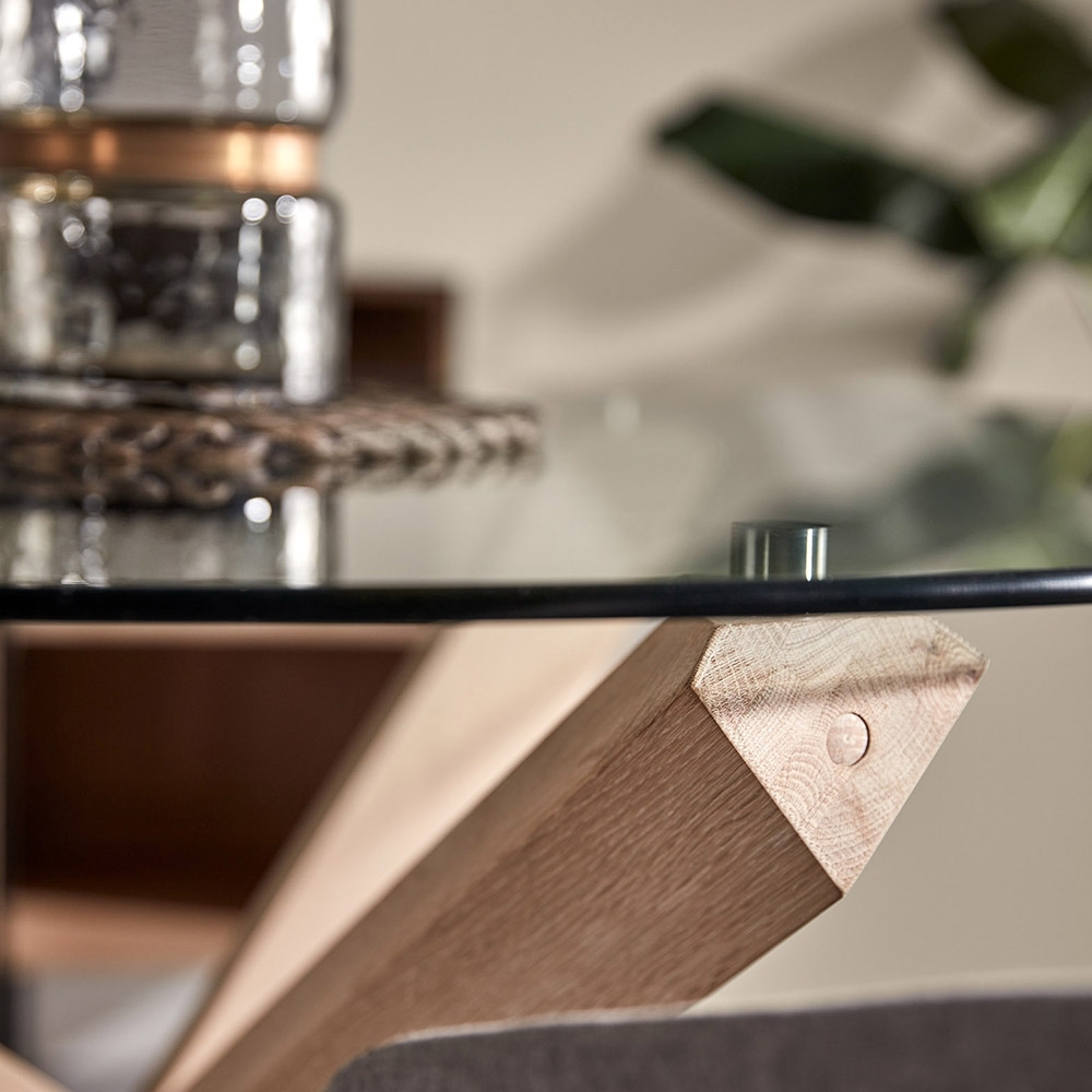 I love this table because of its versatile design and material mix, which makes it a stylish yet practical choice for many interiors. The glass top keeps the look light and modern, perfect for smaller spaces or to create an airy feel in a room, while the oak base adds warmth and durability. It works well in contemporary, Scandi, or even eclectic schemes, providing a neutral anchor that can be styled up or down. Practical styling tips include pairing it with streamlined chairs for a sleek look, or offsetting it with textured or colourful seating to add personality. For a balanced feel, keep decor minimal on the table surface, and consider layering with a patterned runner or a vase of fresh flowers to make the space inviting without cluttering it.