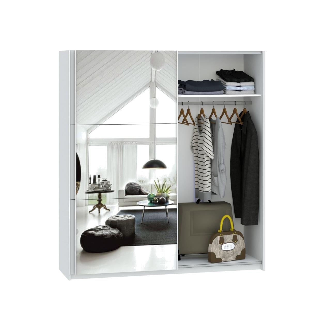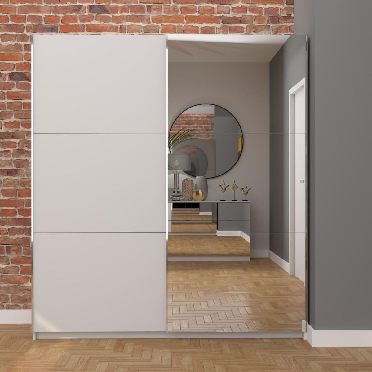 A modern wardrobe that deserves a place in your home. Crafted with a German engineered track system, you can be sure that this modern sliding wardrobe glides open and closed with ease. Its two spacious hanging rails are ideal for your favourite clothing items, while the additional shelves provide extra storage space – perfect for any home!.