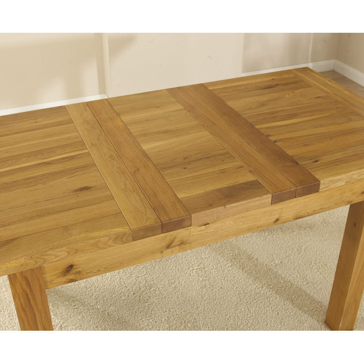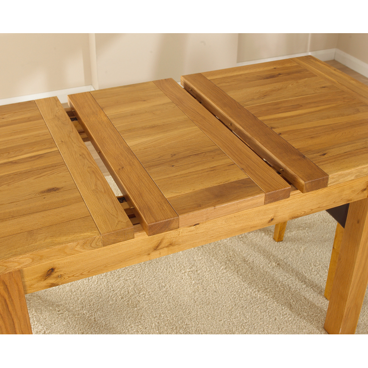The Normandy 120cm Solid Oak Extending Dining Table creates a warm and rustic atmosphere that’s sure to add a little extra charm to your home. The extending table is as versatile as it is beautiful and seats 4 people without extending and 6 people when extended. Crafted from solid oak and finished with a subtle clear lacquer, the Normandy Table is easily extended with a single panel that is simply stored in the middle of the table when not in use. To extend, pull out one end of the table and the other will automatically extend, allowing room for the panel to be placed. The extension adds 45cm to the length of the table making it ideal for everyday use and special occasions that call for a little extra room. Further Items in the Collection: Normandy 150cm Solid Oak Extending Dining Table and Normandy 180cm Solid Oak Extending Dining Table.
