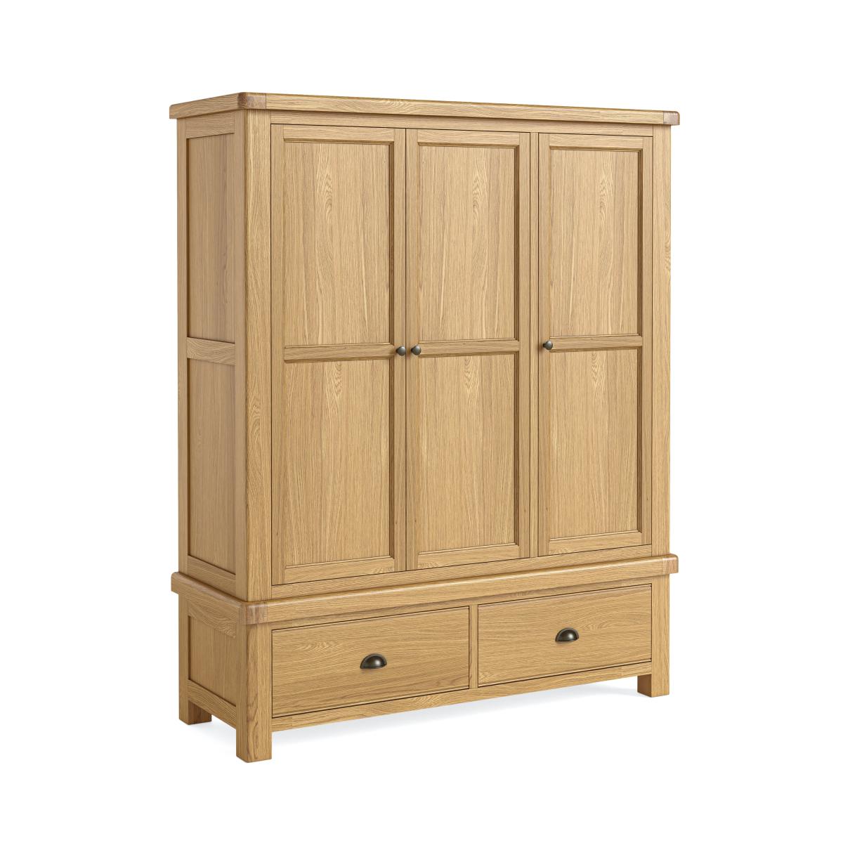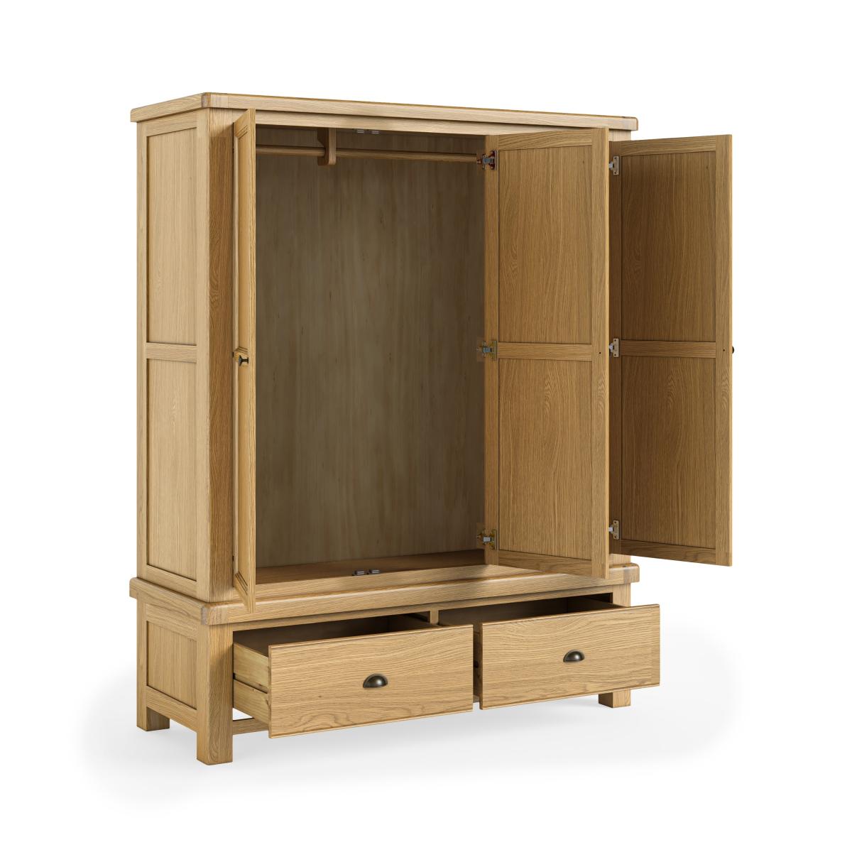 * Oak frame * Double rail * Side wooden runners This wardrobe features a classic oak frame that adds timeless elegance, blending seamlessly with both traditional and modern decor. This wardrobe offers ample storage space with its three doors, providing plenty of room for your clothing, accessories, and essentials. Inside, you'll find multiple hanging rails, allowing for easy organisation. Please note we are unable to deliver this item to Northern Ireland.