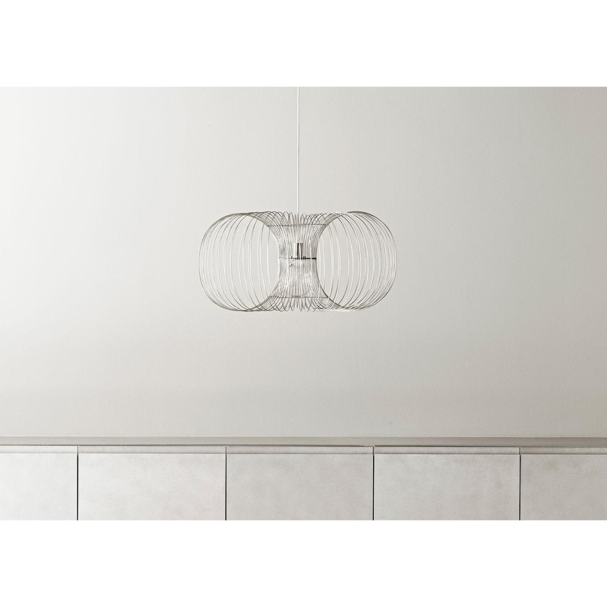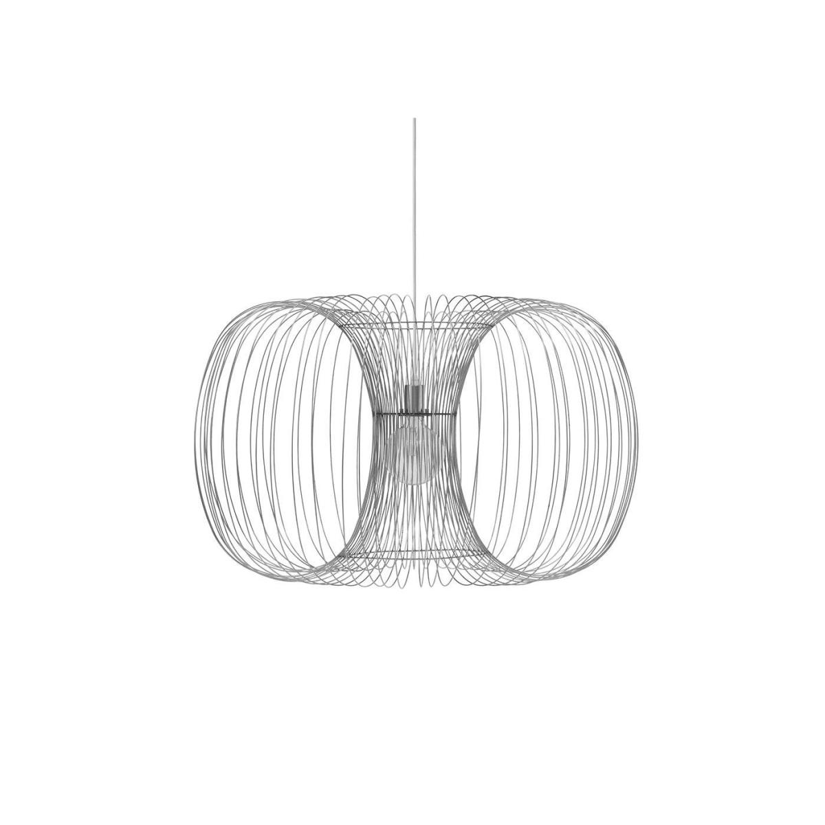 Coil is characterized by its rounded rectangle shape created by curved stainless-steel wires. The air between the wires makes the design appear light and airy despite its immense volume, making air as equally important for the design, as the material itself. The pendant is very simple in its design but will become an aesthetic focal point in any setting. This striking lamp appears as a fountain of metal looping its existence, creating a continuous and dynamic design. A sense of infinity.
