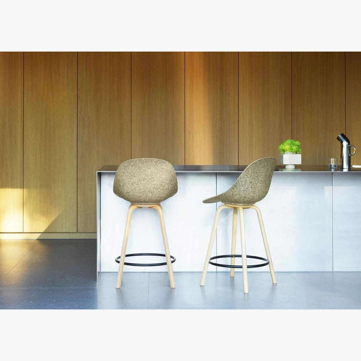 I’m a fan of the Mat bar stool in seaweed with beech legs and black footrest for its ability to add subtle texture without dominating a room. The muted green shell sits comfortably in Scandi-inspired, mid-century or modern-industrial schemes, while the slender wooden legs keep the look light and airy. Styling tip: pair it with a marble or concrete island top and slim metal pendants for contrast, or introduce warm timber panelling and soft textiles to soften the palette. A simple woven seat pad or slim lumbar cushion in a neutral tone will finish the look and boost comfort.