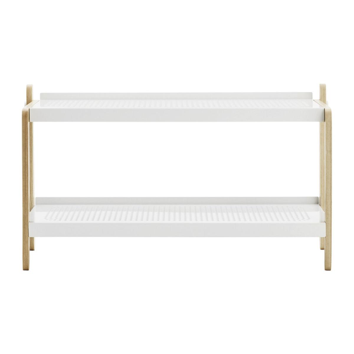 I love this shoe rack for its clean, minimalist aesthetic that effortlessly blends Scandinavian simplicity with functional design. It works well in a range of interiors, from contemporary to more traditional spaces, especially where a light, airy feel is desired. The white finish keeps it versatile and easy to style with different colour palettes, while the wooden legs add warmth and texture. Practical tips include placing it near the front door for quick access or in a utility area. To keep the look tidy, consider pairing it with matching storage bins or adding a few decorative accents on the shelves for visual interest without cluttering the space.