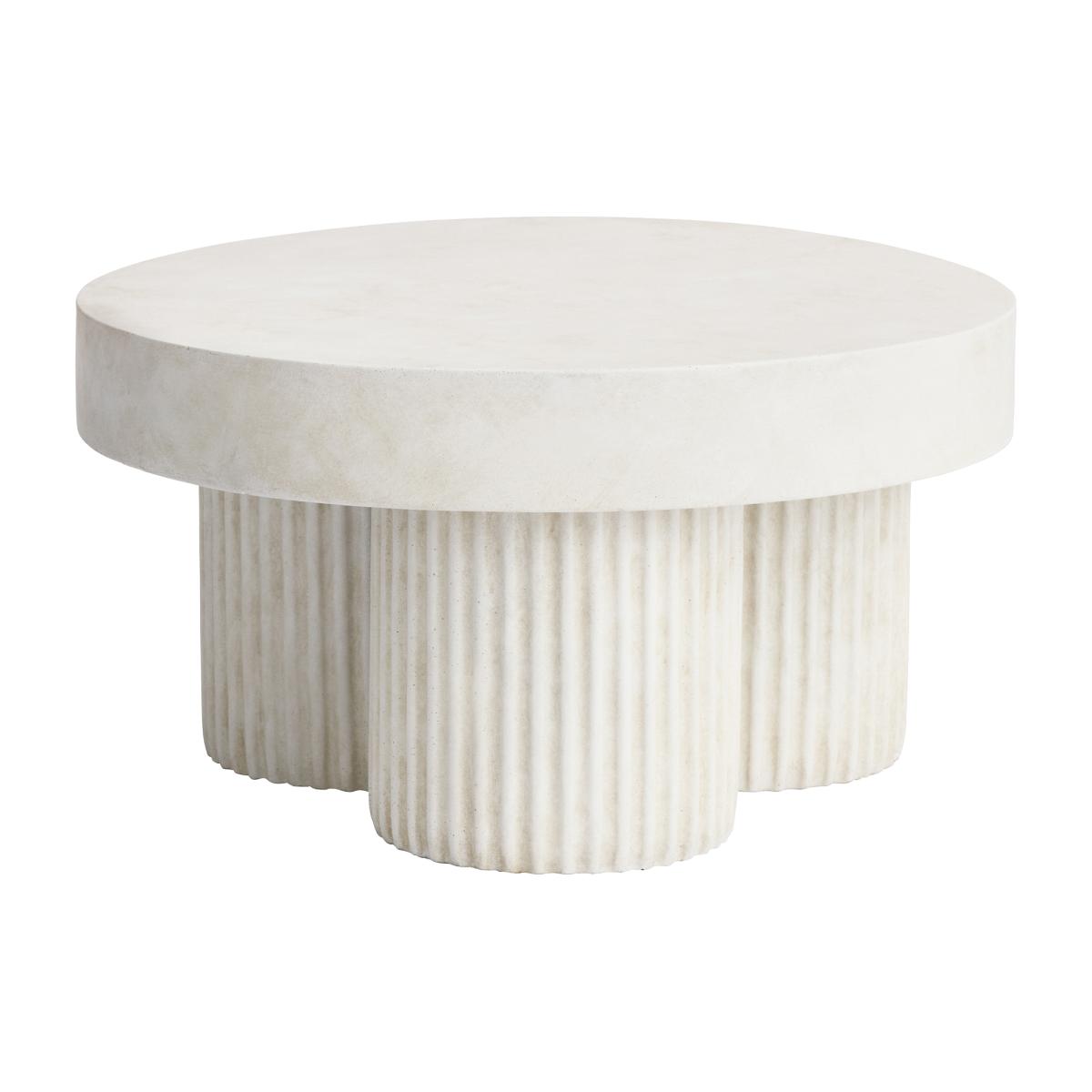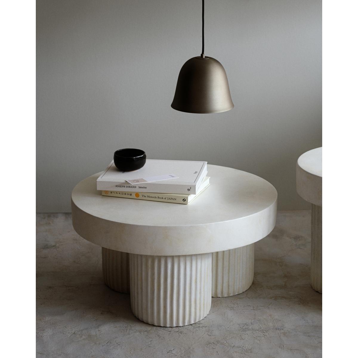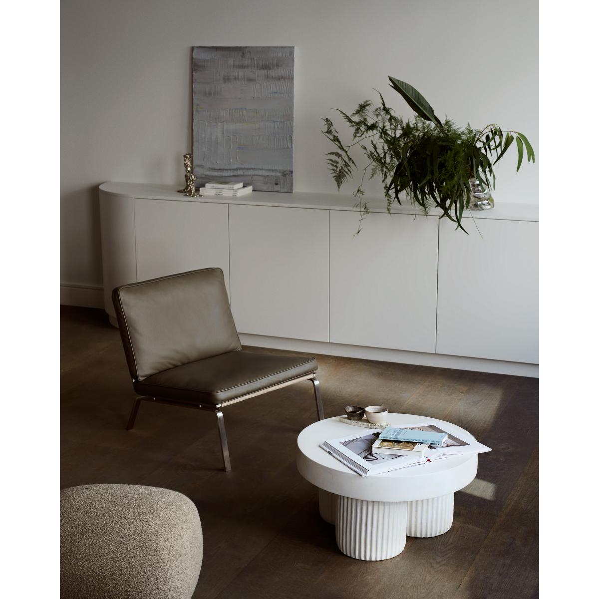 This low, chalk-coloured coffee table is a versatile piece that works particularly well in contemporary or minimalist interiors. Its sculptural form and textured base add visual interest without overwhelming the space. I love it because of its substantial presence yet clean silhouette, making it ideal as a statement surface in a neutral setting or layered with other textures like soft fabrics and metallic accents. For styling, consider pairing it with architectural lamps, a few carefully chosen books, or small plants to emphasise its modern aesthetic. It’s also practical for casual settings, offering ample surface area while maintaining a light, airy feel in the room.