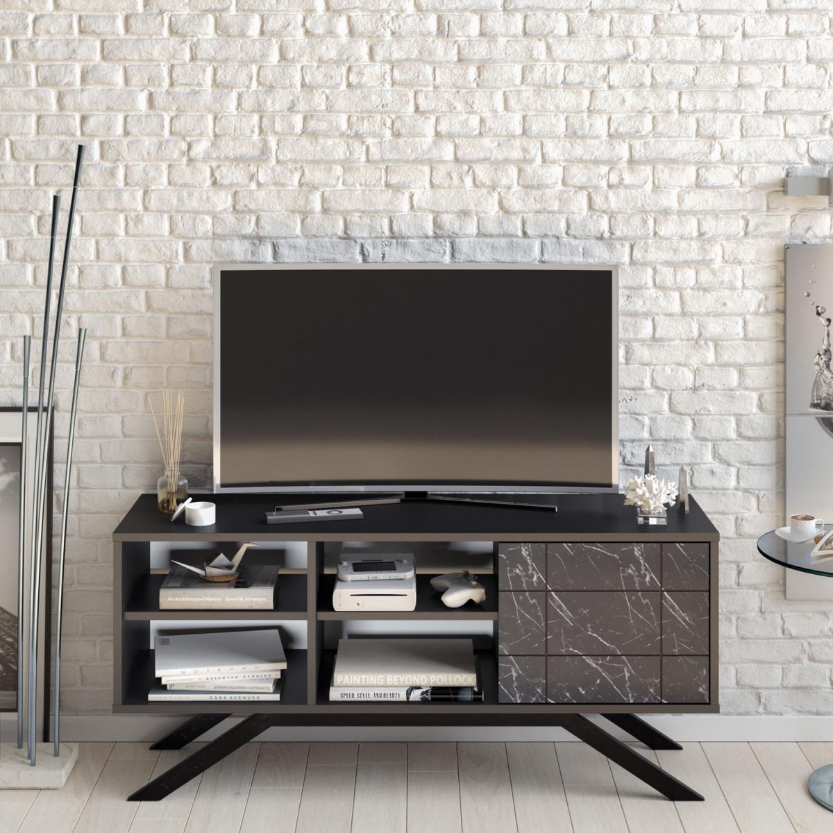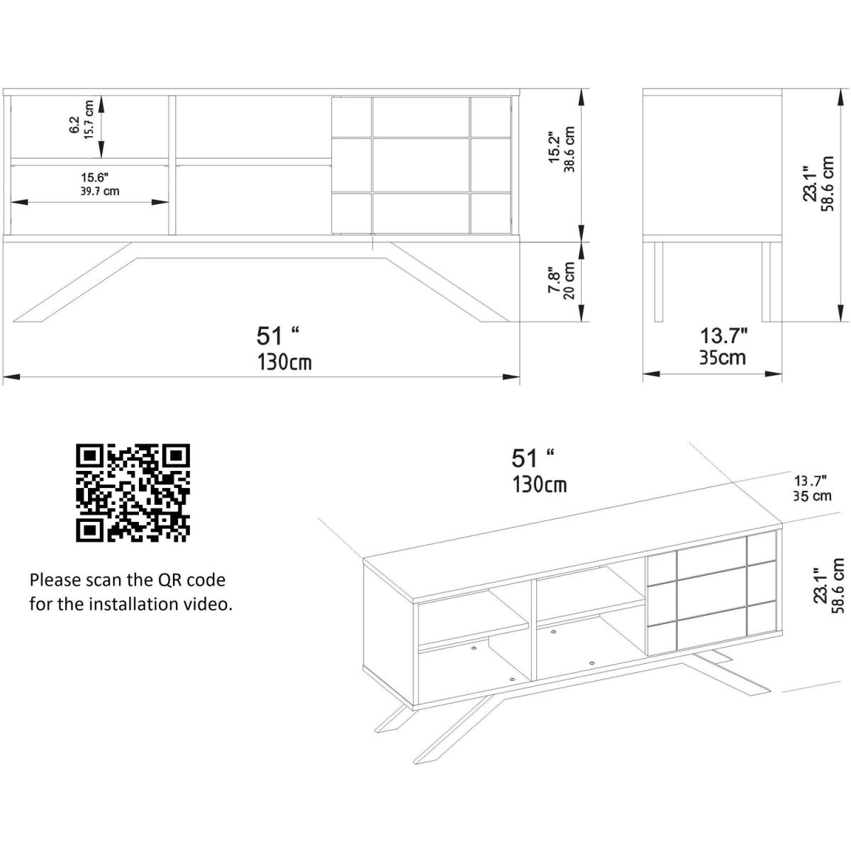 North 130 cm wide TV stand and media console with a cabinet, open shelves can accommodate TVs up to 58". This design offers enormous storage space for your media devices/collections. Carved straight crosslines on the door make the stand stunning. A slightly extended door edge is used as a handle in this design. It has a cable management hole in the back panel. The stand is made of an 18 mm thick melamine coated particle board and banded with PVC edge banding tape. The console is also strengthened with metal legs which make it sturdy and durable. Metal legs are coated with scratch and impact-resistant static paint. The product will be delivered to the customer in the original package as disassembled. It is designed to be assembled by the customer using a drill and screwdriver. Assembly instruction and installation hardware are included in the package. For fast and error-free installation, product parts are numbered with stickers following the assembly guide.