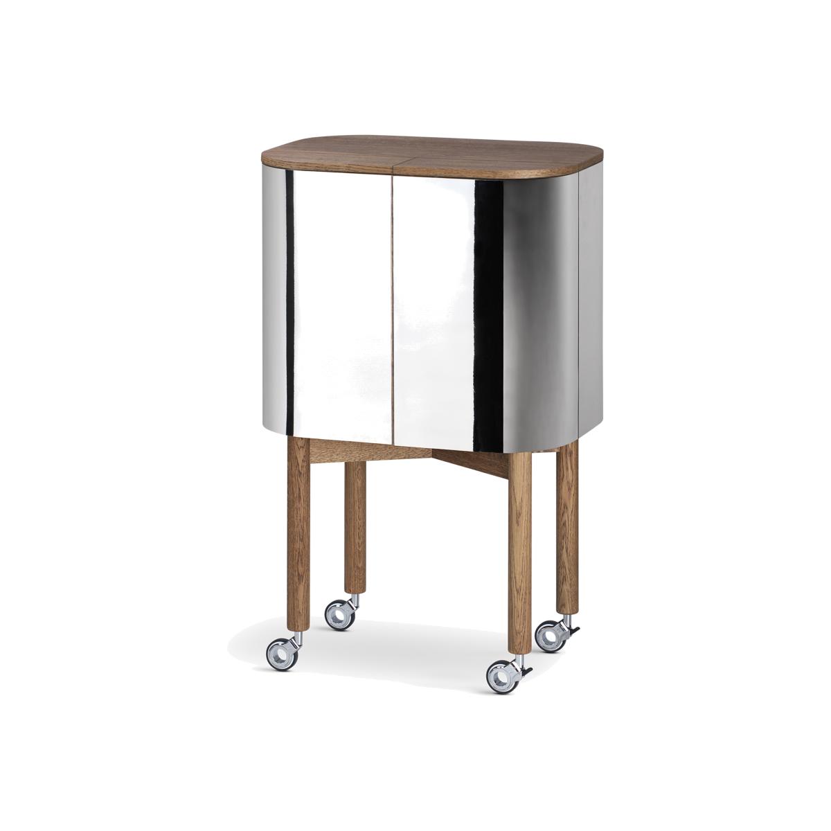 I love this little bar on wheels because of its versatility and modern aesthetic. The smoked oak top adds warmth, contrasting nicely with the sleek metallic finish, making it a stylish statement piece that can work well in both contemporary and eclectic interiors. Its mobility means it’s perfect for entertaining, whether in a open-plan living space or a compact kitchen, as it can be easily moved around to suit your needs. For styling, consider pairing it with minimal accessories, like glassware or a few carefully chosen bottles, to keep the look clean and functional. It also lends itself to layering with other wood, metal, or even colourful accents, helping it become a cohesive part of your interior scheme.