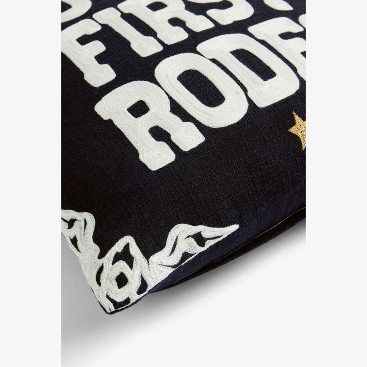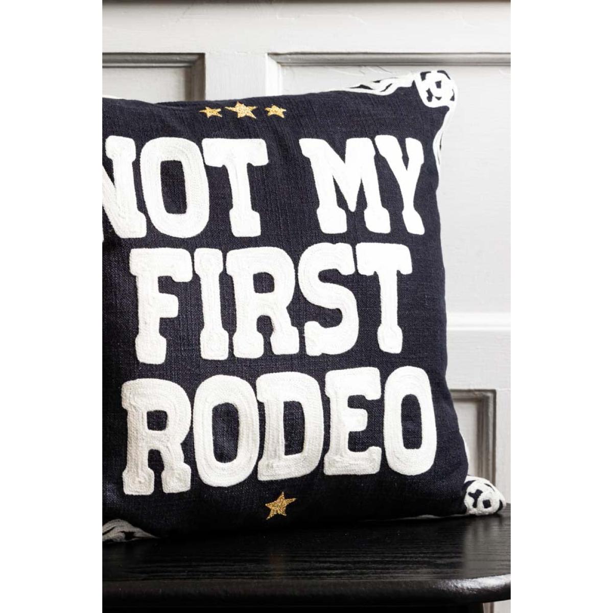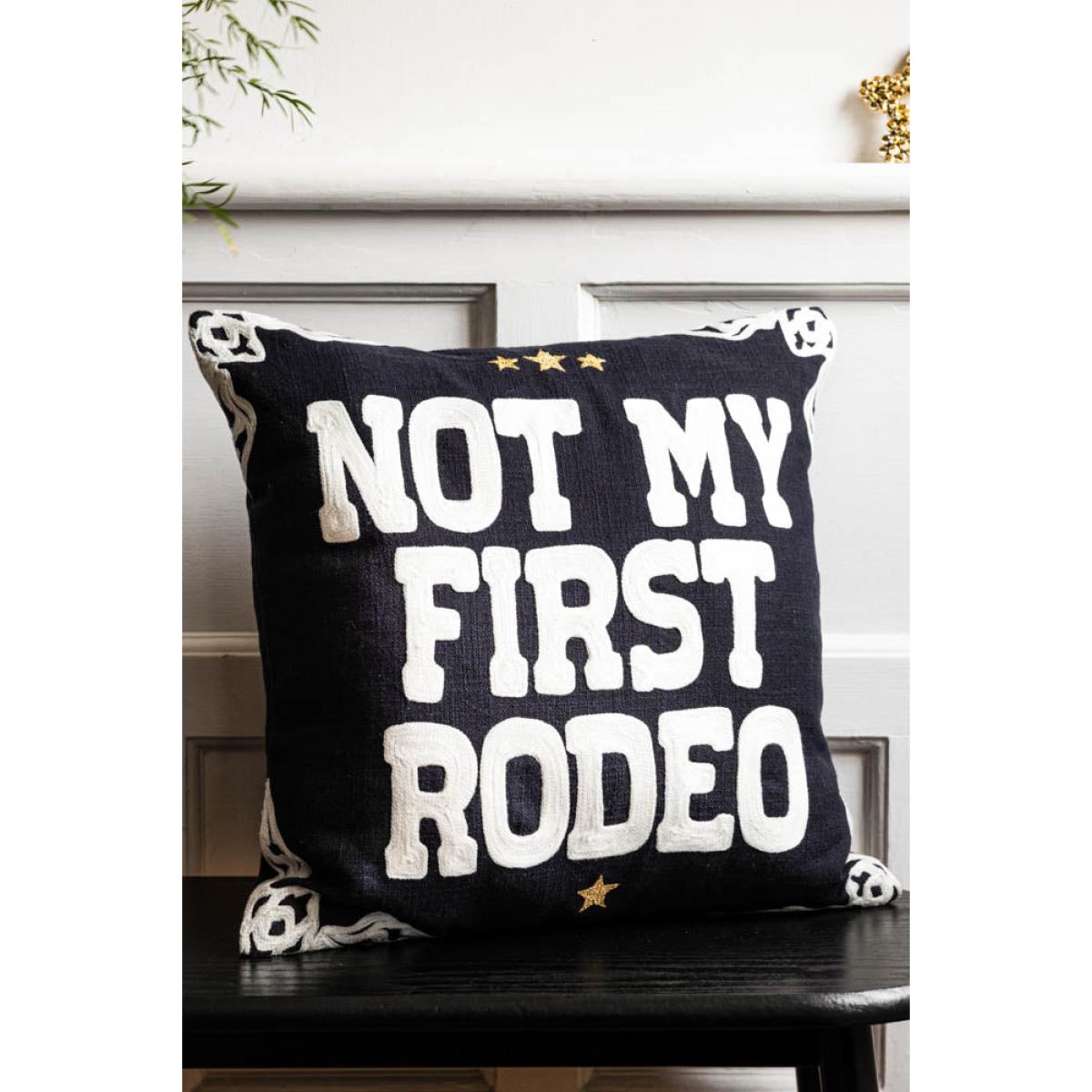 <!--td --> Yeehaw, but make it chic. Our Not My First Rodeo Embroidered Cushion is here to bring a little cowboy cool to your space. With bold, capital letters embroidered front and centre, this chair cushion says it loud and proud – because this definitely isn’t your first time wrangling good style. Framed with intricate white embroidery inspired by classic cowboy boot detailing, it’s all about that luxe Western vibe. And let’s not forget the stars – three golden beauties sit above the text and one shining below. The monochrome colour palette keeps things minimal, while the detailed design brings the drama – perfect for anyone who adores a bit of cowgirl chic. Toss it amongst your other sofa cushions, bed or accent chair for an instant style upgrade. Rodeo ready? Always. - Not My First Rodeo Embroidered Cushion - Measures: W45cm x H45cm - Material: Cotton - Sponge Clean Only- Polyester Filled
