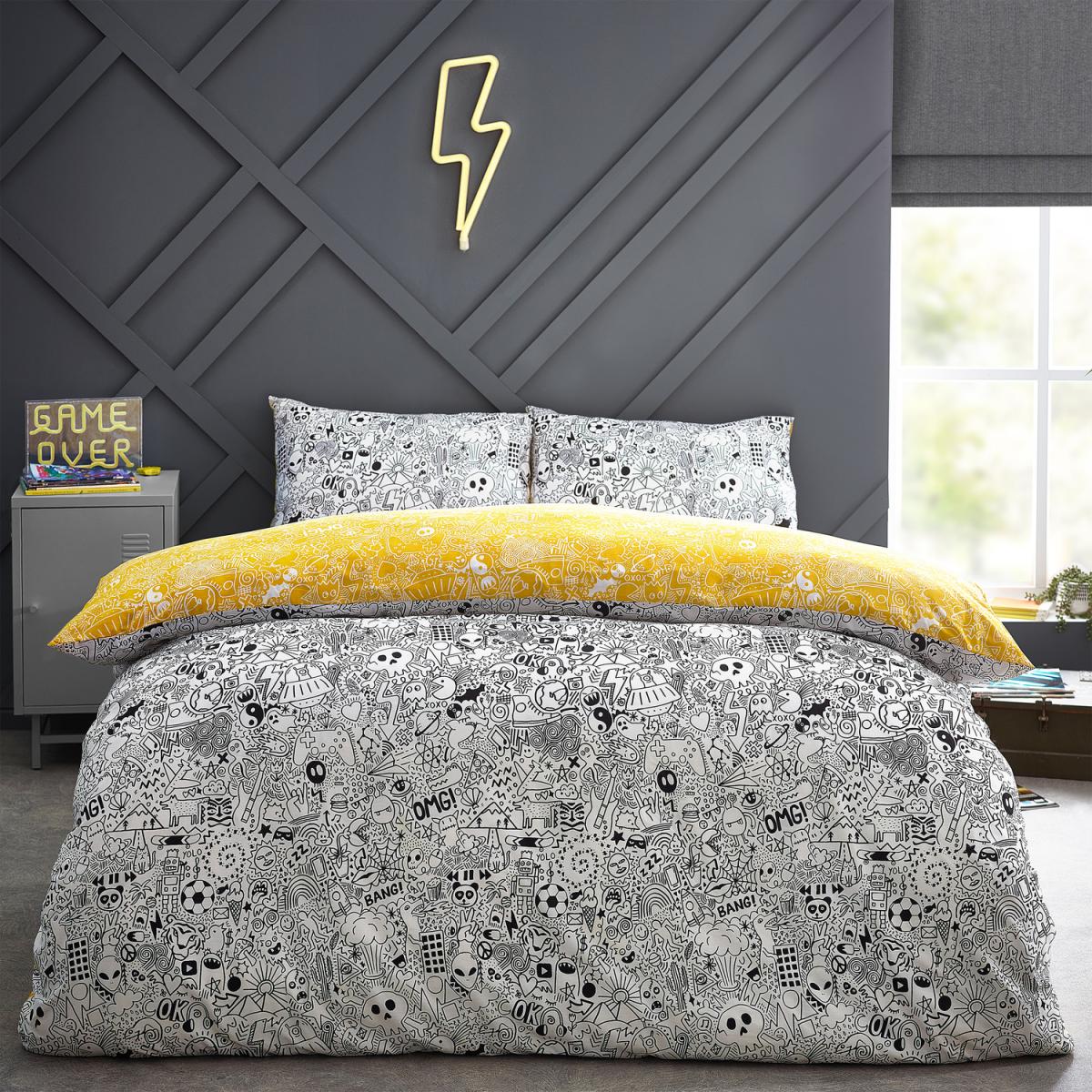 Express your creativity with this doodle duvet set. Featuring exciting notebook doodles of aliens, monsters, and spaceships. The excitement continues to the reverse a coordinating design on a yellow base so you can switch the look when you need to.