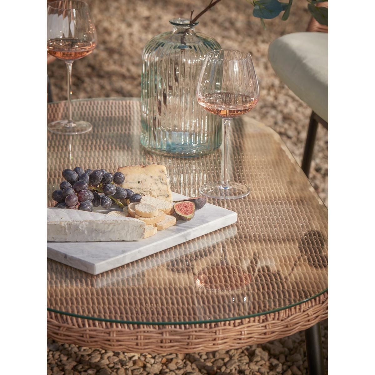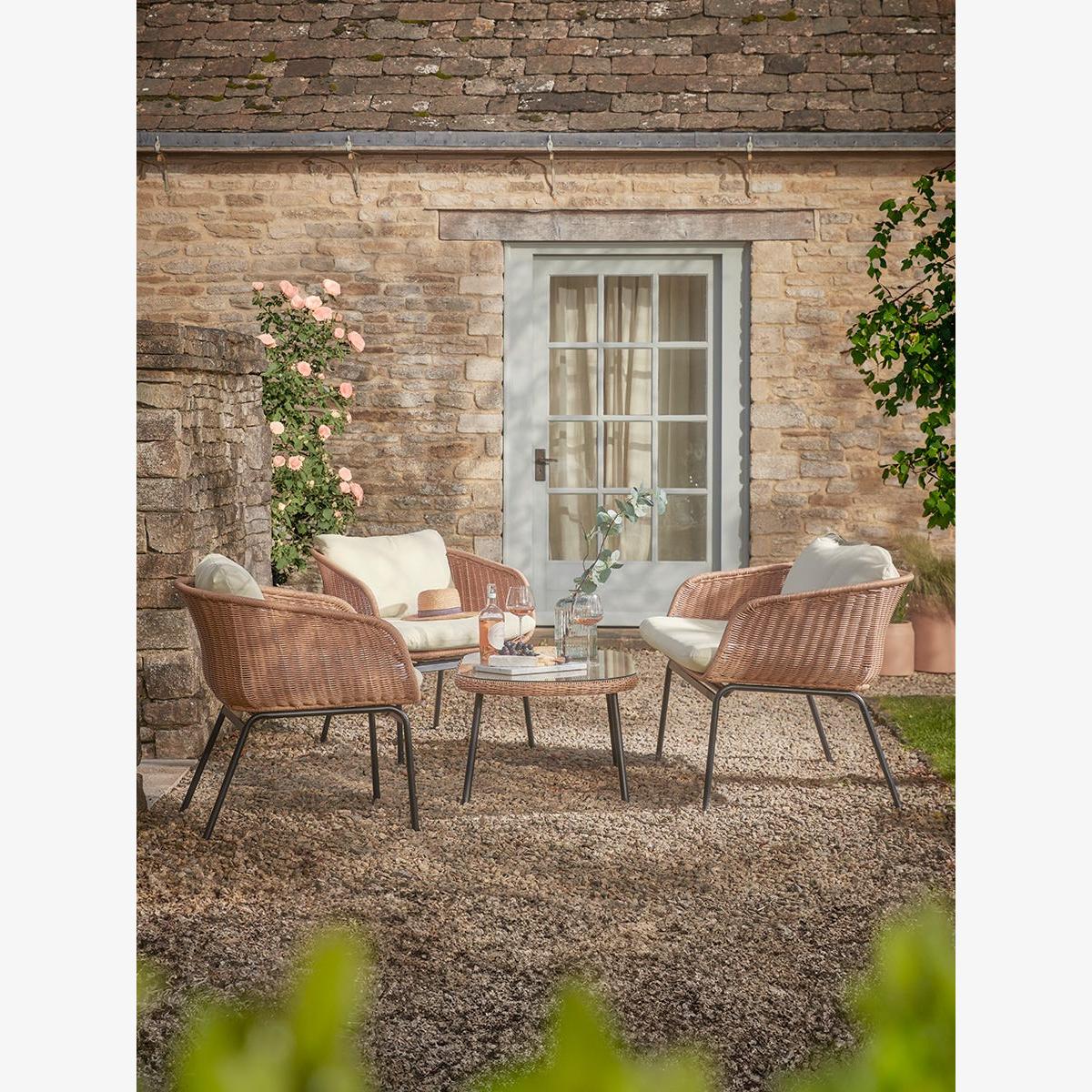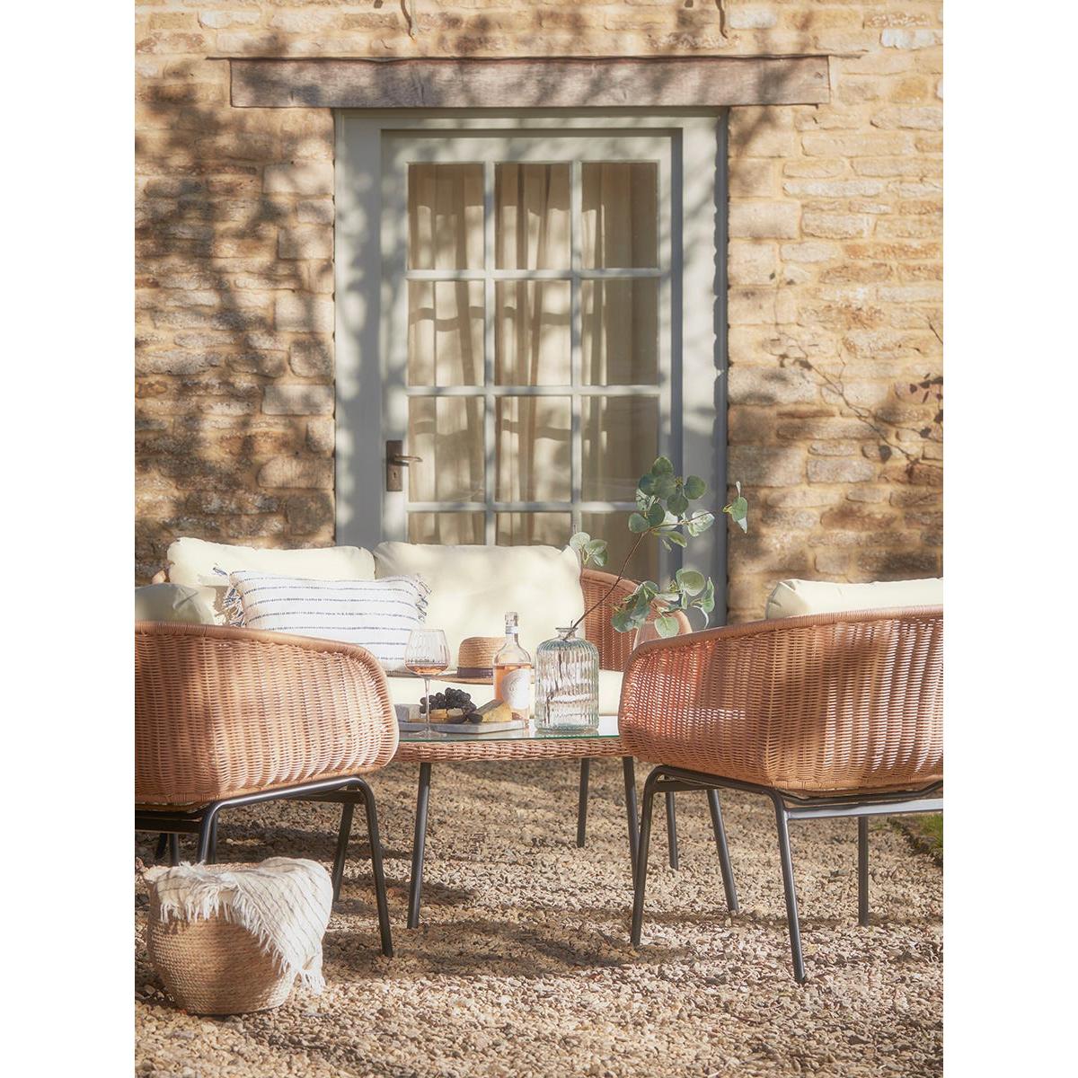 Our Noto Lounge set has a lighter contemporary silhouette inspired by traditional wicker garden furniture that will sit confidently in most outdoor settings. The multi-toned faux wicker seats offer impressive authenticity and are set on slender black legs. Additional comfort is offered through coordinating seat and back cushions which are water repellent and UV resistant. The set includes an outdoor sofa and two armchairs and a matching glass topped coffee table, making it a sociable arrangement for coffee with friends and evening drinks. Browse our useful Outdoor Furniture Buying Guide.