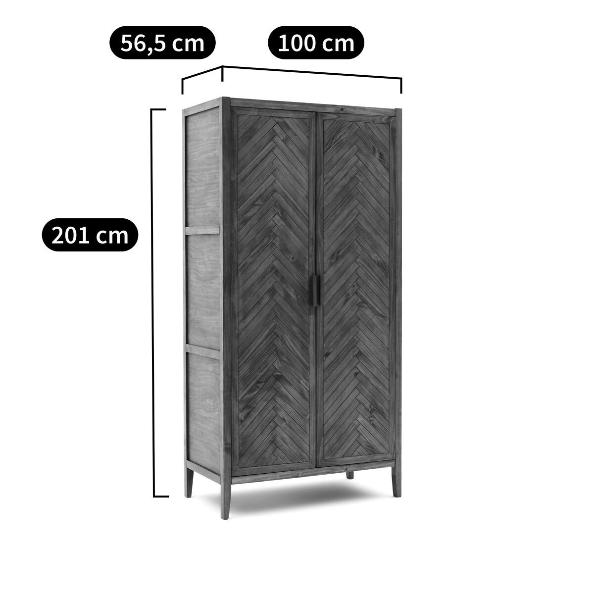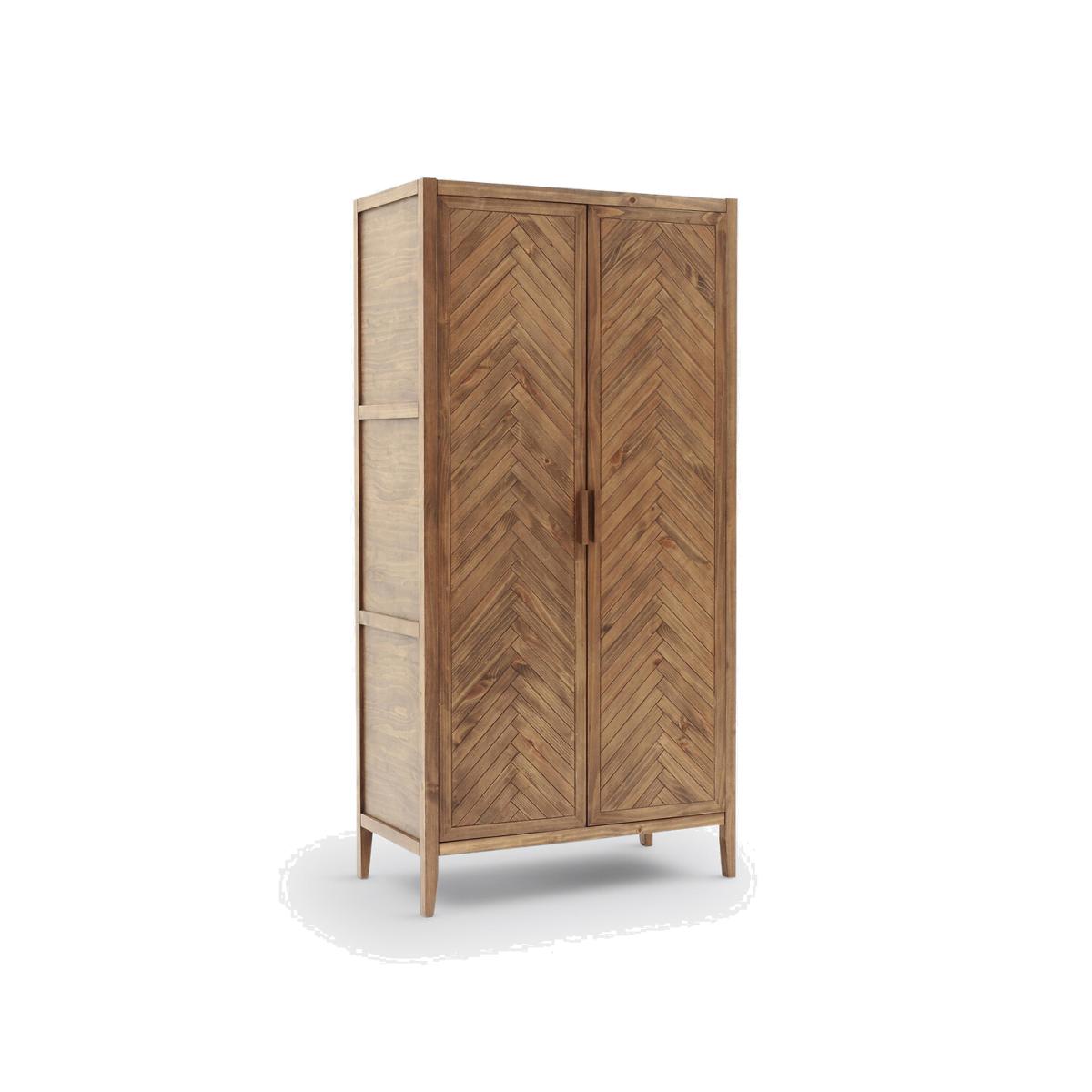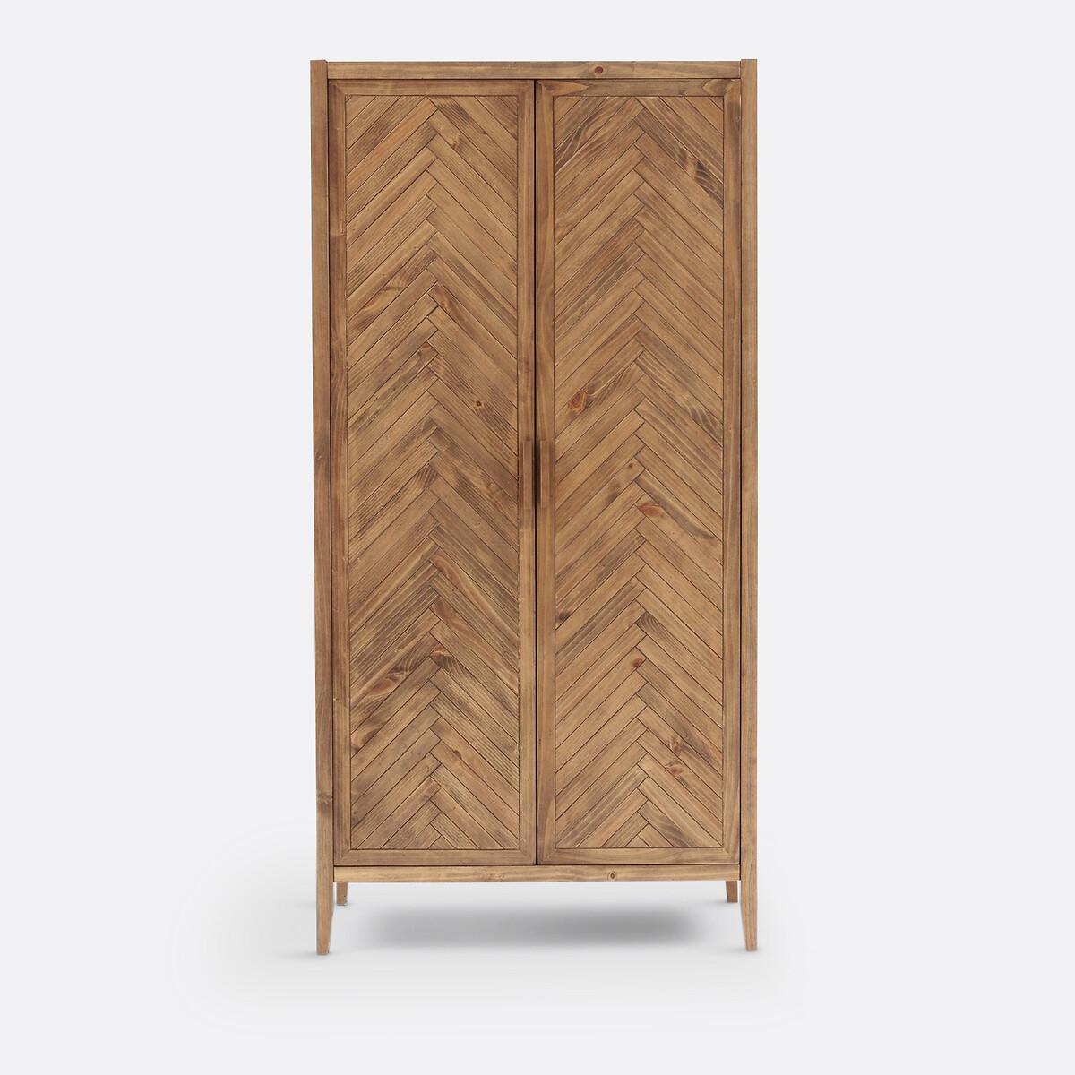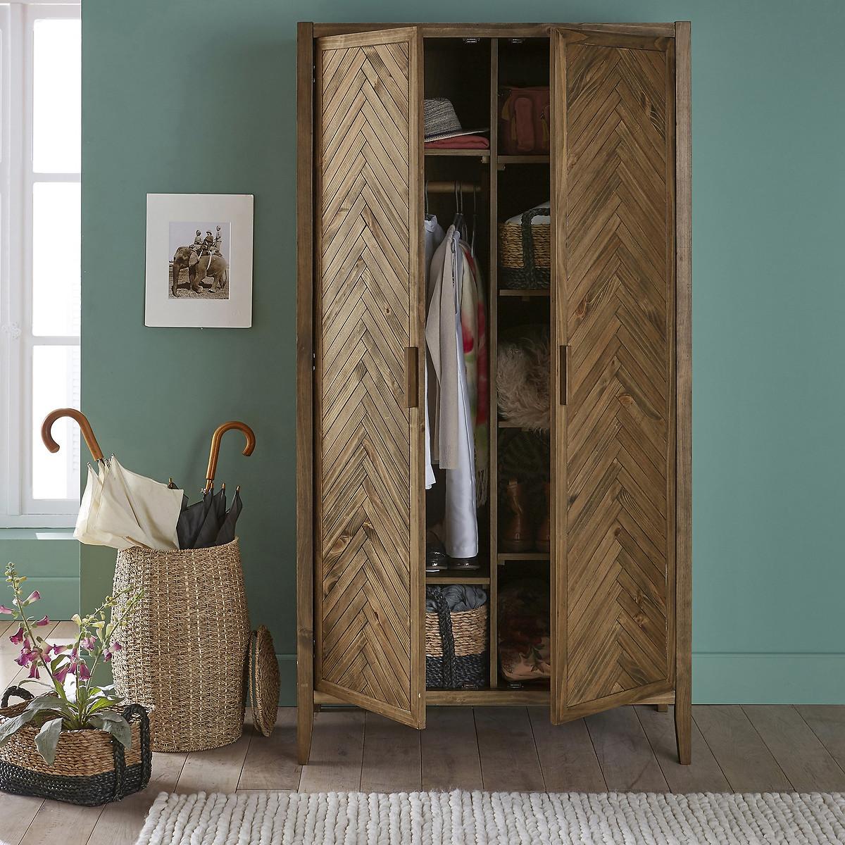 Nottingham 2-door wardrobe. A classic and timeless design in waxed solid pine revisited in the style of herringbone parquet for a warm style. A helpful storage space, consisting of a half wardrobe and several shelves. Product Details • On the left: 1 hanging bar and 2 fixed shelves • On the right: 2 fixed shelves, 2 adjustable shelves • Height of hanging section: 115cm • Herringbone parquet drawers • FSC® certified wood. Dimensions • Width: 100cm • Height: 201cm • Depth: 56.5cmDelivery:. This product required assembly. Available for home delivery. Note! Please check that all access points are large enough to accommodate your delivery (doors, stairs, lifts). • WOOD FROM SUSTAINABLY MANAGED FORESTS. FSC® certified wood comes from forests that are environmentally, socially and economically well managed. Parcel dimensions and weight:2 parcels • L219 x H11.5 x D117cm, 54kg • L193 x H14 x D63cm, 36kg