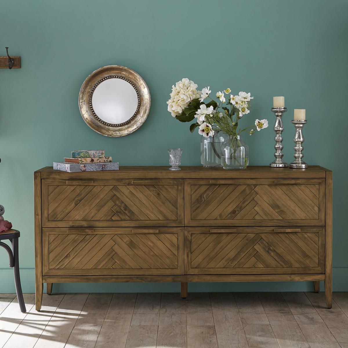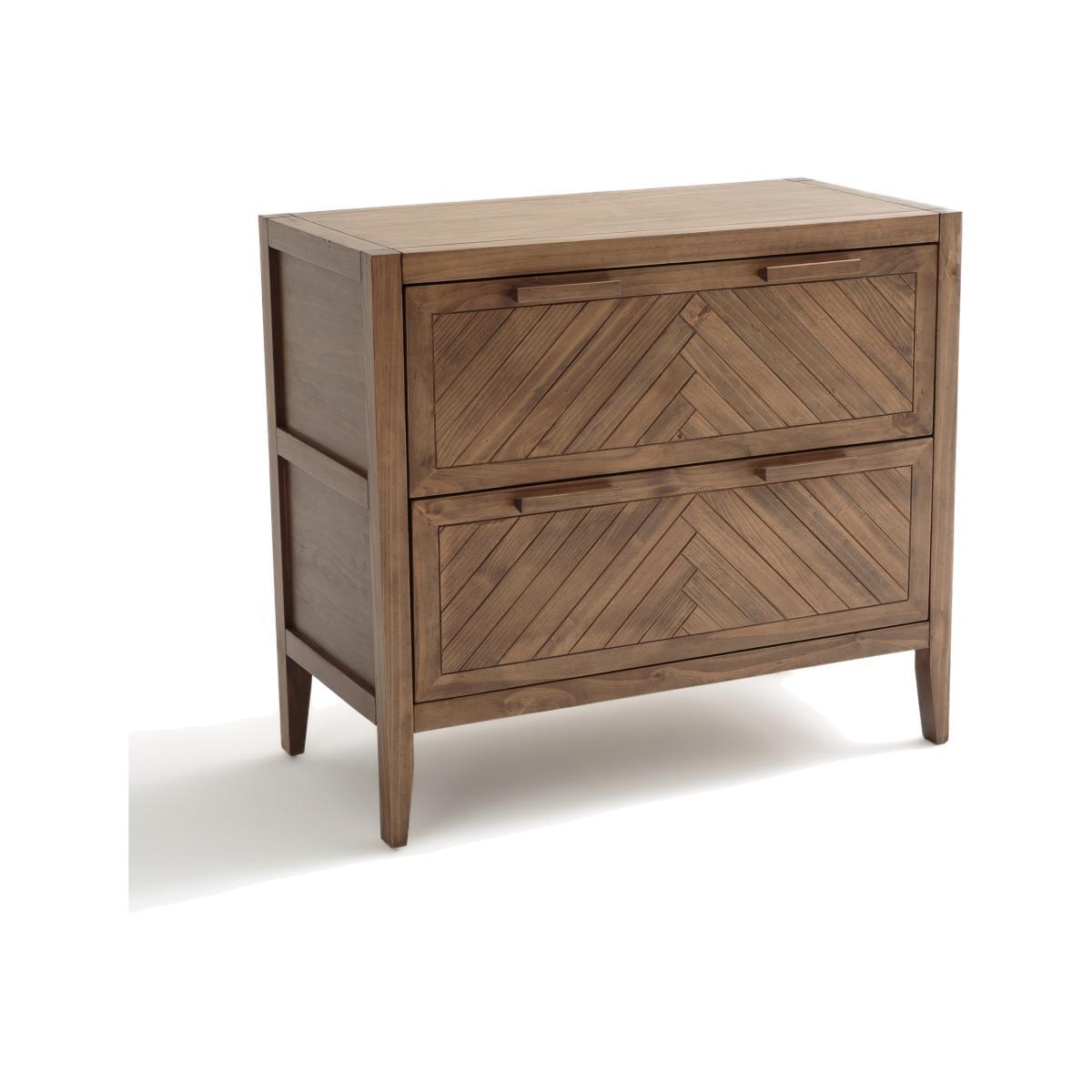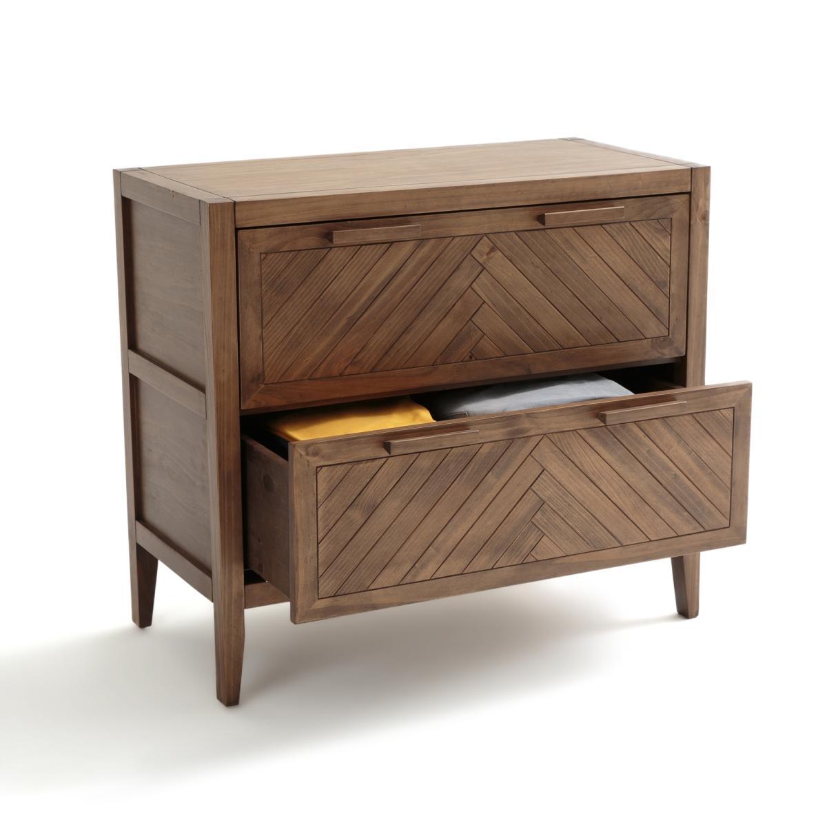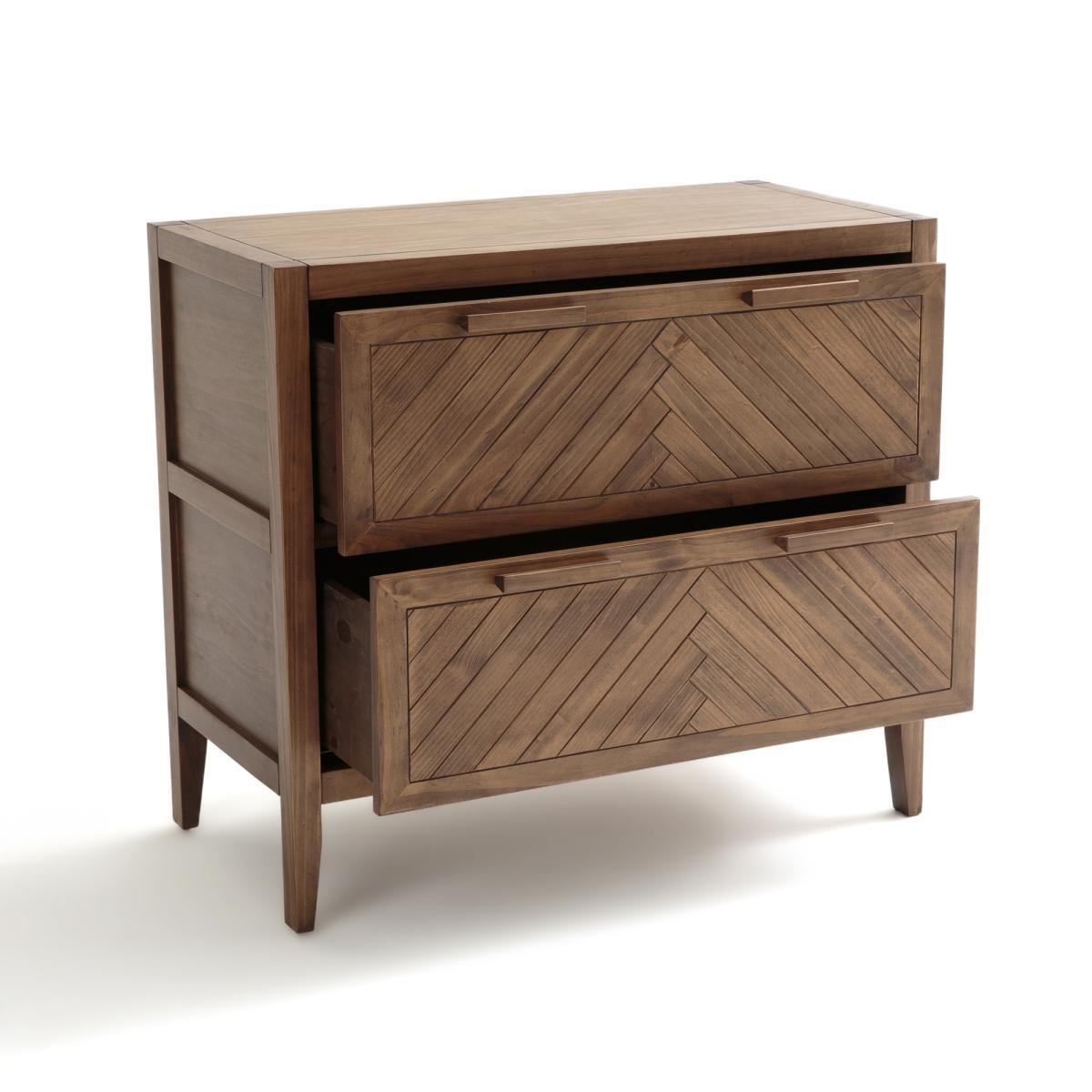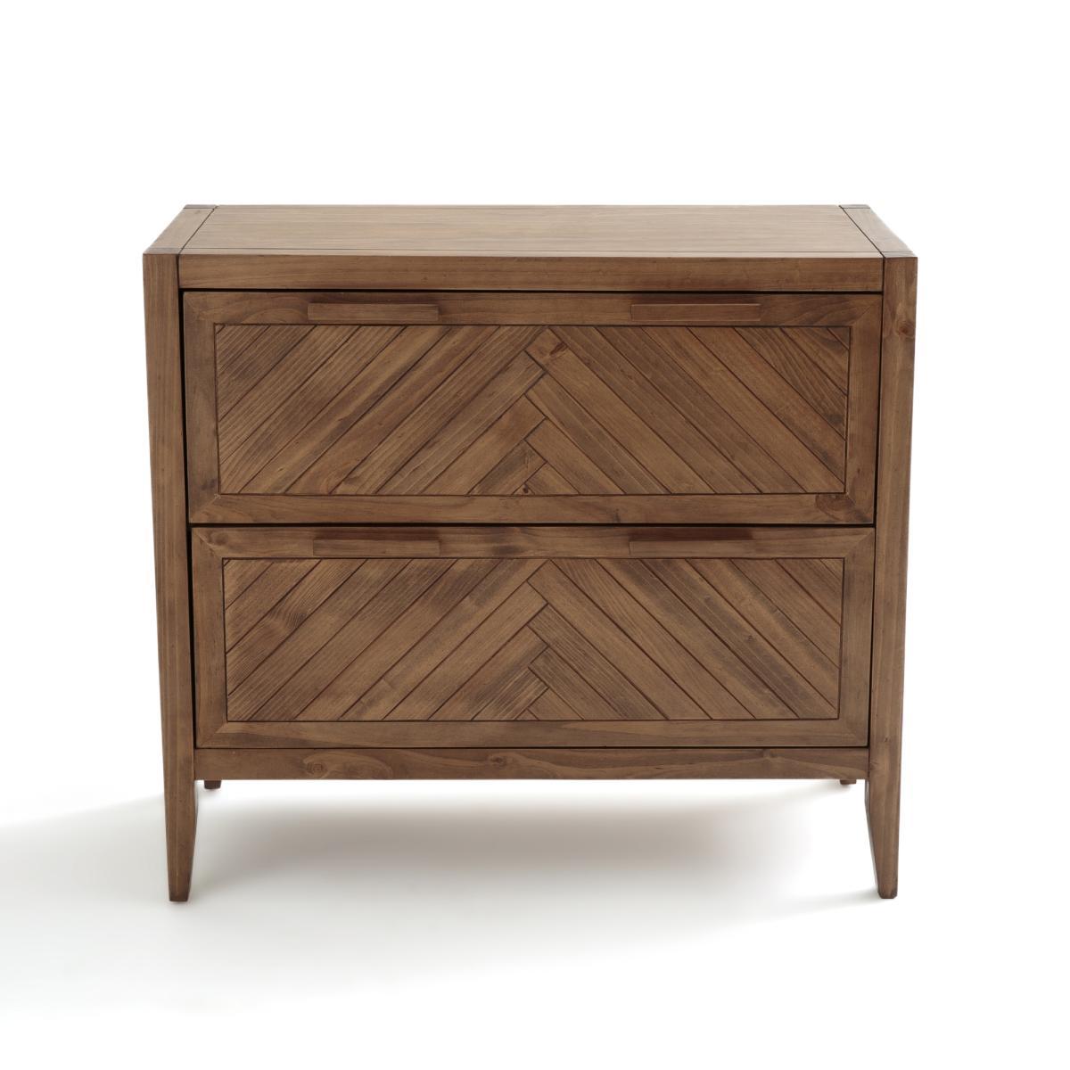 This resplendent pine chest of drawers is stylishly designed with herringbone parquet panels. 2 large drawers offer plenty of storage, and with clean lines and a warm look, it’s an exquisite, natural piece that will make your home look beautiful. Team it up with the other items from the Nottingham range.