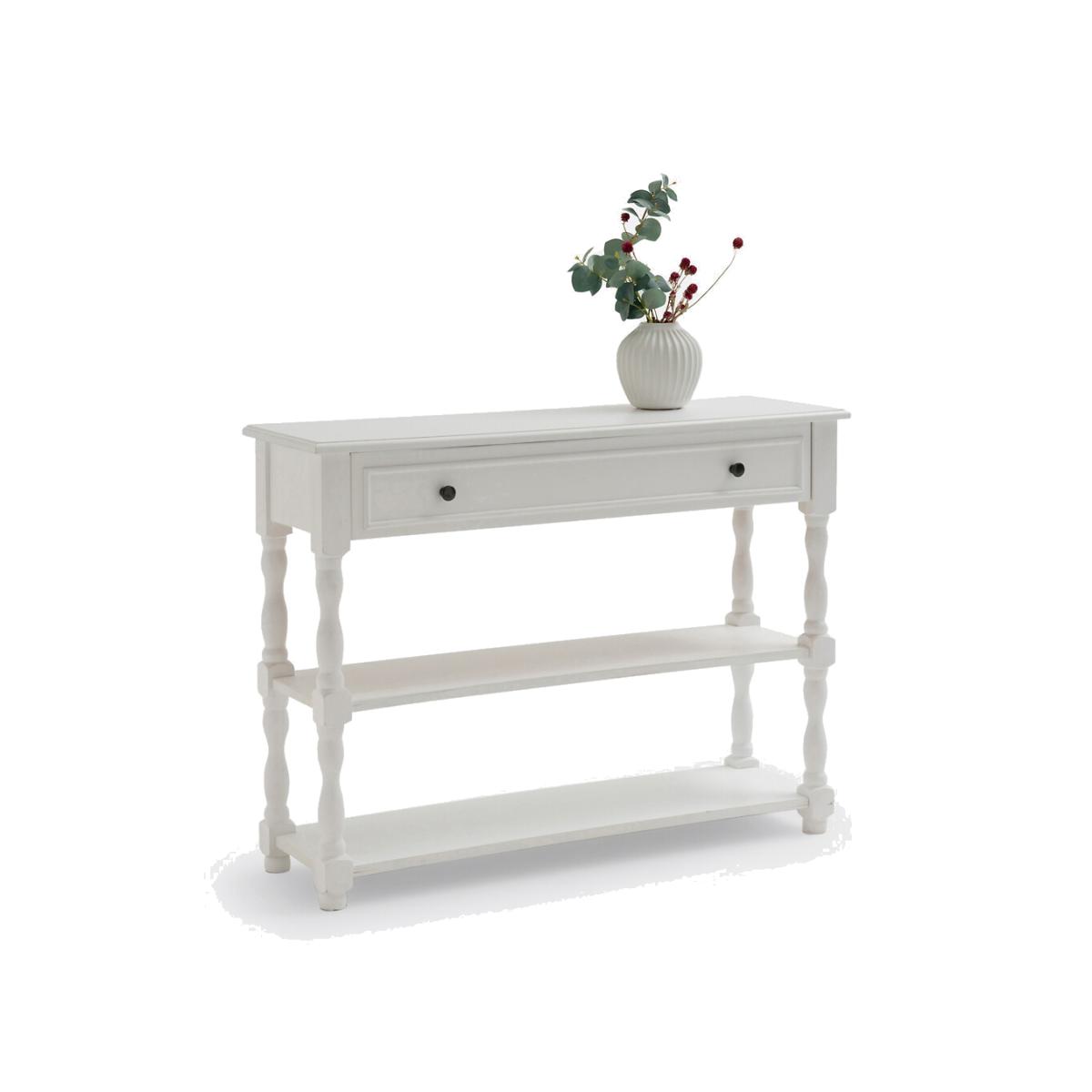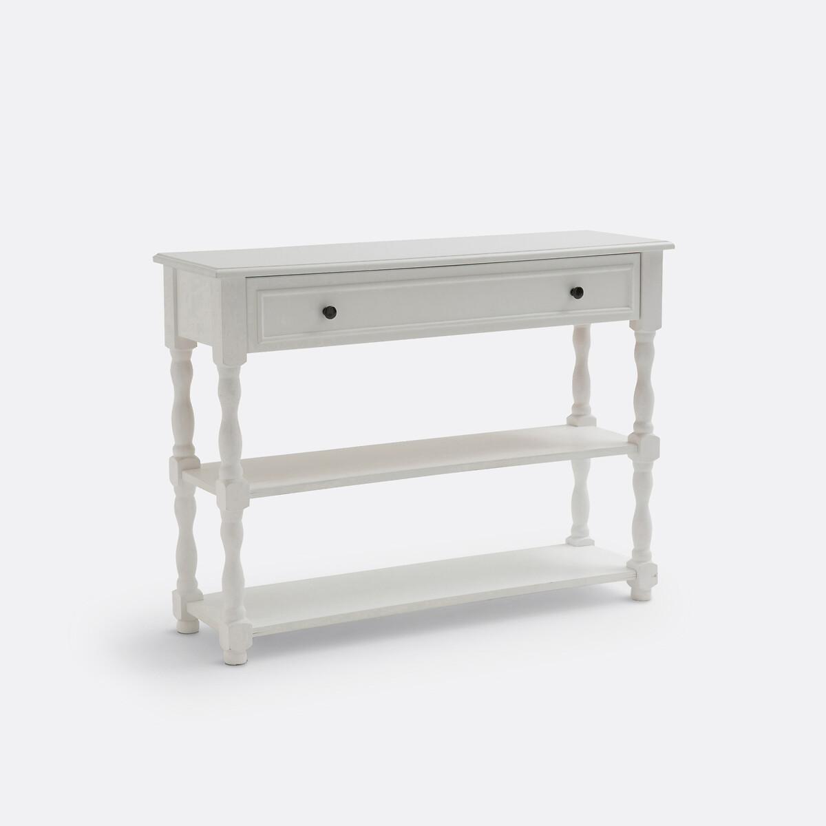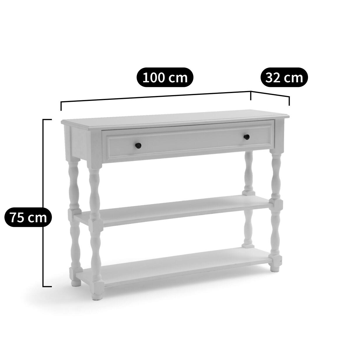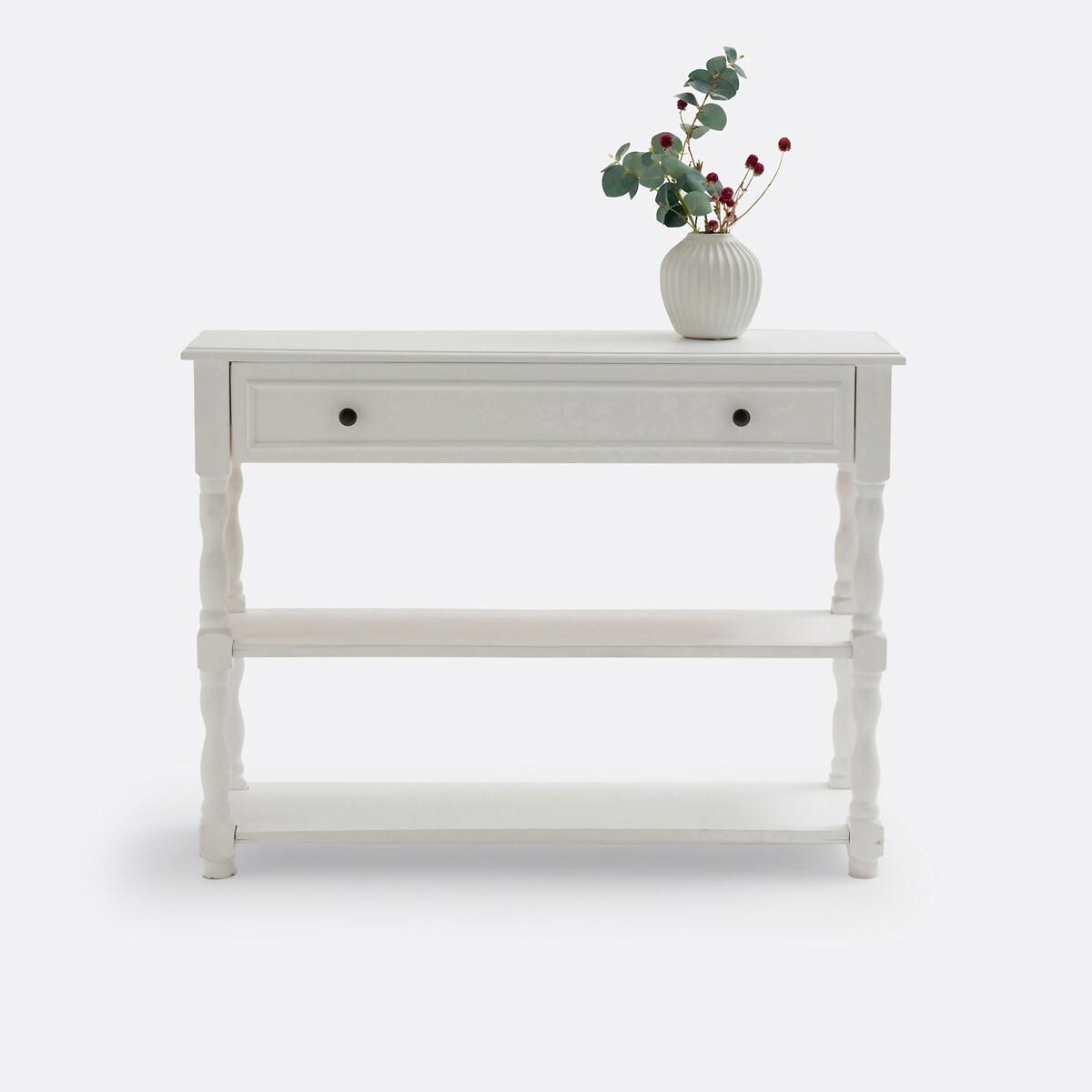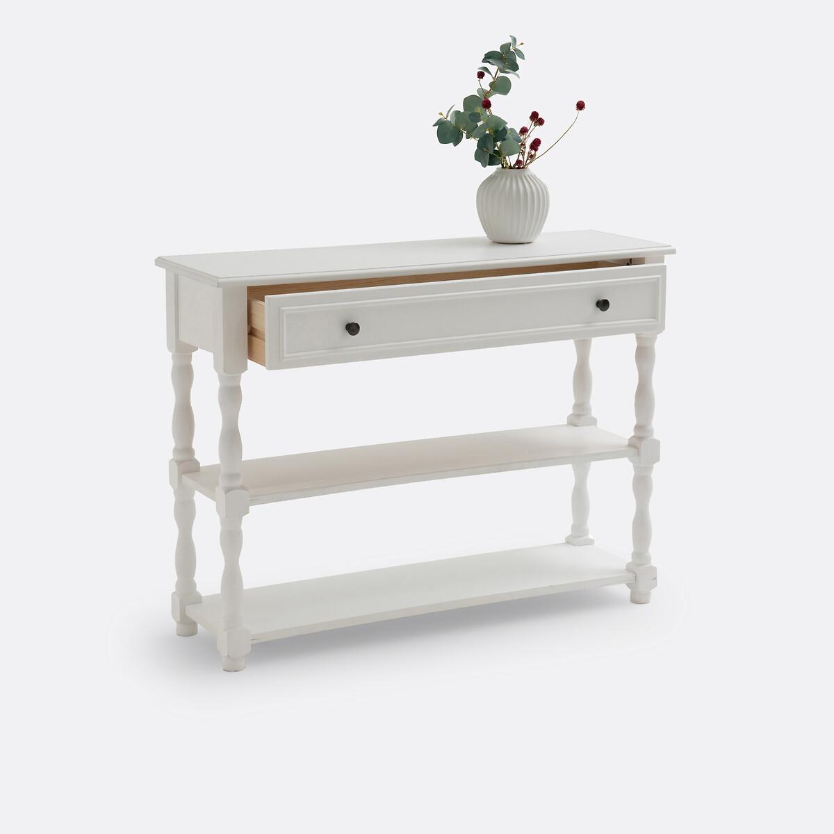 Timeless, the Nottingham console is distinguished by the elegance of its turned legs. For storage it has 2 drawers and 2 shelves. Beautiful and functional. Designed by La Redoute Interiors. Product Details • MDF painted white, nitrocellulose varnish. • 2 shelves and 2 drawers • Solid pine turned legs • Black steel handlesDimensions. Overall • Width: 100cm • Height: 75cm • Depth: 32cm. Usable space • Shelves : L95 x D27cm • Height between shelves: 25cm • Drawers : L82 x H8 x D21cmDelivery:. This product is sold ready to assemble. Note! Please check that all access points are large enough to accommodate your delivery (doors, stairs, lifts). • Made in Europe. Dimensions and weight of parcel1 parcel • L111 x H15.5 x D38.5cm. 25kg
