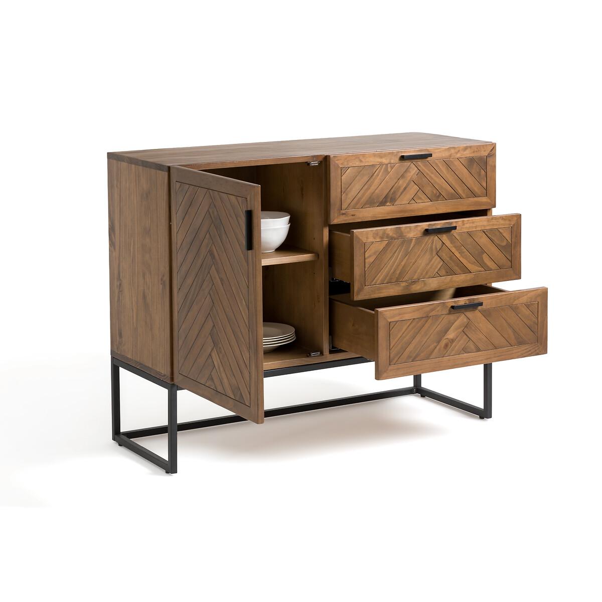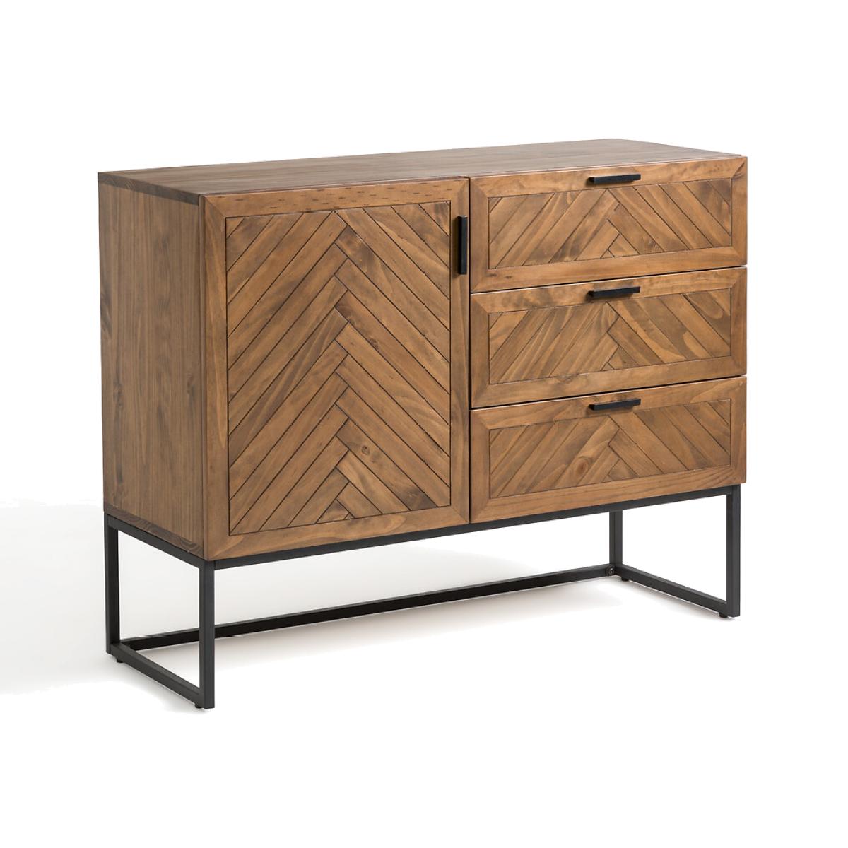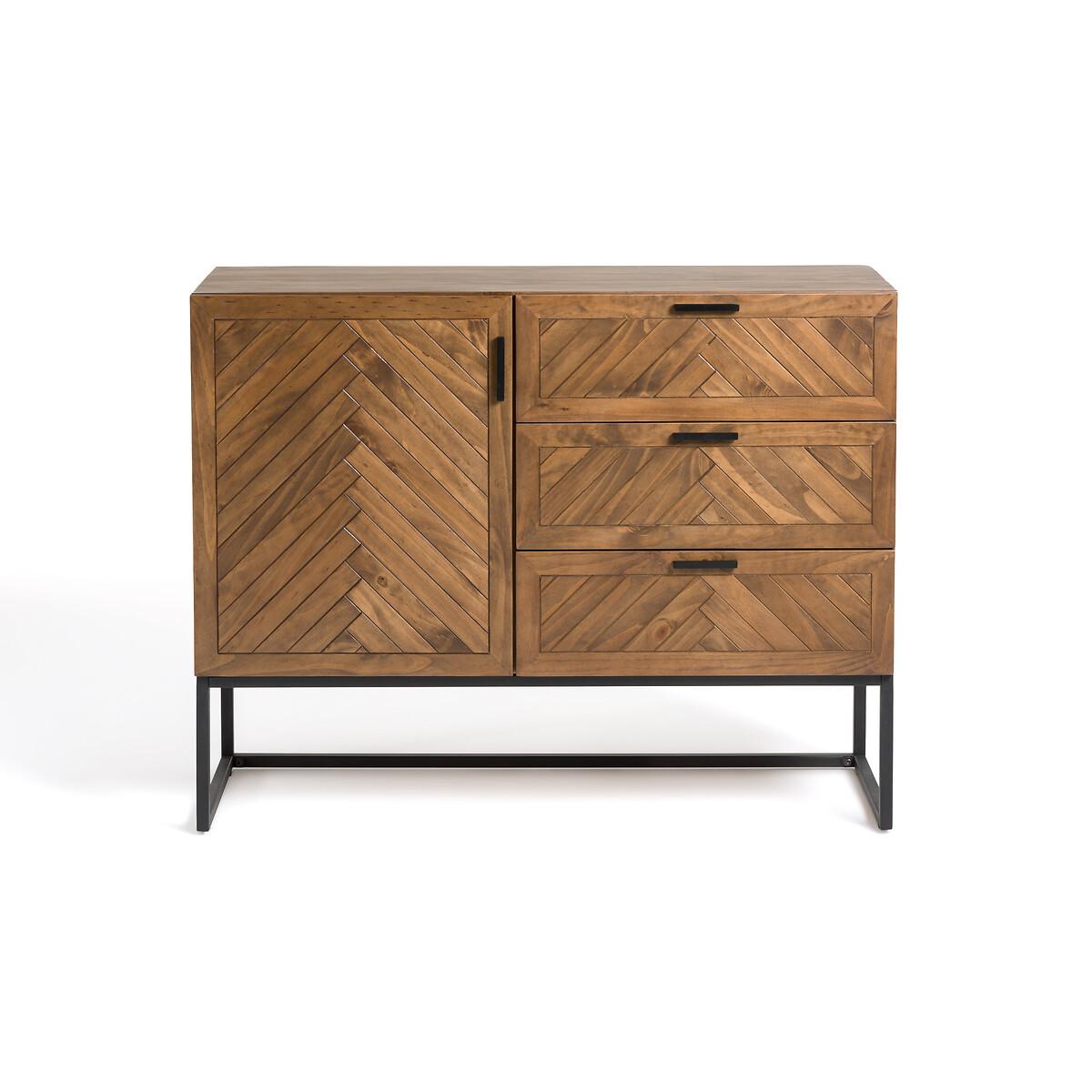A classic and reassuring line in waxed solid pine revisited in the style of herringbone parquet. With its 2 compartments hidden behind the door and its 3 drawers, the Nottingham sideboard offers great storage capacity in a warm and authentic style. A signature design by La Redoute Interiors. Product Details • 1 door, 2 compartments, 3 drawers • Pre-assembled pedestal and removable and adjustable shelf in pine veneered MDF • Solid pine door and drawers with "herringbone parquet" type marquetry • Waxed finish • Soft-closing door hinges and drawer slides • Base in matt black lacquered steel, epoxy finish • Pine handles, painted matte black • Adjustable plastic feet • Sold with feet to be attachedDimensions. Overall • Width: 109cm • Height: 85cm • Depth: 43.5cm • Height of legs: 25cm. Usable space • Compartment (without shelf):L46.5 x H56 x D37cm • Drawers : L48 x H12 x D32cm Parcel dimensions and weight1 parcel • L118.7 x H71 x D51.5cm. 54kg