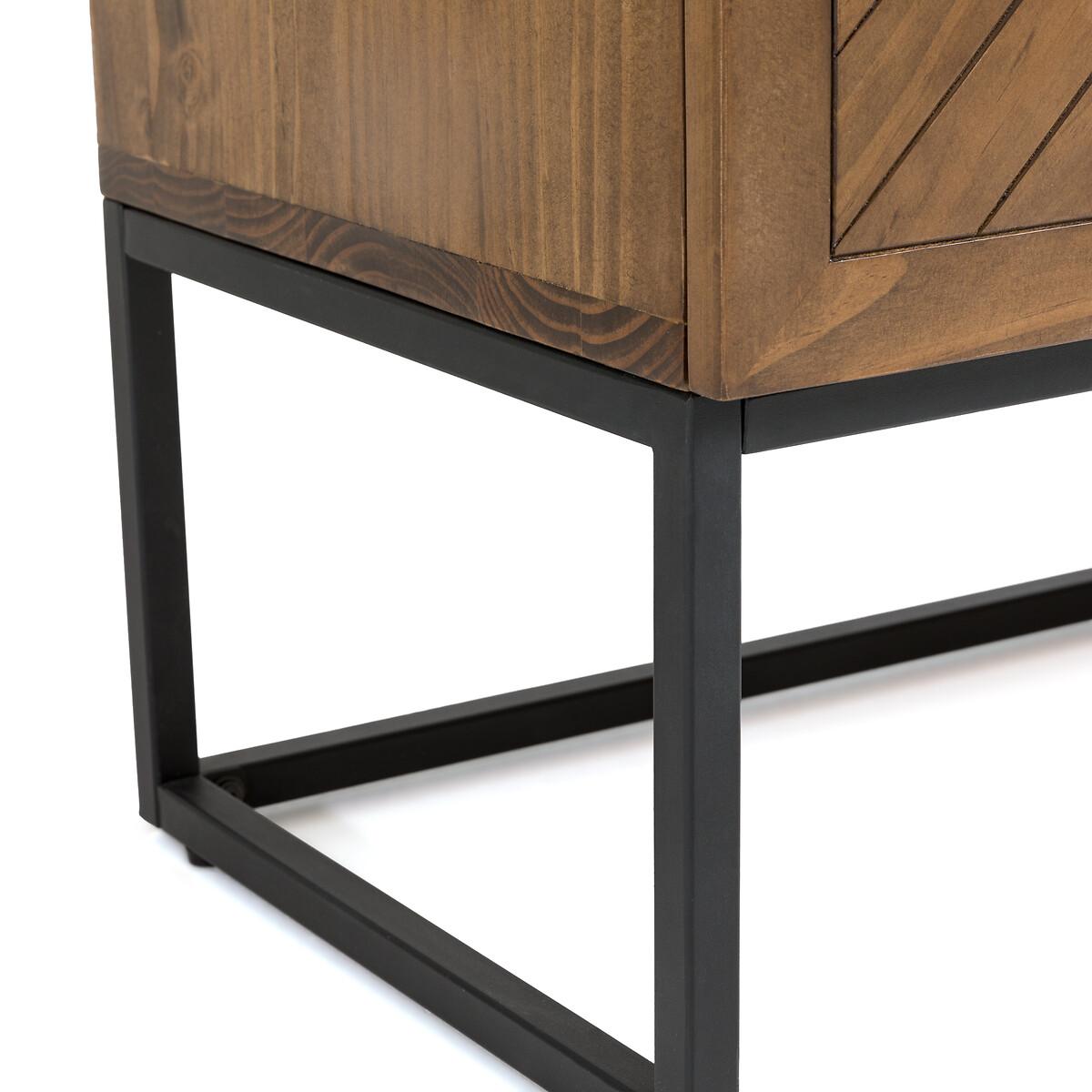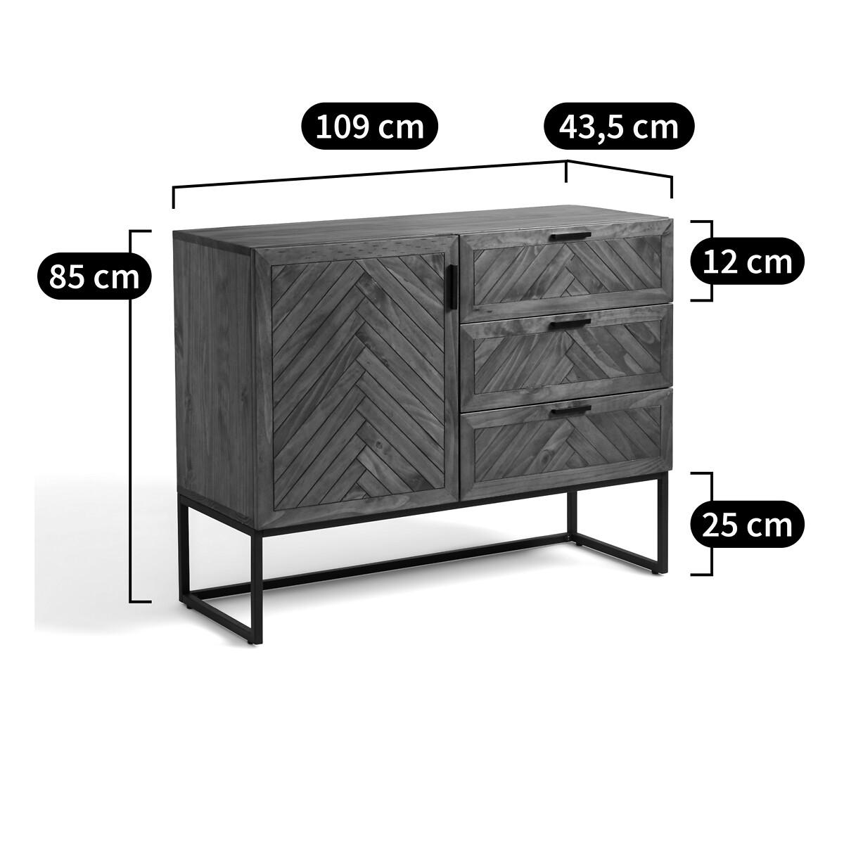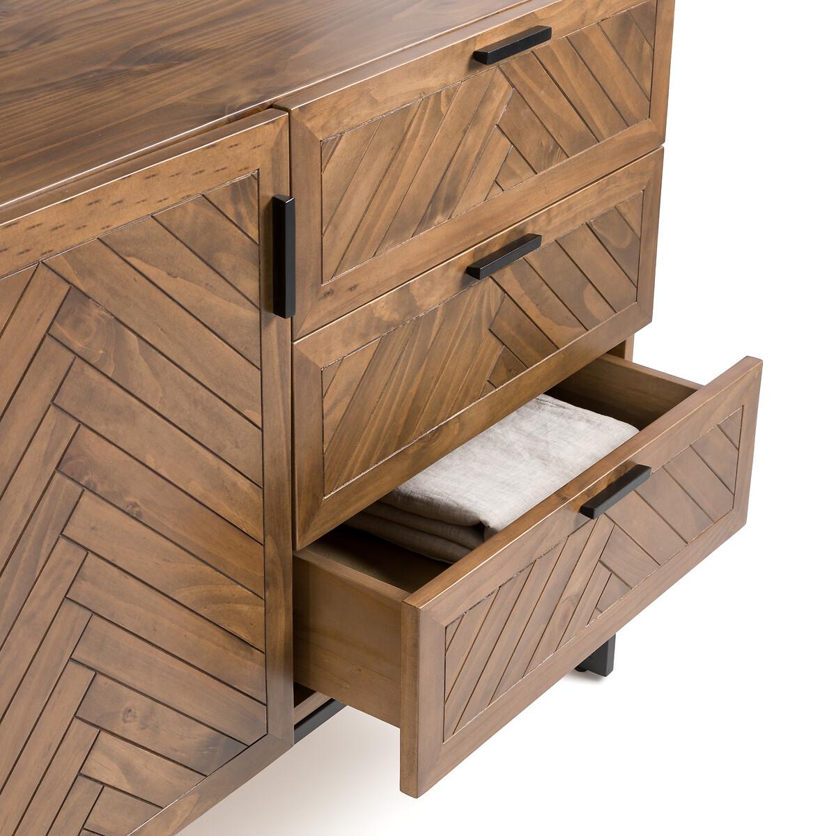 A classic and reassuring line in waxed solid pine revisited in the style of herringbone parquet. With its 2 compartments hidden behind the door and its 3 drawers, the Nottingham sideboard offers great storage capacity in a warm and authentic style. A signature design by La Redoute Interiors. Product Details • 1 door, 2 compartments, 3 drawers • Pre-assembled pedestal and removable and adjustable shelf in pine veneered MDF • Solid pine door and drawers with "herringbone parquet" type marquetry • Waxed finish • Soft-closing door hinges and drawer slides • Base in matt black lacquered steel, epoxy finish • Pine handles, painted matte black • Adjustable plastic feet • Sold with feet to be attachedDimensions. Overall • Width: 109cm • Height: 85cm • Depth: 43.5cm • Height of legs: 25cm. Usable space • Compartment (without shelf):L46.5 x H56 x D37cm • Drawers : L48 x H12 x D32cm Parcel dimensions and weight1 parcel • L118.7 x H71 x D51.5cm. 54kg