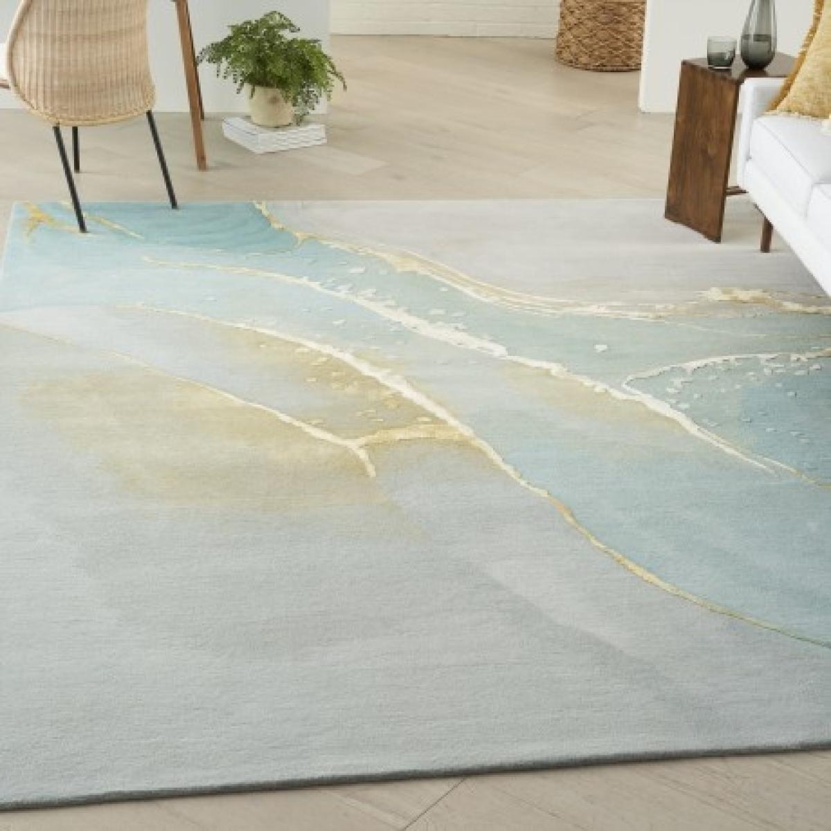 Evoke a sense of calm with this modern rug from the Prismatic Collection. Abstract ripples of grey and blue are accented by swirls of gold that seemingly radiates from its softly hued ground. Hand carved for an added sense of depth, its a standout foundation for your living room or bedroom decor. This handmade rug is crafted from a fabulously textured blend of New Zealand wool and silky Luxcelle. Material: 50% new zealand wool, 50% luxcelle Product Type: Hand Tufted Pile Height: 12mm All screens vary in colour reproduction and whilst every effort has been made to display the colour as accurately as possible it is for guidance only.