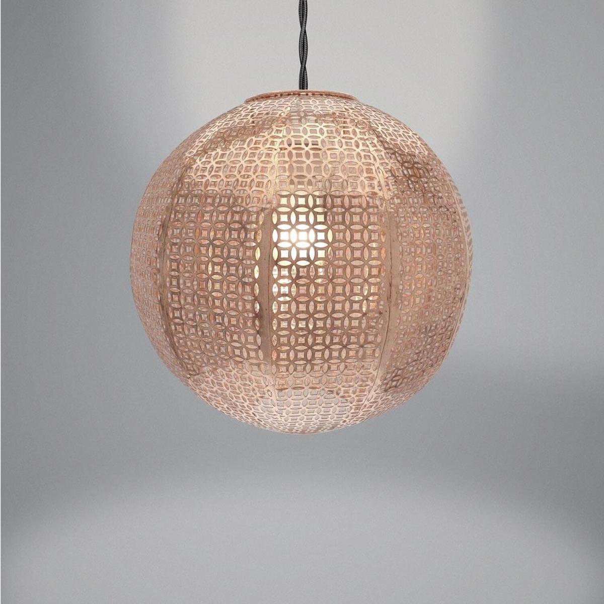 I love the copper finish of this ceiling light; it adds warmth and a touch of modern sophistication to a variety of interiors. The Nouveau Cadiz ball design works particularly well in contemporary spaces, where it can serve as a statement piece, or in eclectic interiors that mix textures and finishes. For practical styling, consider hanging it in a dining room or above a kitchen island to create a focal point, or use it in a living room to complement earthy tones or metallic accents. Pairing it with other copper or brass accessories can really enhance the cohesive look, and its perforated pattern allows for interesting light play, making it both functional and visually appealing.