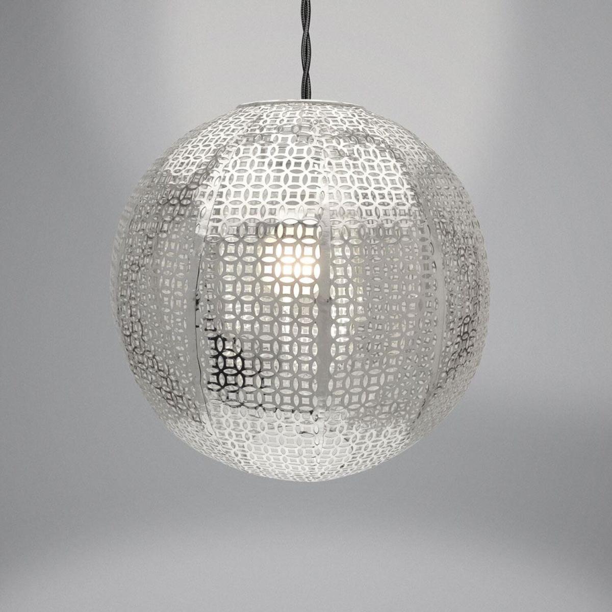 I love this silver ball light fitting for its modern yet playful design, making it an eye-catching feature without overwhelming a space. Its spherical shape paired with the geometric pattern lends itself well to contemporary interiors, especially in living rooms or dining areas that could benefit from a statement piece. It's versatile enough to work in a minimalist setting when paired with neutral tones, or within a more Eclectic space where its reflective surface can bounce light and add visual interest. Practical styling tips include using it above a dining table or in a centrepiece grouping with other metallic accents, and ensuring the surrounding decor is kept relatively simple to let the fitting be the star. Its silver finish also means it pairs well with colour schemes ranging from monochrome to bold hues, adding a sleek finish to various design styles.