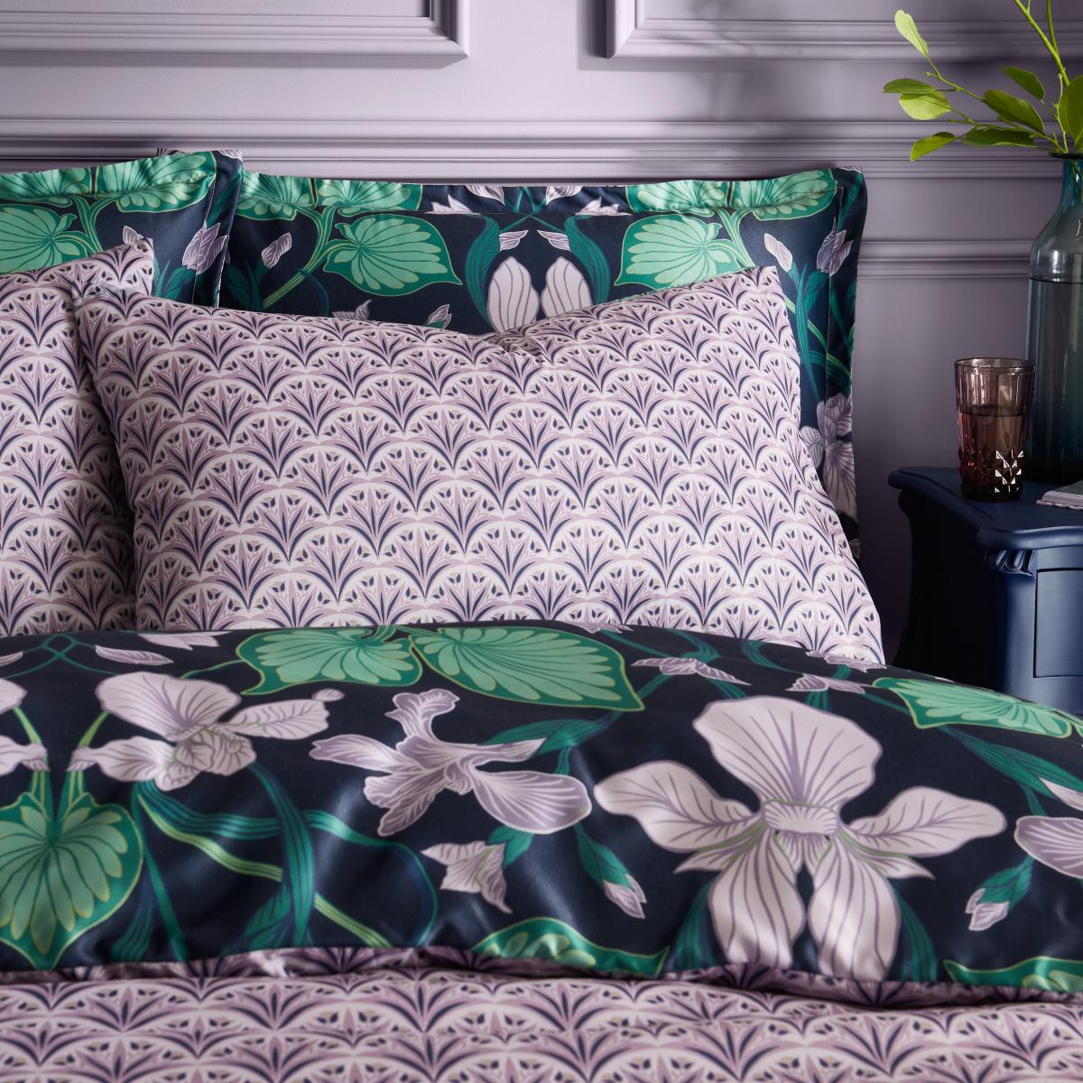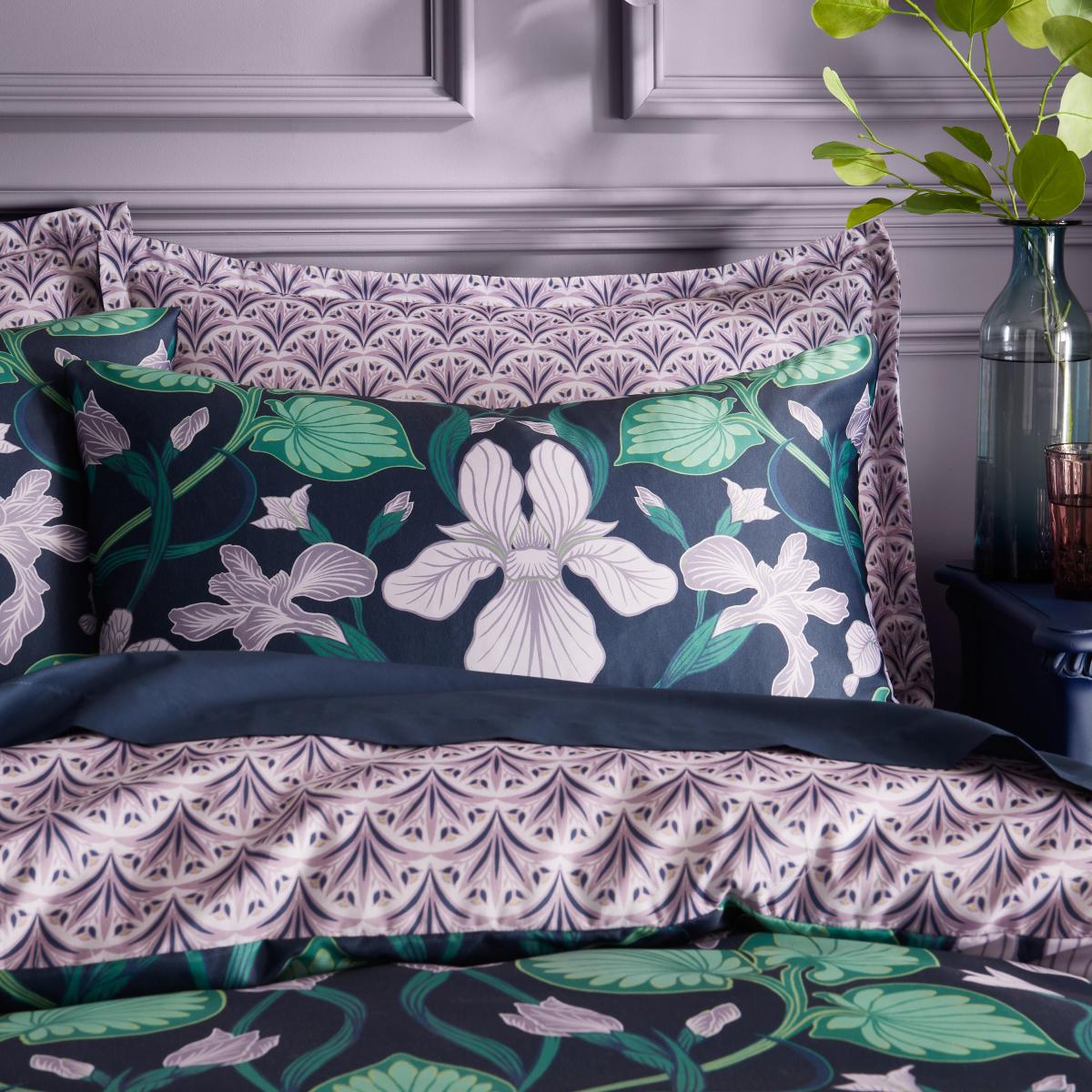 * Soft matt satin composition* Art deco design* Button closure* Machine washable* Corresponding items sold separately Elevate your bedroom with the Nouveau Iris bedding range, featuring a luxurious matt satin face and a soft reverse. The opulent design showcases intricate iris motifs and swirling leaves on a striking navy background, reminiscent of the art nouveau movement. Made from easy-care polyester, this bedding is soft, durable, and easy to maintain. The set includes a duvet cover and pillowcase with a button closure, ensuring minimal ironing and more time for relaxation. This collection is verified by OEKO-TEX and independently tested for harmful substances as well as manufactured using sustainable processes under socially responsible working conditions.