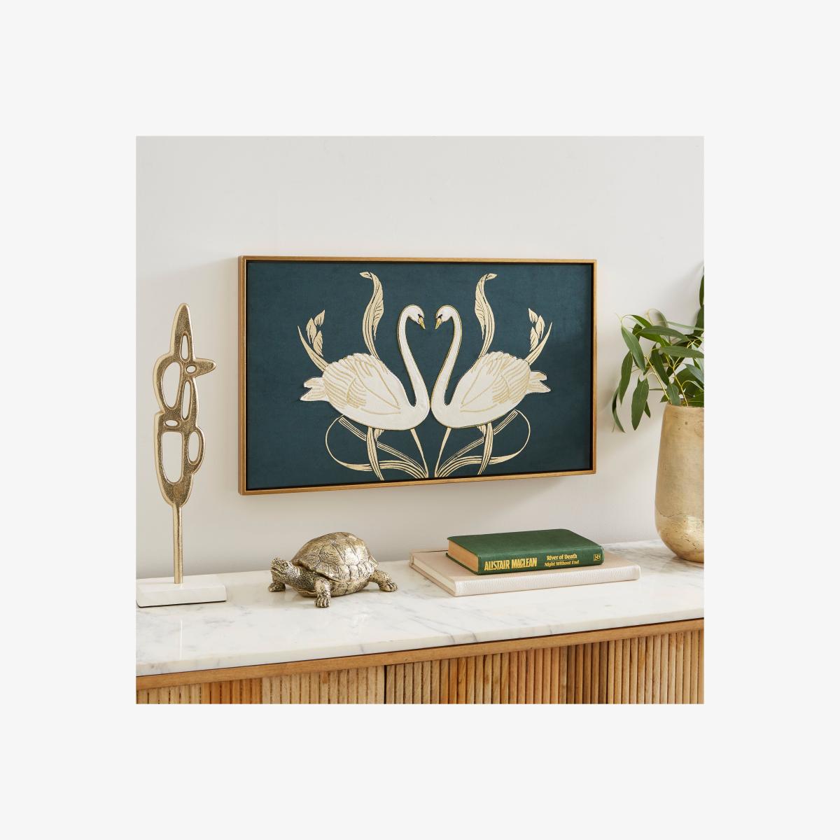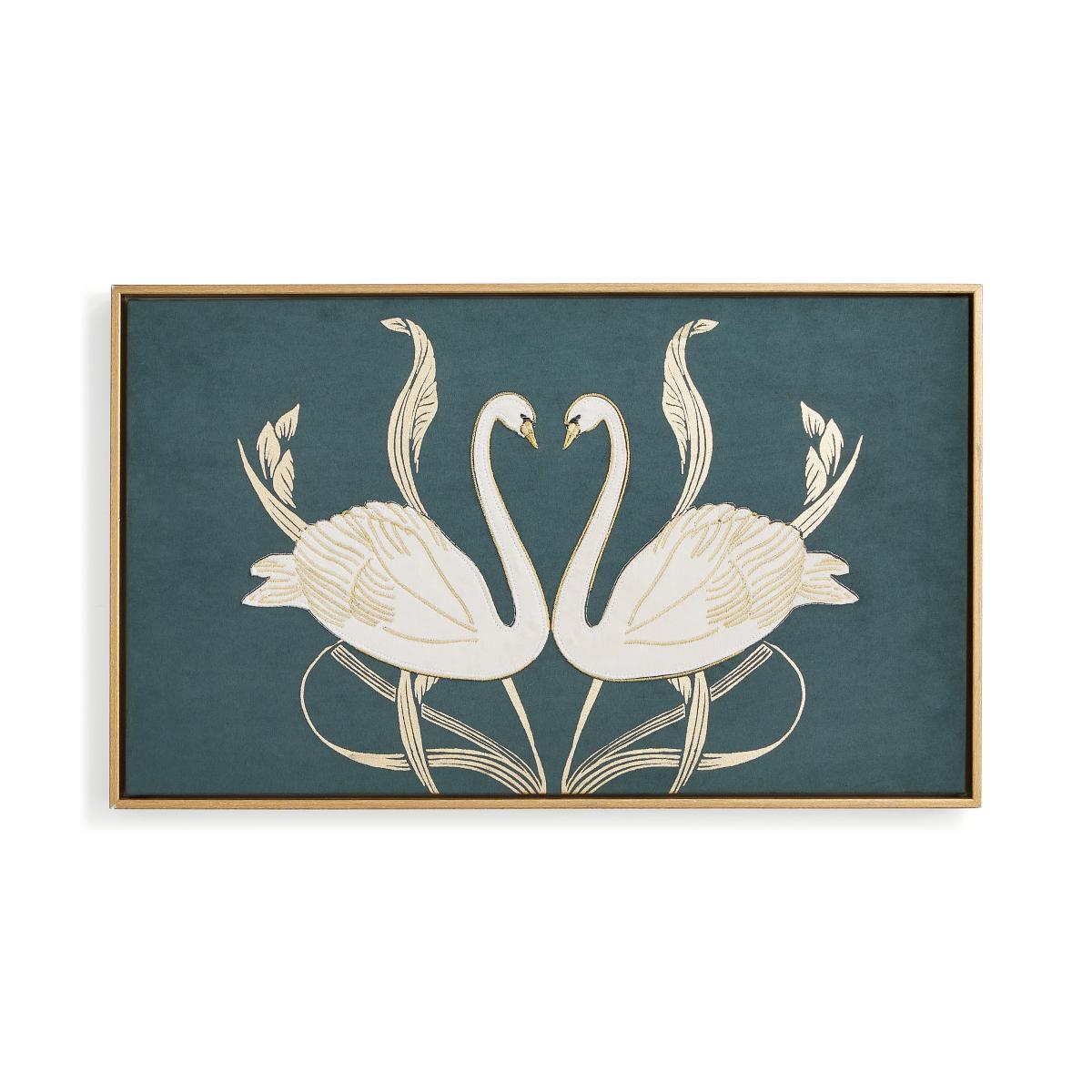 * Classic, art nouveau style* Deep, rich velvet background* Gold accents and frame* Embroidered design This framed canvas features two embroidered swans in a classic art nouveau style, with flowing organic lines and metallic gold accents on a rich, deep velvet background. They are the perfect way to lend a luxe touch to your interior with unusual materials and an eye-catching design.