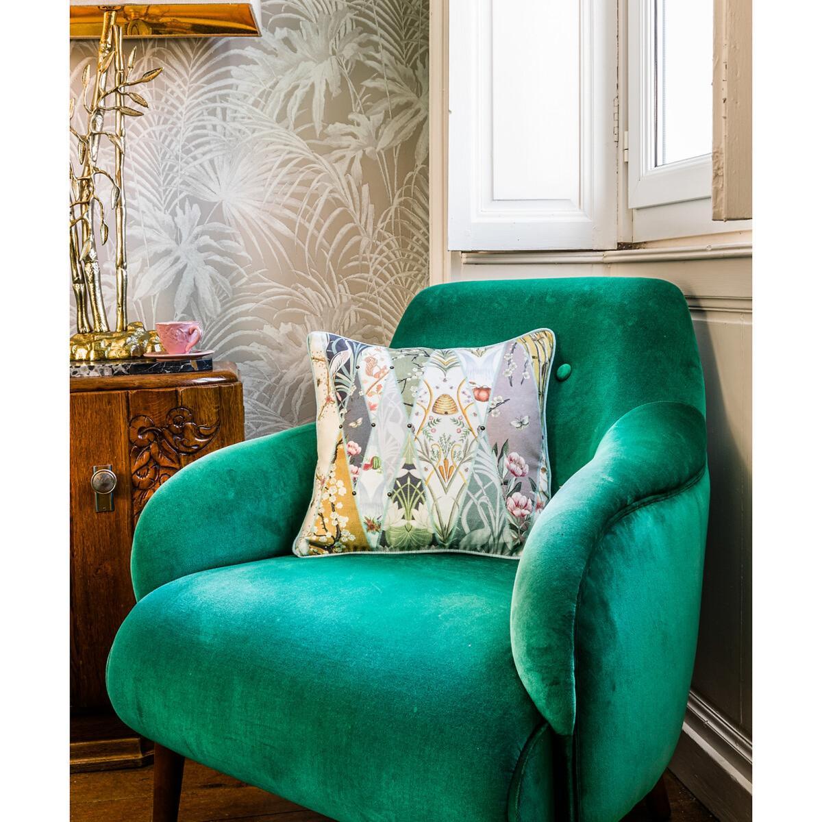 Nouveau Wallpaper Filled Cushion - Chateau de la Motte Husson is full of hidden treasures. When we first became custodians of our new home, Dick and I knew we were in for a lifetime of family treasure hunting. On my first official visit to our attic, I was rooting around, with our daughter Dorothy on my hip, and I opened the doors to a 15-ft tall armoire. I was holding my breath with excitement and was delighted to discover roll upon roll of the most beautiful wallpaper off-cuts from the designs that had adorned the walls of the Chateau since its birth. I wanted to celebrate this and share the joys of the colours and designs, so that the history lives on in many people’s memories. A piece of each of the wallpapers now resides in our very own Wallpaper Museum, cut into elegant diamond shapes and braided with love. I always say this is a script you cannot write. What are the chances of finding the entire collection of off-cuts! The Wallpaper Museum has become a favourite story on our TV series Escape the Chateau. Who could have imagined that this would open up the future to my own Chateau inspired designs? Five years on and I am proud to have a portfolio of designs big enough to re-create the Wallpaper Museum. What’s even better, is seeing the past and present come together. Product Dimensions: 43cmx43cm. Composition: Cushion Cover Face - 100% Cotton, Reverse - 60% Polyester, 40% Cotton. Cushion pad - 100% Polyester. Washing/Care Instructions: Dry Clean Only. This product will be dispatched by one of our trusted suppliers. You’ll be contacted by their selected courier about your delivery.